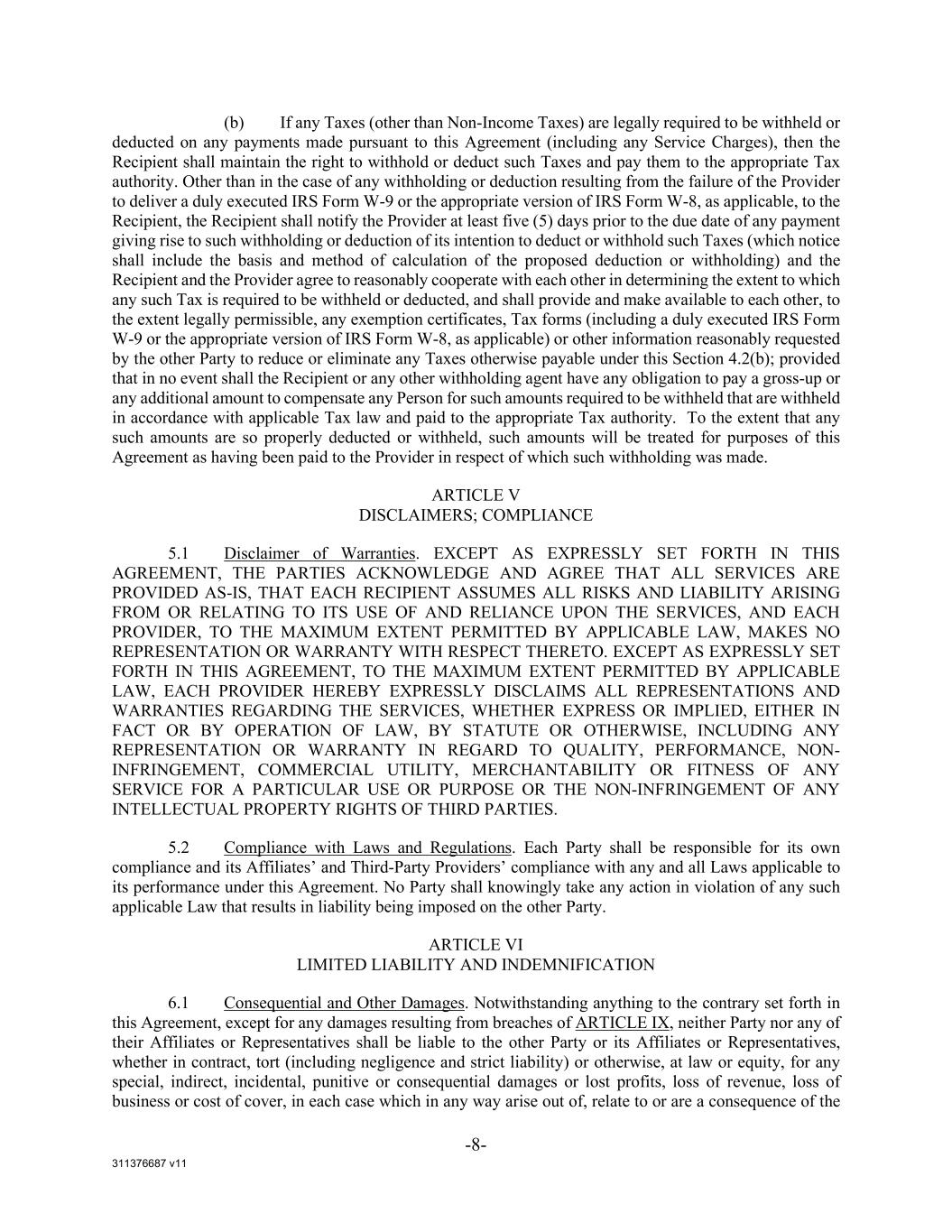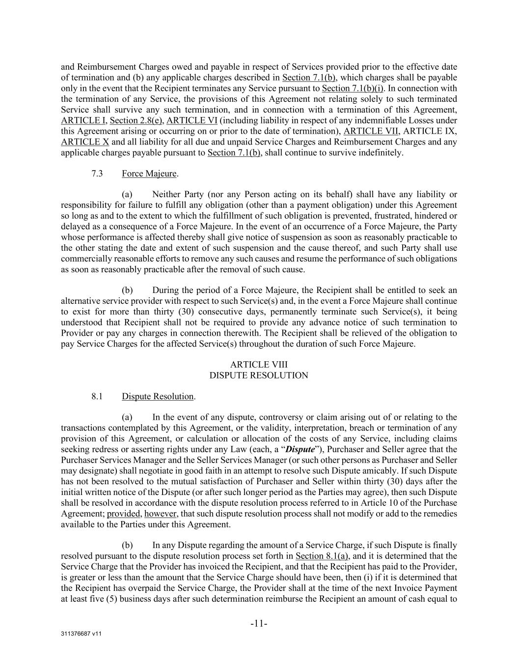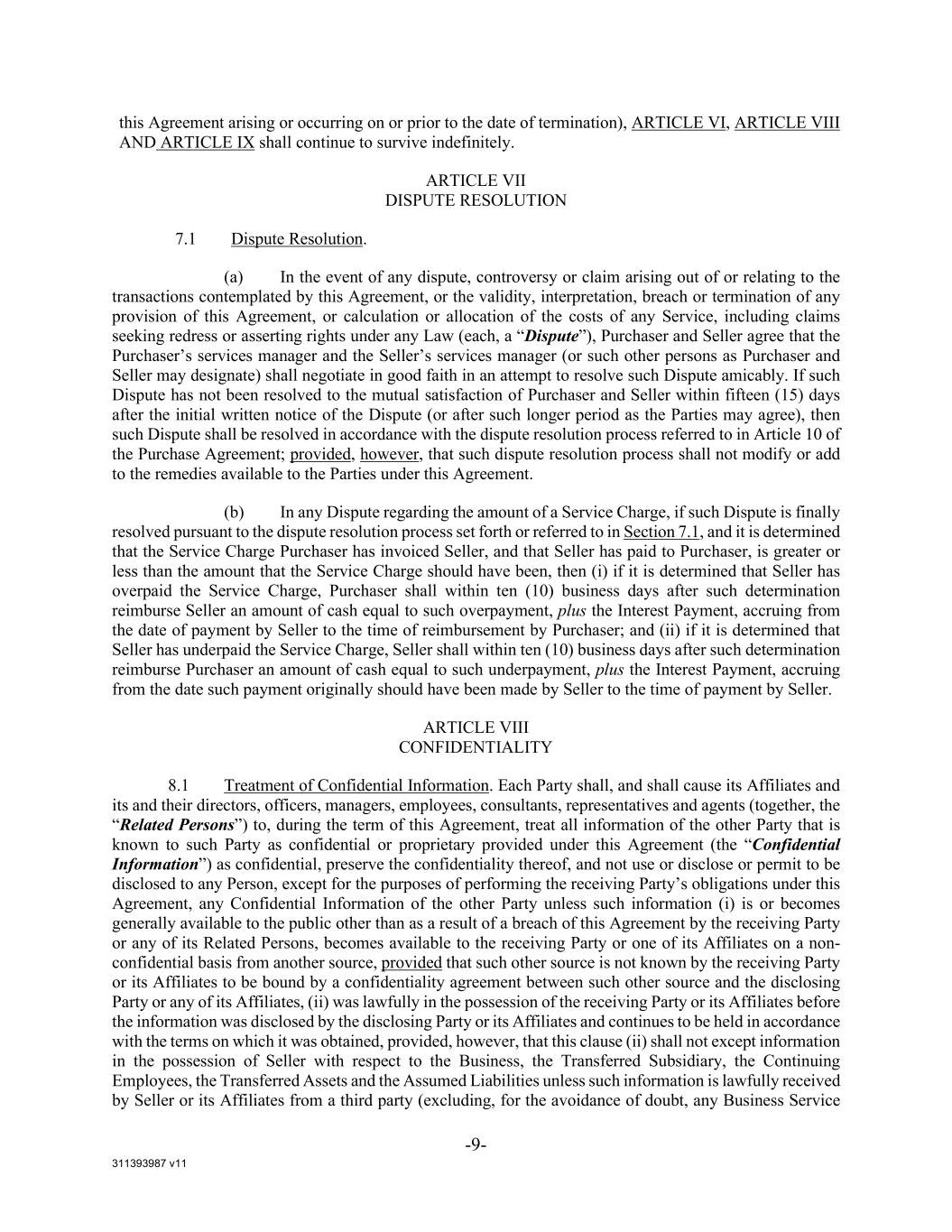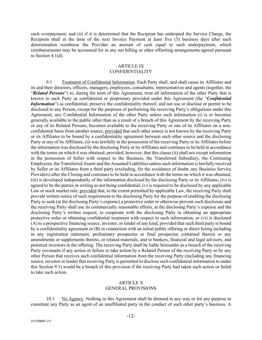 77 this Agreement and the other agreements contemplated hereby or consented to or requested by Seller or its Affiliates, (ix) any Effect that Seller had actual knowledge of as of the date of this Agreement, (x) any Effect resulting from any breach of this Agreement by Seller and (xi) any Effect that is cured prior to the Closing; provided that any state of facts, circumstance, condition, change, event or effect set forth in clauses (i), (ii), (iii), (v) or (vi) of this definition shall be taken into account in determining whether there has been or would reasonably be expected to be a Purchaser Material Adverse Effect to the extent such state of facts, circumstance, condition, change, event or effect has a disproportionate impact on Purchaser and its Subsidiaries, taken as a whole, relative to other Persons in the industry in which Purchaser and its Subsidiaries operate. 11.43 “Securities” means shares of capital stock, units, membership interests or other outstanding equity interests or securities. 11.44 “Specified Accounts Receivable” means any accounts receivable outstanding as of the Closing to the extent such accounts receivable relate solely to (a) Contracts (other than Specified Excluded Contracts) for the provision of services of the Business or the Transferred Subsidiary, (b) the provision of services of the Business or the Transferred Subsidiary under such Contracts and (c) the provision of such services of the Business or the Transferred Subsidiary that are to be performed prior to the Expiration Date. 11.45 “Specified Excluded Contracts” means, collectively, that certain (a) Strategic Framework Agreement, dated as of November 16, 2023, by and between Seller and the [Redacted: Proprietary customer data and subject to third party confidentiality obligations.] (as amended) and (b) Contract (No. [Redacted: Proprietary customer data and subject to third party confidentiality obligations.]), dated as of March 31, 2023, by and between Seller and [Redacted: Proprietary customer data and subject to third party confidentiality obligations.]. 11.46 “Straddle Period” means any Tax period beginning before or on the Closing Date and ending after the Closing Date. 11.47 “Subsidiary” of any Person means a corporation, company or other entity (a) more than fifty percent (50%) of whose outstanding shares or Securities (representing the right to vote for the election of directors or other managing authority of such Person) are, or (b) which does not have outstanding shares or Securities (as may be the case in a partnership, limited liability company, joint venture or unincorporated association), but more than fifty percent (50%) of whose ownership interest representing the right to make decisions for such entity is, now or hereafter owned or controlled, directly or indirectly, by such Person, but such corporation, company or other entity shall be deemed to be a Subsidiary only so long as such ownership or control exists. 11.48 “Tax” (and collectively “Taxes”) means: any national, federal, state, local, municipal, foreign, or other tax, charge, fee, duty (including stamp duty and customs duty), levy, or assessment, including any income, gross receipts, net proceeds, alternative or add-on minimum, corporation, ad valorem, turnover, real property, personal property (tangible or intangible), sales, use, franchise, excise, value added, stamp, leasing, lease, user, transfer, fuel, excess profits, profits, occupational, premium, interest equalization, windfall profits, severance, license, registration, payroll, environmental, unclaimed property, capital stock, capital duty, disability, estimated gains, capital, indirect capital gains, wealth, welfare, employee’s income withholding, other withholding, unemployment, equalization levy, or social security tax, or any other tax of whatever kind (including for the avoidance of doubt, any amount required to be refunded to such an authority, body, court, tribunal or official in respect of the temporary wage subsidy or wage subsidy payment as referred to in the Emergency Measures in the Public Interest (COVID-19) Act 2020 or Financial Provisions (COVID-19) (No. 2) Act 2020 respectively,