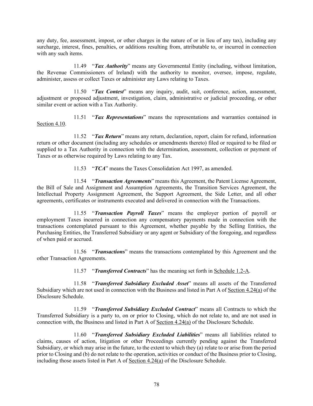 78 any duty, fee, assessment, impost, or other charges in the nature of or in lieu of any tax), including any surcharge, interest, fines, penalties, or additions resulting from, attributable to, or incurred in connection with any such items. 11.49 “Tax Authority” means any Governmental Entity (including, without limitation, the Revenue Commissioners of Ireland) with the authority to monitor, oversee, impose, regulate, administer, assess or collect Taxes or administer any Laws relating to Taxes. 11.50 “Tax Contest” means any inquiry, audit, suit, conference, action, assessment, adjustment or proposed adjustment, investigation, claim, administrative or judicial proceeding, or other similar event or action with a Tax Authority. 11.51 “Tax Representations” means the representations and warranties contained in Section 4.10. 11.52 “Tax Return” means any return, declaration, report, claim for refund, information return or other document (including any schedules or amendments thereto) filed or required to be filed or supplied to a Tax Authority in connection with the determination, assessment, collection or payment of Taxes or as otherwise required by Laws relating to any Tax. 11.53 “TCA” means the Taxes Consolidation Act 1997, as amended. 11.54 “Transaction Agreements” means this Agreement, the Patent License Agreement, the Bill of Sale and Assignment and Assumption Agreements, the Transition Services Agreement, the Intellectual Property Assignment Agreement, the Support Agreement, the Side Letter, and all other agreements, certificates or instruments executed and delivered in connection with the Transactions. 11.55 “Transaction Payroll Taxes” means the employer portion of payroll or employment Taxes incurred in connection any compensatory payments made in connection with the transactions contemplated pursuant to this Agreement, whether payable by the Selling Entities, the Purchasing Entities, the Transferred Subsidiary or any agent or Subsidiary of the foregoing, and regardless of when paid or accrued. 11.56 “Transactions” means the transactions contemplated by this Agreement and the other Transaction Agreements. 11.57 “Transferred Contracts” has the meaning set forth in Schedule 1.2-A. 11.58 “Transferred Subsidiary Excluded Asset” means all assets of the Transferred Subsidiary which are not used in connection with the Business and listed in Part A of Section 4.24(a) of the Disclosure Schedule. 11.59 “Transferred Subsidiary Excluded Contract” means all Contracts to which the Transferred Subsidiary is a party to, on or prior to Closing, which do not relate to, and are not used in connection with, the Business and listed in Part A of Section 4.24(a) of the Disclosure Schedule. 11.60 “Transferred Subsidiary Excluded Liabilities” means all liabilities related to claims, causes of action, litigation or other Proceedings currently pending against the Transferred Subsidiary, or which may arise in the future, to the extent to which they (a) relate to or arise from the period prior to Closing and (b) do not relate to the operation, activities or conduct of the Business prior to Closing, including those assets listed in Part A of Section 4.24(a) of the Disclosure Schedule.