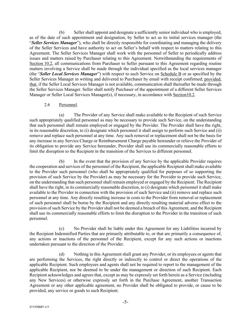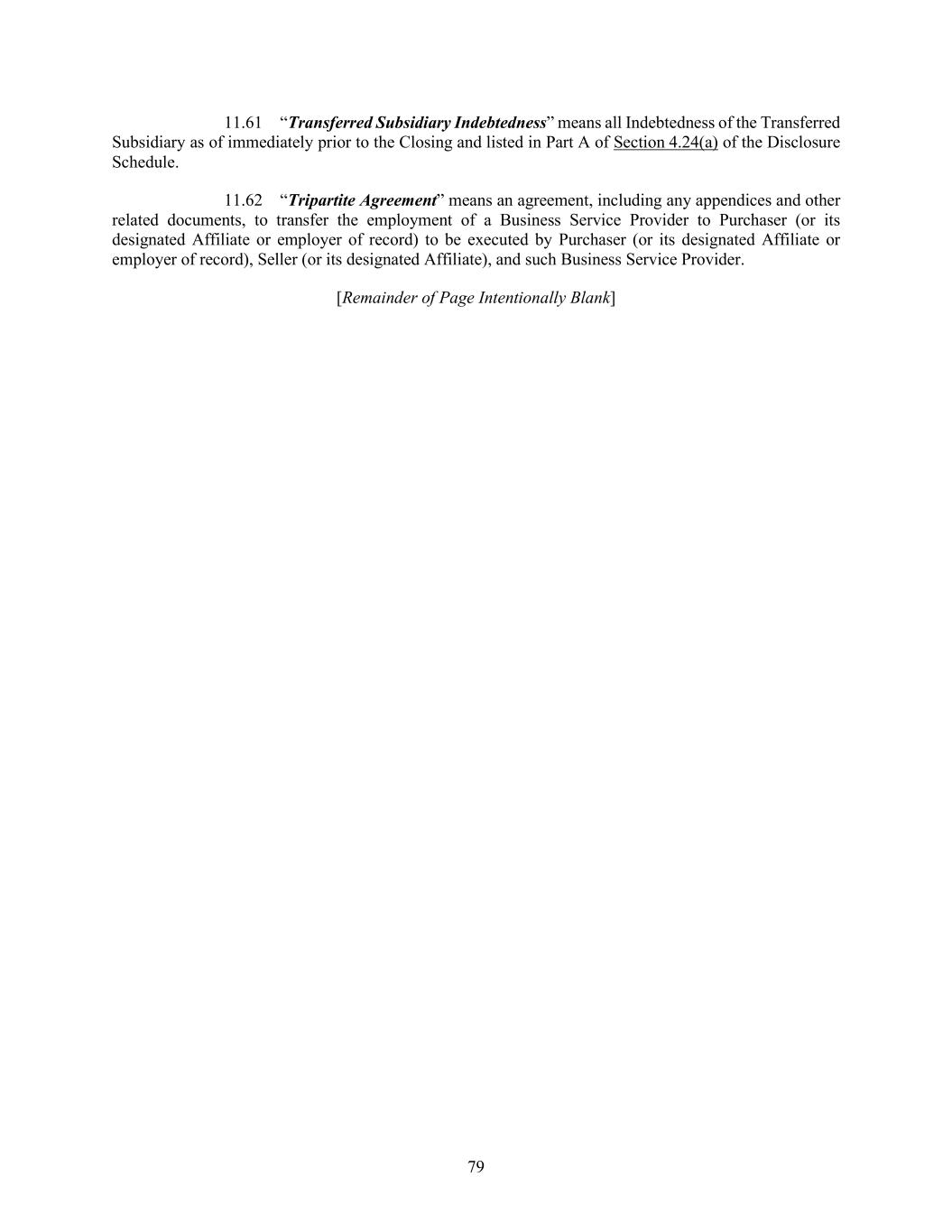 79 11.61 “Transferred Subsidiary Indebtedness” means all Indebtedness of the Transferred Subsidiary as of immediately prior to the Closing and listed in Part A of Section 4.24(a) of the Disclosure Schedule. 11.62 “Tripartite Agreement” means an agreement, including any appendices and other related documents, to transfer the employment of a Business Service Provider to Purchaser (or its designated Affiliate or employer of record) to be executed by Purchaser (or its designated Affiliate or employer of record), Seller (or its designated Affiliate), and such Business Service Provider. [Remainder of Page Intentionally Blank]