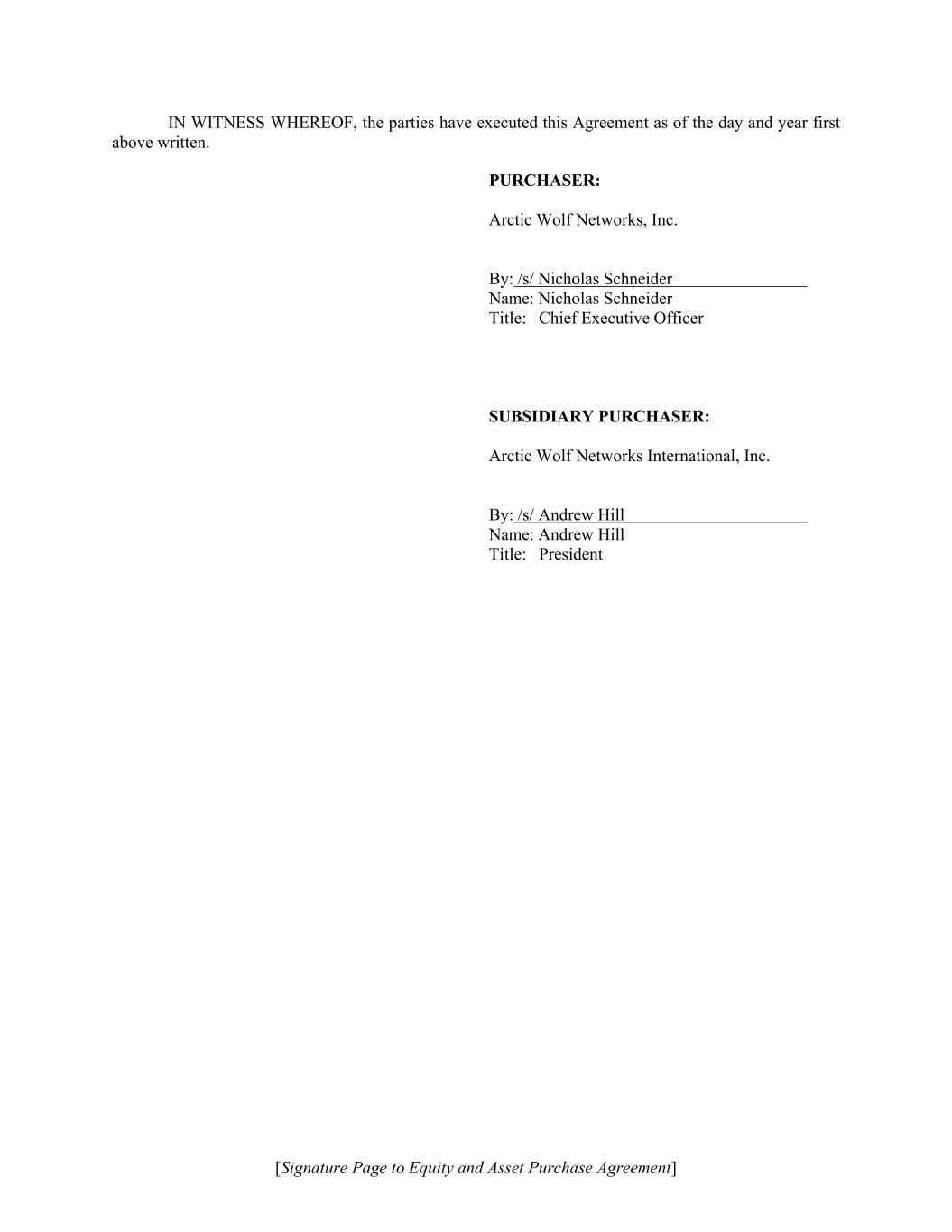 [Signature Page to Equity and Asset Purchase Agreement] IN WITNESS WHEREOF, the parties have executed this Agreement as of the day and year first above written. PURCHASER: Arctic Wolf Networks, Inc. By: /s/ Nicholas Schneider Name: Nicholas Schneider Title: Chief Executive Officer SUBSIDIARY PURCHASER: Arctic Wolf Networks International, Inc. By: /s/ Andrew Hill Name: Andrew Hill Title: President