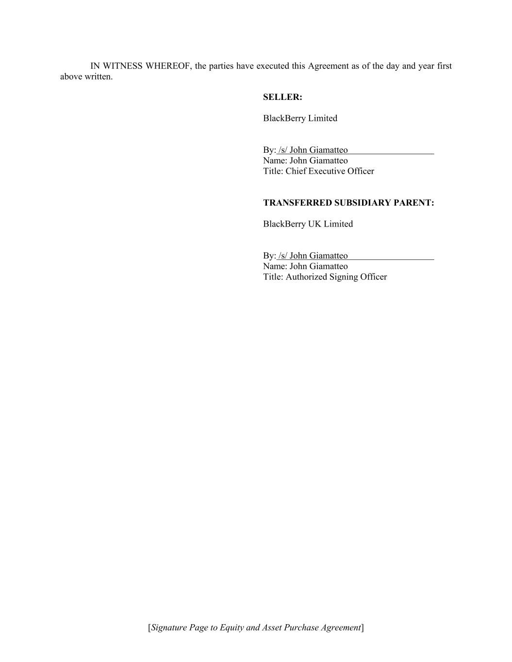 [Signature Page to Equity and Asset Purchase Agreement] IN WITNESS WHEREOF, the parties have executed this Agreement as of the day and year first above written. SELLER: BlackBerry Limited By: /s/ John Giamatteo Name: John Giamatteo Title: Chief Executive Officer TRANSFERRED SUBSIDIARY PARENT: BlackBerry UK Limited By: /s/ John Giamatteo Name: John Giamatteo Title: Authorized Signing Officer