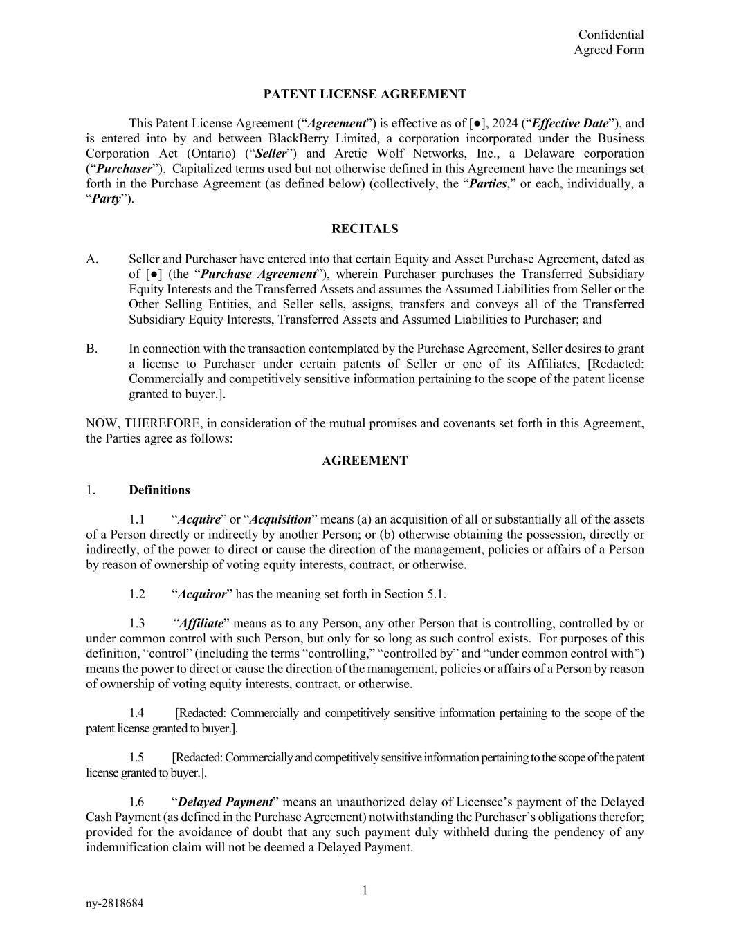 Confidential Agreed Form 1 ny-2818684 PATENT LICENSE AGREEMENT This Patent License Agreement (“Agreement”) is effective as of [●], 2024 (“Effective Date”), and is entered into by and between BlackBerry Limited, a corporation incorporated under the Business Corporation Act (Ontario) (“Seller”) and Arctic Wolf Networks, Inc., a Delaware corporation (“Purchaser”). Capitalized terms used but not otherwise defined in this Agreement have the meanings set forth in the Purchase Agreement (as defined below) (collectively, the “Parties,” or each, individually, a “Party”). RECITALS A. Seller and Purchaser have entered into that certain Equity and Asset Purchase Agreement, dated as of [●] (the “Purchase Agreement”), wherein Purchaser purchases the Transferred Subsidiary Equity Interests and the Transferred Assets and assumes the Assumed Liabilities from Seller or the Other Selling Entities, and Seller sells, assigns, transfers and conveys all of the Transferred Subsidiary Equity Interests, Transferred Assets and Assumed Liabilities to Purchaser; and B. In connection with the transaction contemplated by the Purchase Agreement, Seller desires to grant a license to Purchaser under certain patents of Seller or one of its Affiliates, [Redacted: Commercially and competitively sensitive information pertaining to the scope of the patent license granted to buyer.]. NOW, THEREFORE, in consideration of the mutual promises and covenants set forth in this Agreement, the Parties agree as follows: AGREEMENT 1. Definitions 1.1 “Acquire” or “Acquisition” means (a) an acquisition of all or substantially all of the assets of a Person directly or indirectly by another Person; or (b) otherwise obtaining the possession, directly or indirectly, of the power to direct or cause the direction of the management, policies or affairs of a Person by reason of ownership of voting equity interests, contract, or otherwise. 1.2 “Acquiror” has the meaning set forth in Section 5.1. 1.3 “Affiliate” means as to any Person, any other Person that is controlling, controlled by or under common control with such Person, but only for so long as such control exists. For purposes of this definition, “control” (including the terms “controlling,” “controlled by” and “under common control with”) means the power to direct or cause the direction of the management, policies or affairs of a Person by reason of ownership of voting equity interests, contract, or otherwise. 1.4 [Redacted: Commercially and competitively sensitive information pertaining to the scope of the patent license granted to buyer.]. 1.5 [Redacted: Commercially and competitively sensitive information pertaining to the scope of the patent license granted to buyer.]. 1.6 “Delayed Payment” means an unauthorized delay of Licensee’s payment of the Delayed Cash Payment (as defined in the Purchase Agreement) notwithstanding the Purchaser’s obligations therefor; provided for the avoidance of doubt that any such payment duly withheld during the pendency of any indemnification claim will not be deemed a Delayed Payment.