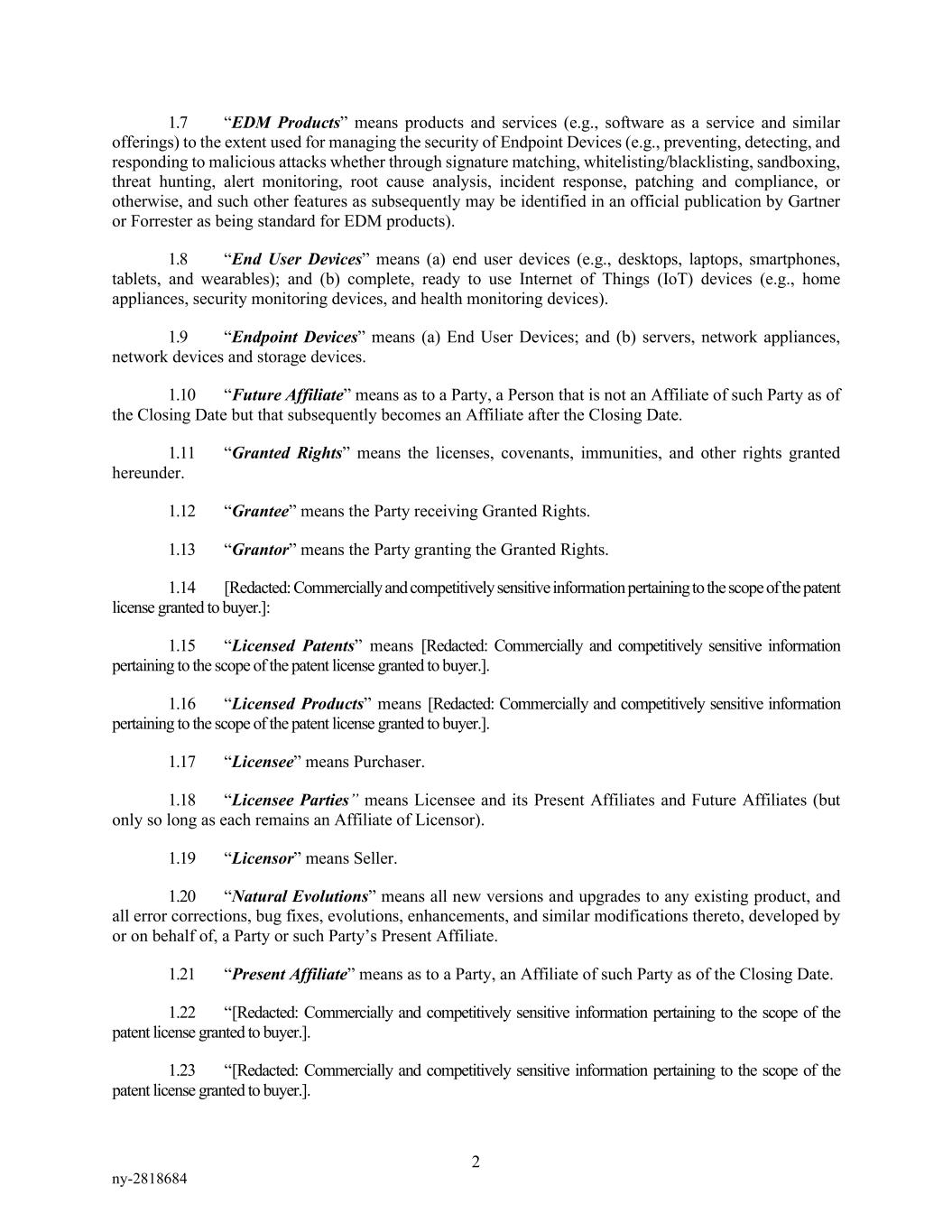 2 ny-2818684 1.7 “EDM Products” means products and services (e.g., software as a service and similar offerings) to the extent used for managing the security of Endpoint Devices (e.g., preventing, detecting, and responding to malicious attacks whether through signature matching, whitelisting/blacklisting, sandboxing, threat hunting, alert monitoring, root cause analysis, incident response, patching and compliance, or otherwise, and such other features as subsequently may be identified in an official publication by Gartner or Forrester as being standard for EDM products). 1.8 “End User Devices” means (a) end user devices (e.g., desktops, laptops, smartphones, tablets, and wearables); and (b) complete, ready to use Internet of Things (IoT) devices (e.g., home appliances, security monitoring devices, and health monitoring devices). 1.9 “Endpoint Devices” means (a) End User Devices; and (b) servers, network appliances, network devices and storage devices. 1.10 “Future Affiliate” means as to a Party, a Person that is not an Affiliate of such Party as of the Closing Date but that subsequently becomes an Affiliate after the Closing Date. 1.11 “Granted Rights” means the licenses, covenants, immunities, and other rights granted hereunder. 1.12 “Grantee” means the Party receiving Granted Rights. 1.13 “Grantor” means the Party granting the Granted Rights. 1.14 [Redacted: Commercially and competitively sensitive information pertaining to the scope of the patent license granted to buyer.]: 1.15 “Licensed Patents” means [Redacted: Commercially and competitively sensitive information pertaining to the scope of the patent license granted to buyer.]. 1.16 “Licensed Products” means [Redacted: Commercially and competitively sensitive information pertaining to the scope of the patent license granted to buyer.]. 1.17 “Licensee” means Purchaser. 1.18 “Licensee Parties” means Licensee and its Present Affiliates and Future Affiliates (but only so long as each remains an Affiliate of Licensor). 1.19 “Licensor” means Seller. 1.20 “Natural Evolutions” means all new versions and upgrades to any existing product, and all error corrections, bug fixes, evolutions, enhancements, and similar modifications thereto, developed by or on behalf of, a Party or such Party’s Present Affiliate. 1.21 “Present Affiliate” means as to a Party, an Affiliate of such Party as of the Closing Date. 1.22 “[Redacted: Commercially and competitively sensitive information pertaining to the scope of the patent license granted to buyer.]. 1.23 “[Redacted: Commercially and competitively sensitive information pertaining to the scope of the patent license granted to buyer.].
