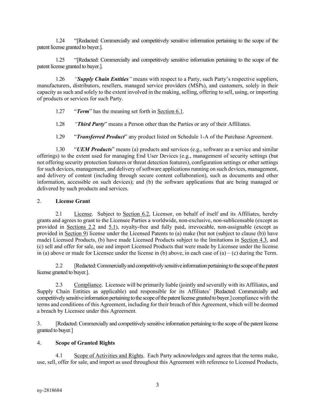3 ny-2818684 1.24 “[Redacted: Commercially and competitively sensitive information pertaining to the scope of the patent license granted to buyer.]. 1.25 “[Redacted: Commercially and competitively sensitive information pertaining to the scope of the patent license granted to buyer.]. 1.26 “Supply Chain Entities” means with respect to a Party, such Party’s respective suppliers, manufacturers, distributors, resellers, managed service providers (MSPs), and customers, solely in their capacity as such and solely to the extent involved in the making, selling, offering to sell, using, or importing of products or services for such Party. 1.27 “Term” has the meaning set forth in Section 6.1. 1.28 “Third Party” means a Person other than the Parties or any of their Affiliates. 1.29 “Transferred Product” any product listed on Schedule 1-A of the Purchase Agreement. 1.30 “UEM Products” means (a) products and services (e.g., software as a service and similar offerings) to the extent used for managing End User Devices (e.g., management of security settings (but not offering security protection features or threat detection features), configuration settings or other settings for such devices, management, and delivery of software applications running on such devices, management, and delivery of content (including through secure content collaboration), such as documents and other information, accessible on such devices); and (b) the software applications that are being managed or delivered by such products and services. 2. License Grant 2.1 License. Subject to Section 6.2, Licensor, on behalf of itself and its Affiliates, hereby grants and agrees to grant to the Licensee Parties a worldwide, non-exclusive, non-sublicensable (except as provided in Sections 2.2 and 5.1), royalty-free and fully paid, irrevocable, non-assignable (except as provided in Section 9) license under the Licensed Patents to (a) make (but not (subject to clause (b)) have made) Licensed Products, (b) have made Licensed Products subject to the limitations in Section 4.3, and (c) sell and offer for sale, use and import Licensed Products that were made by Licensee under the license in (a) above or made for Licensee under the license in (b) above, in each case of (a) – (c) during the Term. 2.2 [Redacted: Commercially and competitively sensitive information pertaining to the scope of the patent license granted to buyer.]. 2.3 Compliance. Licensee will be primarily liable (jointly and severally with its Affiliates, and Supply Chain Entities as applicable) and responsible for its Affiliates’ [Redacted: Commercially and competitively sensitive information pertaining to the scope of the patent license granted to buyer.] compliance with the terms and conditions of this Agreement, including for their breach of this Agreement, which will be deemed a breach by Licensee under this Agreement. 3. [Redacted: Commercially and competitively sensitive information pertaining to the scope of the patent license granted to buyer.] 4. Scope of Granted Rights 4.1 Scope of Activities and Rights. Each Party acknowledges and agrees that the terms make, use, sell, offer for sale, and import as used throughout this Agreement with reference to Licensed Products,
