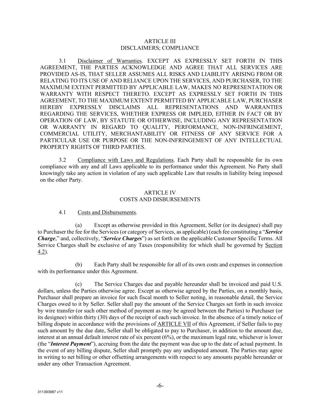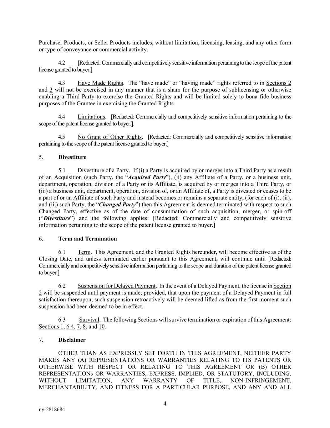 4 ny-2818684 Purchaser Products, or Seller Products includes, without limitation, licensing, leasing, and any other form or type of conveyance or commercial activity. 4.2 [Redacted: Commercially and competitively sensitive information pertaining to the scope of the patent license granted to buyer.] 4.3 Have Made Rights. The “have made” or “having made” rights referred to in Sections 2 and 3 will not be exercised in any manner that is a sham for the purpose of sublicensing or otherwise enabling a Third Party to exercise the Granted Rights and will be limited solely to bona fide business purposes of the Grantee in exercising the Granted Rights. 4.4 Limitations. [Redacted: Commercially and competitively sensitive information pertaining to the scope of the patent license granted to buyer.]. 4.5 No Grant of Other Rights. [Redacted: Commercially and competitively sensitive information pertaining to the scope of the patent license granted to buyer.] 5. Divestiture 5.1 Divestiture of a Party. If (i) a Party is acquired by or merges into a Third Party as a result of an Acquisition (such Party, the “Acquired Party”), (ii) any Affiliate of a Party, or a business unit, department, operation, division of a Party or its Affiliate, is acquired by or merges into a Third Party, or (iii) a business unit, department, operation, division of, or an Affiliate of, a Party is divested or ceases to be a part of or an Affiliate of such Party and instead becomes or remains a separate entity, (for each of (i), (ii), and (iii) such Party, the “Changed Party”) then this Agreement is deemed terminated with respect to such Changed Party, effective as of the date of consummation of such acquisition, merger, or spin-off (“Divestiture”) and the following applies: [Redacted: Commercially and competitively sensitive information pertaining to the scope of the patent license granted to buyer.] 6. Term and Termination 6.1 Term. This Agreement, and the Granted Rights hereunder, will become effective as of the Closing Date, and unless terminated earlier pursuant to this Agreement, will continue until [Redacted: Commercially and competitively sensitive information pertaining to the scope and duration of the patent license granted to buyer.] 6.2 Suspension for Delayed Payment. In the event of a Delayed Payment, the license in Section 2 will be suspended until payment is made; provided, that upon the payment of a Delayed Payment in full satisfaction thereupon, such suspension retroactively will be deemed lifted as from the first moment such suspension had been deemed to be in effect. 6.3 Survival. The following Sections will survive termination or expiration of this Agreement: Sections 1, 6.4, 7, 8, and 10. 7. Disclaimer OTHER THAN AS EXPRESSLY SET FORTH IN THIS AGREEMENT, NEITHER PARTY MAKES ANY (A) REPRESENTATIONS OR WARRANTIES RELATING TO ITS PATENTS OR OTHERWISE WITH RESPECT OR RELATING TO THIS AGREEMENT OR (B) OTHER REPRESENTATIONs OR WARRANTIES, EXPRESS, IMPLIED, OR STATUTORY, INCLUDING, WITHOUT LIMITATION, ANY WARRANTY OF TITLE, NON-INFRINGEMENT, MERCHANTABILITY, AND FITNESS FOR A PARTICULAR PURPOSE, AND ANY AND ALL
