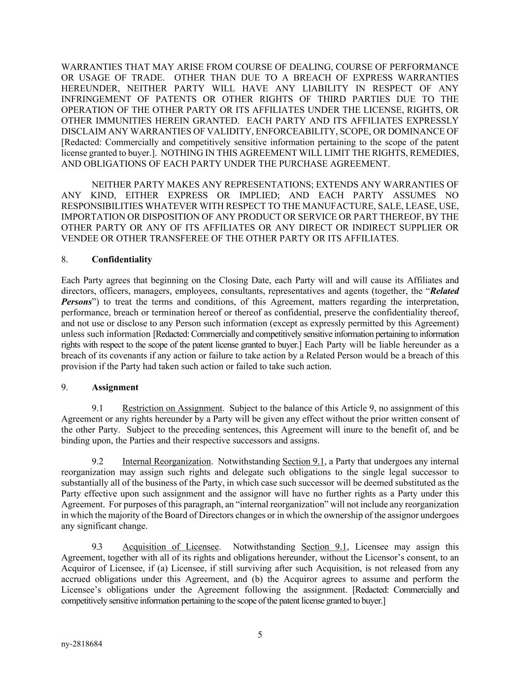 5 ny-2818684 WARRANTIES THAT MAY ARISE FROM COURSE OF DEALING, COURSE OF PERFORMANCE OR USAGE OF TRADE. OTHER THAN DUE TO A BREACH OF EXPRESS WARRANTIES HEREUNDER, NEITHER PARTY WILL HAVE ANY LIABILITY IN RESPECT OF ANY INFRINGEMENT OF PATENTS OR OTHER RIGHTS OF THIRD PARTIES DUE TO THE OPERATION OF THE OTHER PARTY OR ITS AFFILIATES UNDER THE LICENSE, RIGHTS, OR OTHER IMMUNITIES HEREIN GRANTED. EACH PARTY AND ITS AFFILIATES EXPRESSLY DISCLAIM ANY WARRANTIES OF VALIDITY, ENFORCEABILITY, SCOPE, OR DOMINANCE OF [Redacted: Commercially and competitively sensitive information pertaining to the scope of the patent license granted to buyer.]. NOTHING IN THIS AGREEMENT WILL LIMIT THE RIGHTS, REMEDIES, AND OBLIGATIONS OF EACH PARTY UNDER THE PURCHASE AGREEMENT. NEITHER PARTY MAKES ANY REPRESENTATIONS; EXTENDS ANY WARRANTIES OF ANY KIND, EITHER EXPRESS OR IMPLIED; AND EACH PARTY ASSUMES NO RESPONSIBILITIES WHATEVER WITH RESPECT TO THE MANUFACTURE, SALE, LEASE, USE, IMPORTATION OR DISPOSITION OF ANY PRODUCT OR SERVICE OR PART THEREOF, BY THE OTHER PARTY OR ANY OF ITS AFFILIATES OR ANY DIRECT OR INDIRECT SUPPLIER OR VENDEE OR OTHER TRANSFEREE OF THE OTHER PARTY OR ITS AFFILIATES. 8. Confidentiality Each Party agrees that beginning on the Closing Date, each Party will and will cause its Affiliates and directors, officers, managers, employees, consultants, representatives and agents (together, the “Related Persons”) to treat the terms and conditions, of this Agreement, matters regarding the interpretation, performance, breach or termination hereof or thereof as confidential, preserve the confidentiality thereof, and not use or disclose to any Person such information (except as expressly permitted by this Agreement) unless such information [Redacted: Commercially and competitively sensitive information pertaining to information rights with respect to the scope of the patent license granted to buyer.] Each Party will be liable hereunder as a breach of its covenants if any action or failure to take action by a Related Person would be a breach of this provision if the Party had taken such action or failed to take such action. 9. Assignment 9.1 Restriction on Assignment. Subject to the balance of this Article 9, no assignment of this Agreement or any rights hereunder by a Party will be given any effect without the prior written consent of the other Party. Subject to the preceding sentences, this Agreement will inure to the benefit of, and be binding upon, the Parties and their respective successors and assigns. 9.2 Internal Reorganization. Notwithstanding Section 9.1, a Party that undergoes any internal reorganization may assign such rights and delegate such obligations to the single legal successor to substantially all of the business of the Party, in which case such successor will be deemed substituted as the Party effective upon such assignment and the assignor will have no further rights as a Party under this Agreement. For purposes of this paragraph, an “internal reorganization” will not include any reorganization in which the majority of the Board of Directors changes or in which the ownership of the assignor undergoes any significant change. 9.3 Acquisition of Licensee. Notwithstanding Section 9.1, Licensee may assign this Agreement, together with all of its rights and obligations hereunder, without the Licensor’s consent, to an Acquiror of Licensee, if (a) Licensee, if still surviving after such Acquisition, is not released from any accrued obligations under this Agreement, and (b) the Acquiror agrees to assume and perform the Licensee’s obligations under the Agreement following the assignment. [Redacted: Commercially and competitively sensitive information pertaining to the scope of the patent license granted to buyer.]