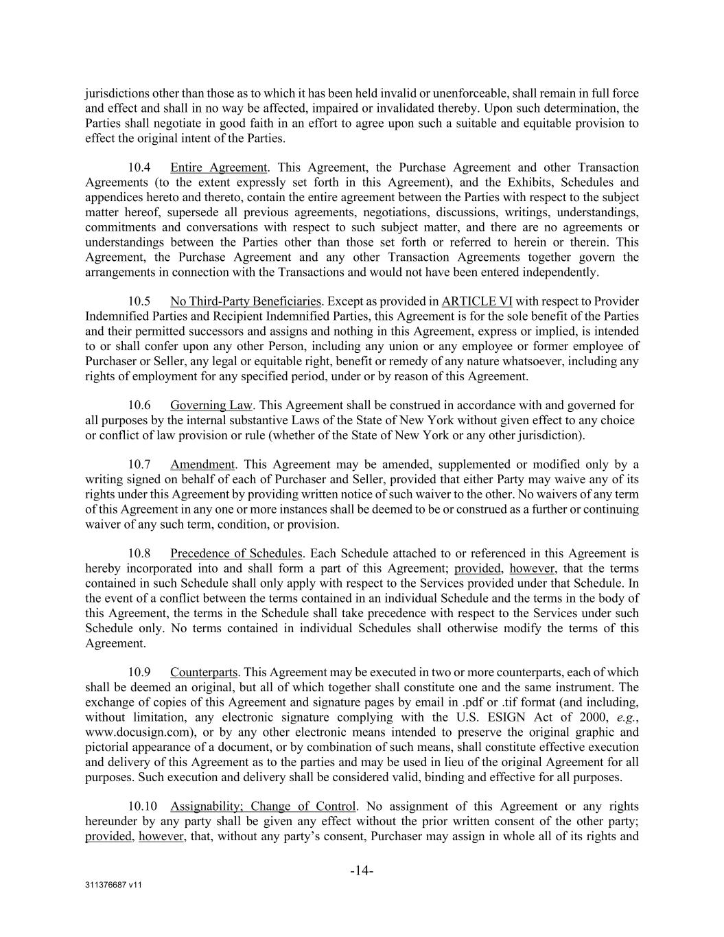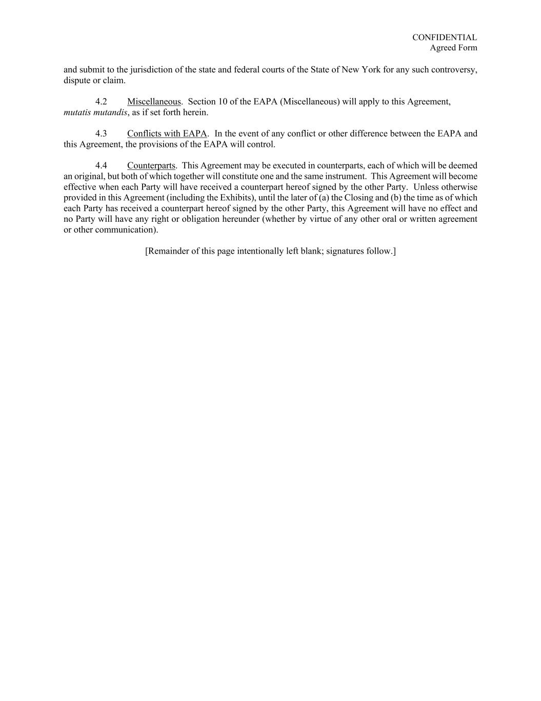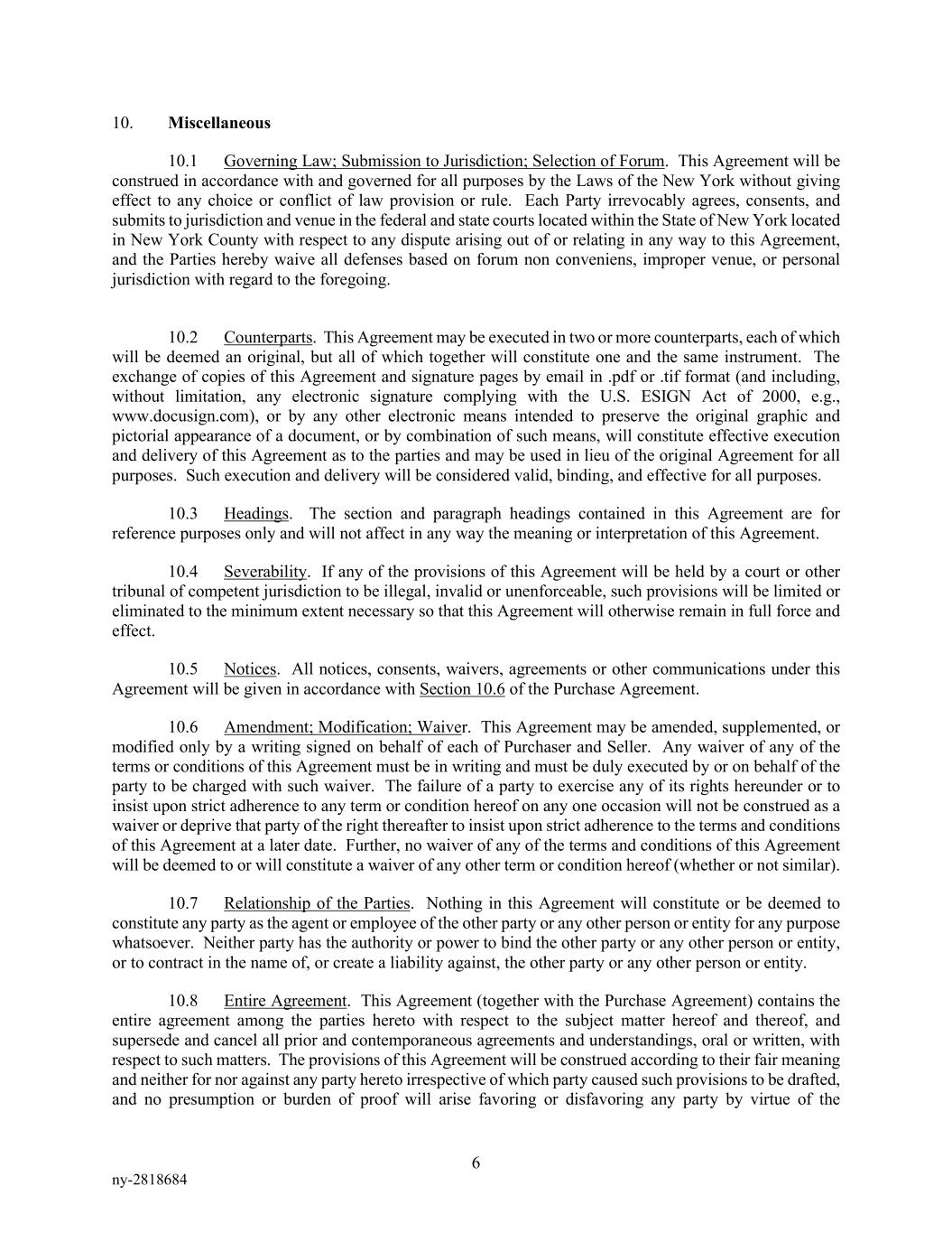 6 ny-2818684 10. Miscellaneous 10.1 Governing Law; Submission to Jurisdiction; Selection of Forum. This Agreement will be construed in accordance with and governed for all purposes by the Laws of the New York without giving effect to any choice or conflict of law provision or rule. Each Party irrevocably agrees, consents, and submits to jurisdiction and venue in the federal and state courts located within the State of New York located in New York County with respect to any dispute arising out of or relating in any way to this Agreement, and the Parties hereby waive all defenses based on forum non conveniens, improper venue, or personal jurisdiction with regard to the foregoing. 10.2 Counterparts. This Agreement may be executed in two or more counterparts, each of which will be deemed an original, but all of which together will constitute one and the same instrument. The exchange of copies of this Agreement and signature pages by email in .pdf or .tif format (and including, without limitation, any electronic signature complying with the U.S. ESIGN Act of 2000, e.g., www.docusign.com), or by any other electronic means intended to preserve the original graphic and pictorial appearance of a document, or by combination of such means, will constitute effective execution and delivery of this Agreement as to the parties and may be used in lieu of the original Agreement for all purposes. Such execution and delivery will be considered valid, binding, and effective for all purposes. 10.3 Headings. The section and paragraph headings contained in this Agreement are for reference purposes only and will not affect in any way the meaning or interpretation of this Agreement. 10.4 Severability. If any of the provisions of this Agreement will be held by a court or other tribunal of competent jurisdiction to be illegal, invalid or unenforceable, such provisions will be limited or eliminated to the minimum extent necessary so that this Agreement will otherwise remain in full force and effect. 10.5 Notices. All notices, consents, waivers, agreements or other communications under this Agreement will be given in accordance with Section 10.6 of the Purchase Agreement. 10.6 Amendment; Modification; Waiver. This Agreement may be amended, supplemented, or modified only by a writing signed on behalf of each of Purchaser and Seller. Any waiver of any of the terms or conditions of this Agreement must be in writing and must be duly executed by or on behalf of the party to be charged with such waiver. The failure of a party to exercise any of its rights hereunder or to insist upon strict adherence to any term or condition hereof on any one occasion will not be construed as a waiver or deprive that party of the right thereafter to insist upon strict adherence to the terms and conditions of this Agreement at a later date. Further, no waiver of any of the terms and conditions of this Agreement will be deemed to or will constitute a waiver of any other term or condition hereof (whether or not similar). 10.7 Relationship of the Parties. Nothing in this Agreement will constitute or be deemed to constitute any party as the agent or employee of the other party or any other person or entity for any purpose whatsoever. Neither party has the authority or power to bind the other party or any other person or entity, or to contract in the name of, or create a liability against, the other party or any other person or entity. 10.8 Entire Agreement. This Agreement (together with the Purchase Agreement) contains the entire agreement among the parties hereto with respect to the subject matter hereof and thereof, and supersede and cancel all prior and contemporaneous agreements and understandings, oral or written, with respect to such matters. The provisions of this Agreement will be construed according to their fair meaning and neither for nor against any party hereto irrespective of which party caused such provisions to be drafted, and no presumption or burden of proof will arise favoring or disfavoring any party by virtue of the
