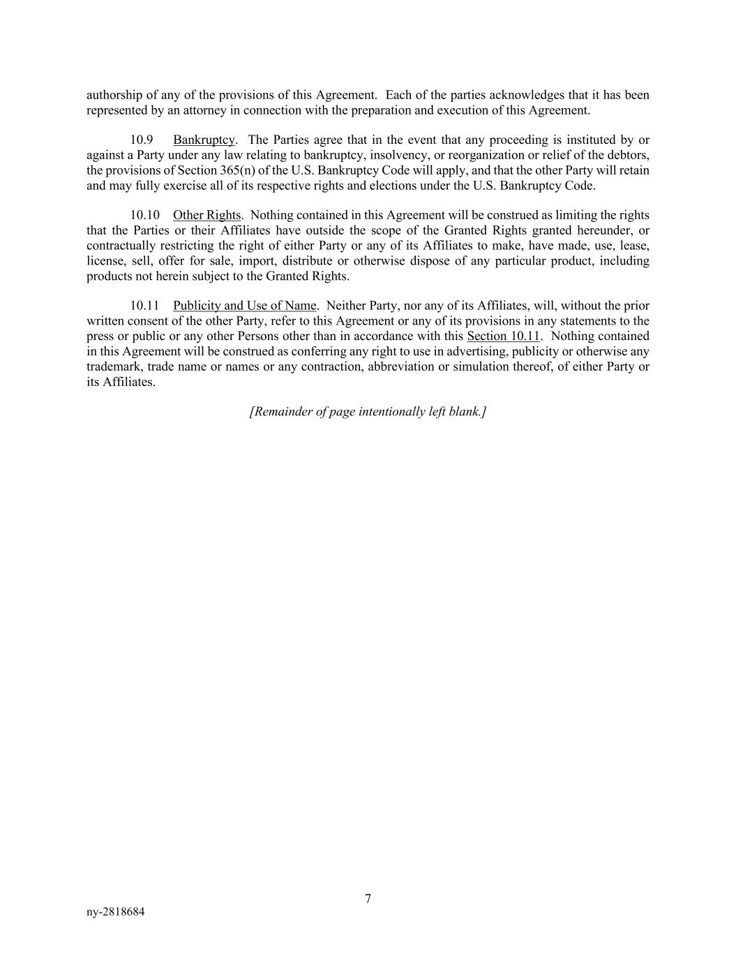 7 ny-2818684 authorship of any of the provisions of this Agreement. Each of the parties acknowledges that it has been represented by an attorney in connection with the preparation and execution of this Agreement. 10.9 Bankruptcy. The Parties agree that in the event that any proceeding is instituted by or against a Party under any law relating to bankruptcy, insolvency, or reorganization or relief of the debtors, the provisions of Section 365(n) of the U.S. Bankruptcy Code will apply, and that the other Party will retain and may fully exercise all of its respective rights and elections under the U.S. Bankruptcy Code. 10.10 Other Rights. Nothing contained in this Agreement will be construed as limiting the rights that the Parties or their Affiliates have outside the scope of the Granted Rights granted hereunder, or contractually restricting the right of either Party or any of its Affiliates to make, have made, use, lease, license, sell, offer for sale, import, distribute or otherwise dispose of any particular product, including products not herein subject to the Granted Rights. 10.11 Publicity and Use of Name. Neither Party, nor any of its Affiliates, will, without the prior written consent of the other Party, refer to this Agreement or any of its provisions in any statements to the press or public or any other Persons other than in accordance with this Section 10.11. Nothing contained in this Agreement will be construed as conferring any right to use in advertising, publicity or otherwise any trademark, trade name or names or any contraction, abbreviation or simulation thereof, of either Party or its Affiliates. [Remainder of page intentionally left blank.]