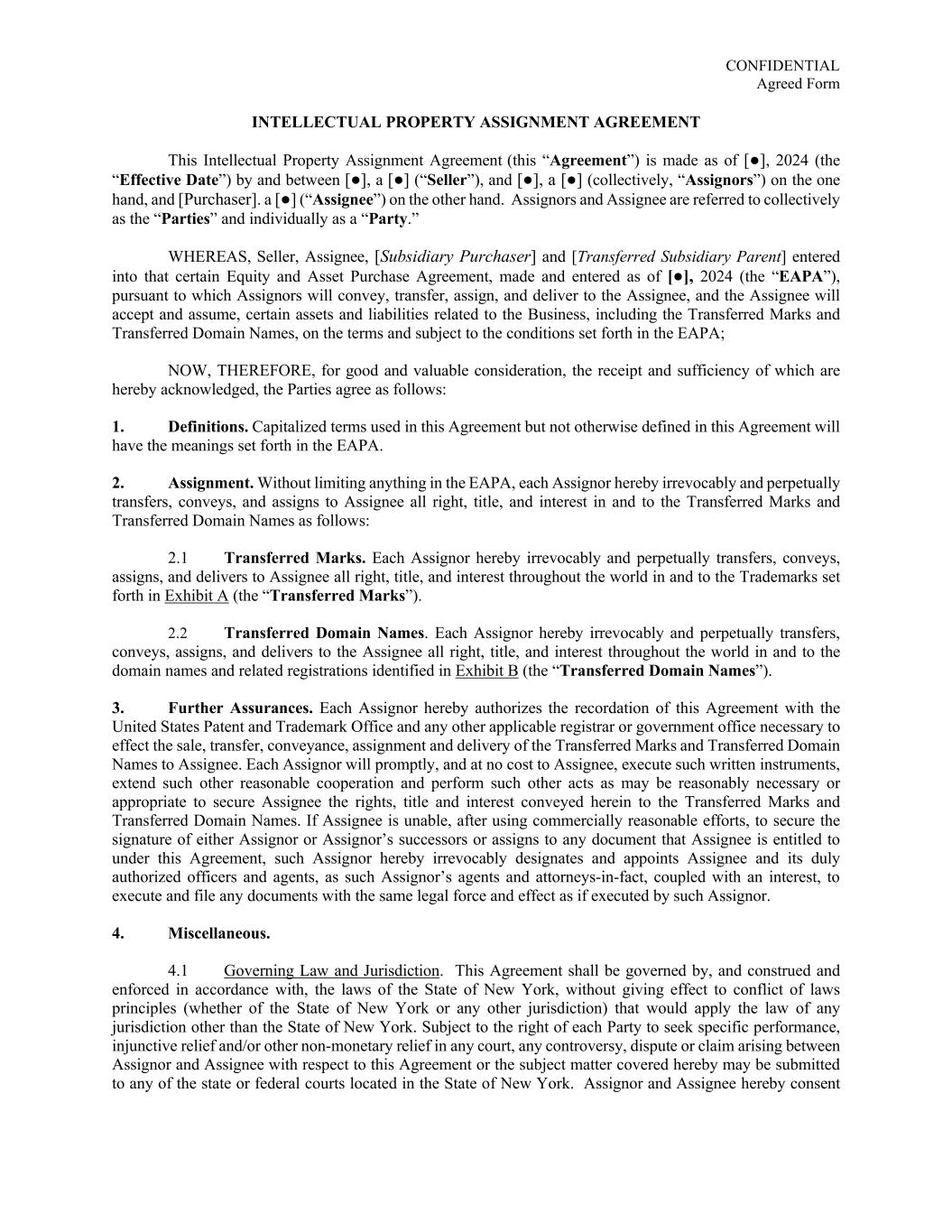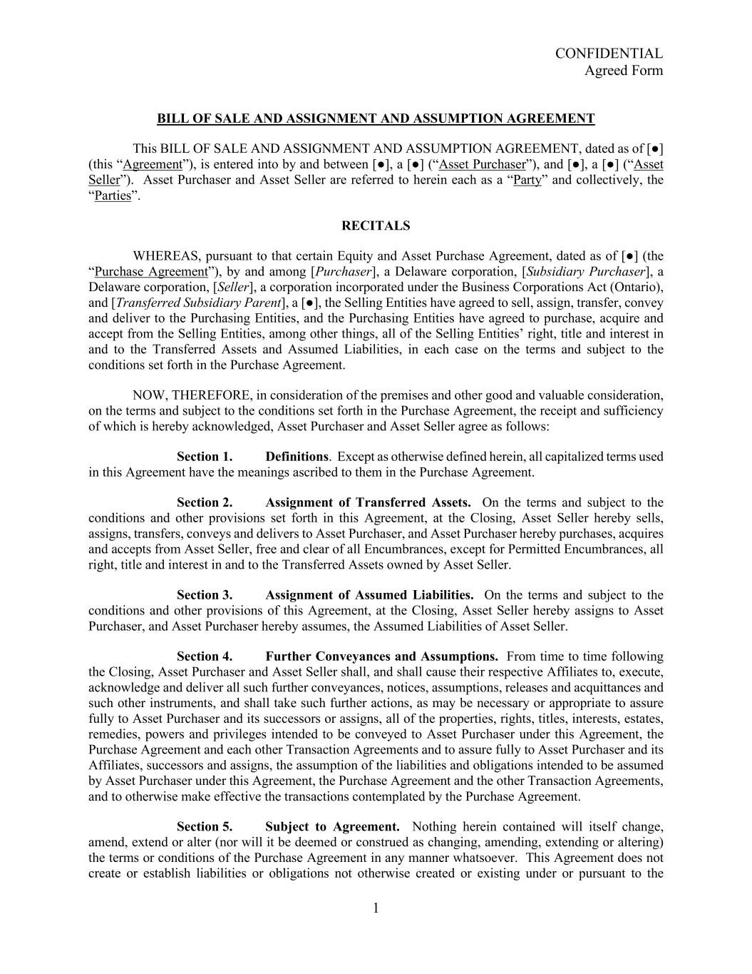 CONFIDENTIAL Agreed Form 1 BILL OF SALE AND ASSIGNMENT AND ASSUMPTION AGREEMENT This BILL OF SALE AND ASSIGNMENT AND ASSUMPTION AGREEMENT, dated as of [●] (this “Agreement”), is entered into by and between [●], a [●] (“Asset Purchaser”), and [●], a [●] (“Asset Seller”). Asset Purchaser and Asset Seller are referred to herein each as a “Party” and collectively, the “Parties”. RECITALS WHEREAS, pursuant to that certain Equity and Asset Purchase Agreement, dated as of [●] (the “Purchase Agreement”), by and among [Purchaser], a Delaware corporation, [Subsidiary Purchaser], a Delaware corporation, [Seller], a corporation incorporated under the Business Corporations Act (Ontario), and [Transferred Subsidiary Parent], a [●], the Selling Entities have agreed to sell, assign, transfer, convey and deliver to the Purchasing Entities, and the Purchasing Entities have agreed to purchase, acquire and accept from the Selling Entities, among other things, all of the Selling Entities’ right, title and interest in and to the Transferred Assets and Assumed Liabilities, in each case on the terms and subject to the conditions set forth in the Purchase Agreement. NOW, THEREFORE, in consideration of the premises and other good and valuable consideration, on the terms and subject to the conditions set forth in the Purchase Agreement, the receipt and sufficiency of which is hereby acknowledged, Asset Purchaser and Asset Seller agree as follows: Section 1. Definitions. Except as otherwise defined herein, all capitalized terms used in this Agreement have the meanings ascribed to them in the Purchase Agreement. Section 2. Assignment of Transferred Assets. On the terms and subject to the conditions and other provisions set forth in this Agreement, at the Closing, Asset Seller hereby sells, assigns, transfers, conveys and delivers to Asset Purchaser, and Asset Purchaser hereby purchases, acquires and accepts from Asset Seller, free and clear of all Encumbrances, except for Permitted Encumbrances, all right, title and interest in and to the Transferred Assets owned by Asset Seller. Section 3. Assignment of Assumed Liabilities. On the terms and subject to the conditions and other provisions of this Agreement, at the Closing, Asset Seller hereby assigns to Asset Purchaser, and Asset Purchaser hereby assumes, the Assumed Liabilities of Asset Seller. Section 4. Further Conveyances and Assumptions. From time to time following the Closing, Asset Purchaser and Asset Seller shall, and shall cause their respective Affiliates to, execute, acknowledge and deliver all such further conveyances, notices, assumptions, releases and acquittances and such other instruments, and shall take such further actions, as may be necessary or appropriate to assure fully to Asset Purchaser and its successors or assigns, all of the properties, rights, titles, interests, estates, remedies, powers and privileges intended to be conveyed to Asset Purchaser under this Agreement, the Purchase Agreement and each other Transaction Agreements and to assure fully to Asset Purchaser and its Affiliates, successors and assigns, the assumption of the liabilities and obligations intended to be assumed by Asset Purchaser under this Agreement, the Purchase Agreement and the other Transaction Agreements, and to otherwise make effective the transactions contemplated by the Purchase Agreement. Section 5. Subject to Agreement. Nothing herein contained will itself change, amend, extend or alter (nor will it be deemed or construed as changing, amending, extending or altering) the terms or conditions of the Purchase Agreement in any manner whatsoever. This Agreement does not create or establish liabilities or obligations not otherwise created or existing under or pursuant to the