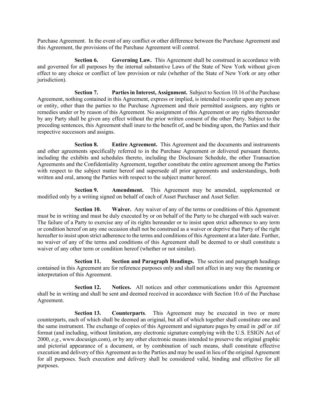 Purchase Agreement. In the event of any conflict or other difference between the Purchase Agreement and this Agreement, the provisions of the Purchase Agreement will control. Section 6. Governing Law. This Agreement shall be construed in accordance with and governed for all purposes by the internal substantive Laws of the State of New York without given effect to any choice or conflict of law provision or rule (whether of the State of New York or any other jurisdiction). Section 7. Parties in Interest, Assignment. Subject to Section 10.16 of the Purchase Agreement, nothing contained in this Agreement, express or implied, is intended to confer upon any person or entity, other than the parties to the Purchase Agreement and their permitted assignees, any rights or remedies under or by reason of this Agreement. No assignment of this Agreement or any rights thereunder by any Party shall be given any effect without the prior written consent of the other Party. Subject to the preceding sentences, this Agreement shall inure to the benefit of, and be binding upon, the Parties and their respective successors and assigns. Section 8. Entire Agreement. This Agreement and the documents and instruments and other agreements specifically referred to in the Purchase Agreement or delivered pursuant thereto, including the exhibits and schedules thereto, including the Disclosure Schedule, the other Transaction Agreements and the Confidentiality Agreement, together constitute the entire agreement among the Parties with respect to the subject matter hereof and supersede all prior agreements and understandings, both written and oral, among the Parties with respect to the subject matter hereof. Section 9. Amendment. This Agreement may be amended, supplemented or modified only by a writing signed on behalf of each of Asset Purchaser and Asset Seller. Section 10. Waiver. Any waiver of any of the terms or conditions of this Agreement must be in writing and must be duly executed by or on behalf of the Party to be charged with such waiver. The failure of a Party to exercise any of its rights hereunder or to insist upon strict adherence to any term or condition hereof on any one occasion shall not be construed as a waiver or deprive that Party of the right hereafter to insist upon strict adherence to the terms and conditions of this Agreement at a later date. Further, no waiver of any of the terms and conditions of this Agreement shall be deemed to or shall constitute a waiver of any other term or condition hereof (whether or not similar). Section 11. Section and Paragraph Headings. The section and paragraph headings contained in this Agreement are for reference purposes only and shall not affect in any way the meaning or interpretation of this Agreement. Section 12. Notices. All notices and other communications under this Agreement shall be in writing and shall be sent and deemed received in accordance with Section 10.6 of the Purchase Agreement. Section 13. Counterparts. This Agreement may be executed in two or more counterparts, each of which shall be deemed an original, but all of which together shall constitute one and the same instrument. The exchange of copies of this Agreement and signature pages by email in .pdf or .tif format (and including, without limitation, any electronic signature complying with the U.S. ESIGN Act of 2000, e.g., www.docusign.com), or by any other electronic means intended to preserve the original graphic and pictorial appearance of a document, or by combination of such means, shall constitute effective execution and delivery of this Agreement as to the Parties and may be used in lieu of the original Agreement for all purposes. Such execution and delivery shall be considered valid, binding and effective for all purposes.