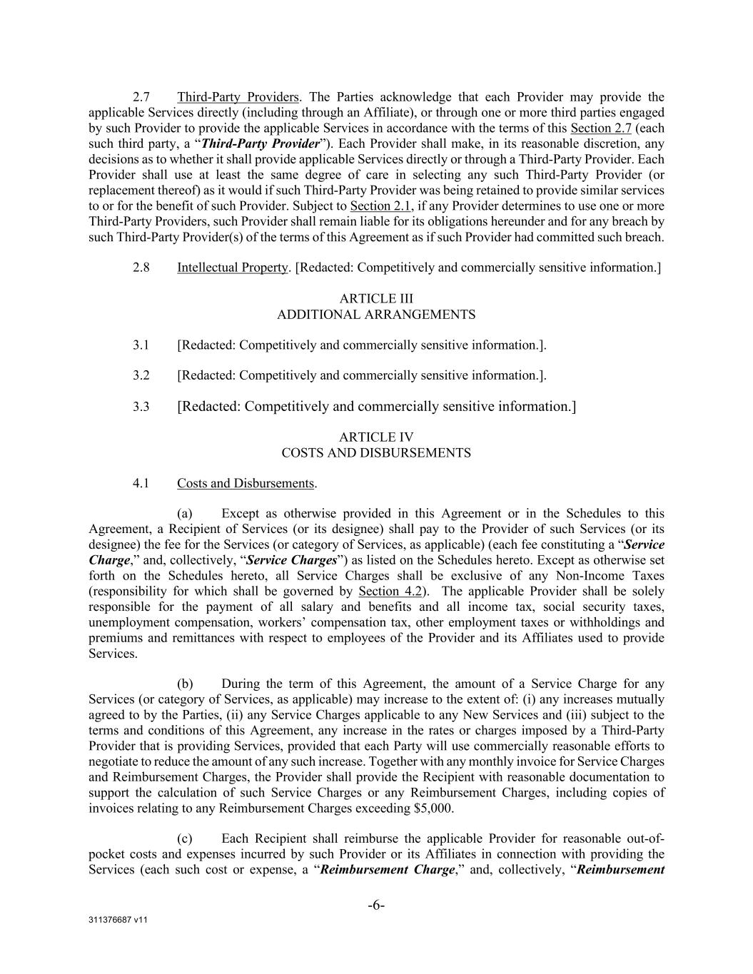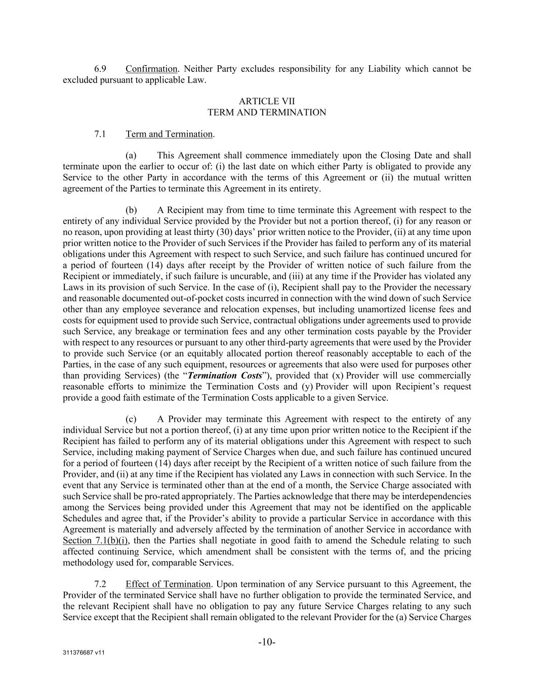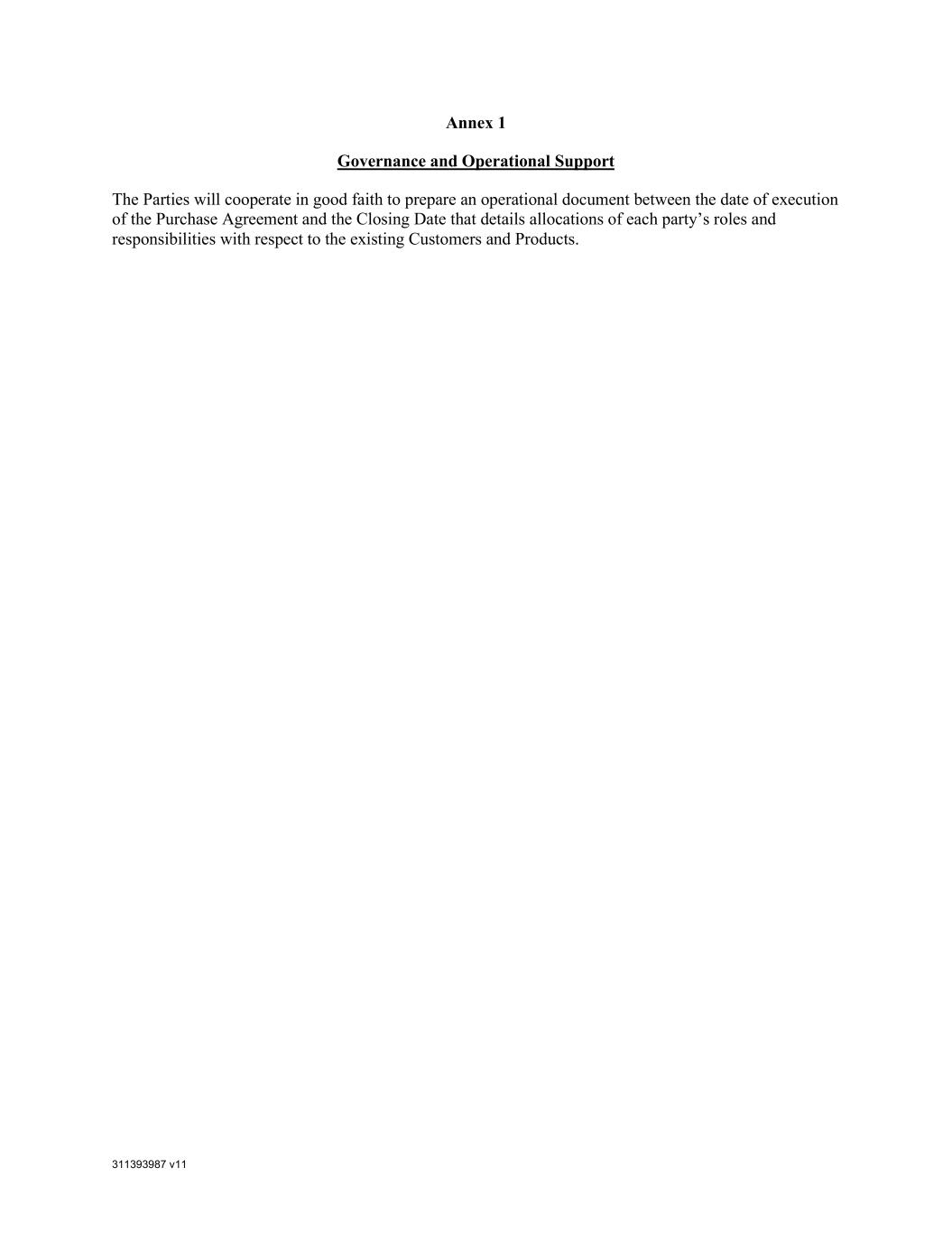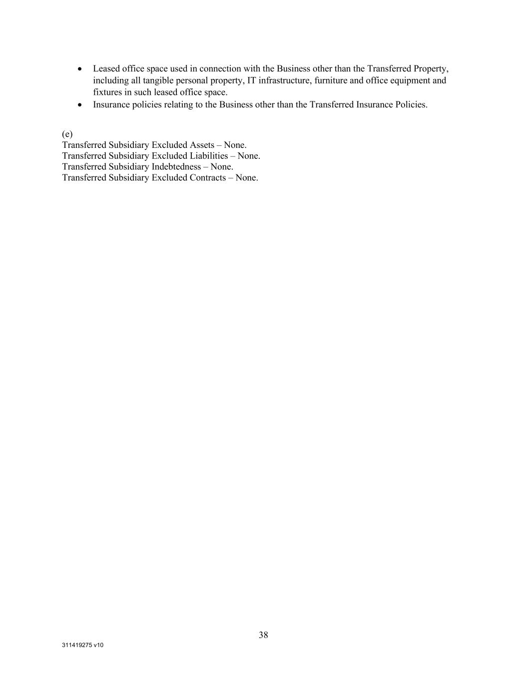 311419275 v10 38 • Leased office space used in connection with the Business other than the Transferred Property, including all tangible personal property, IT infrastructure, furniture and office equipment and fixtures in such leased office space. • Insurance policies relating to the Business other than the Transferred Insurance Policies. (e) Transferred Subsidiary Excluded Assets – None. Transferred Subsidiary Excluded Liabilities – None. Transferred Subsidiary Indebtedness – None. Transferred Subsidiary Excluded Contracts – None.