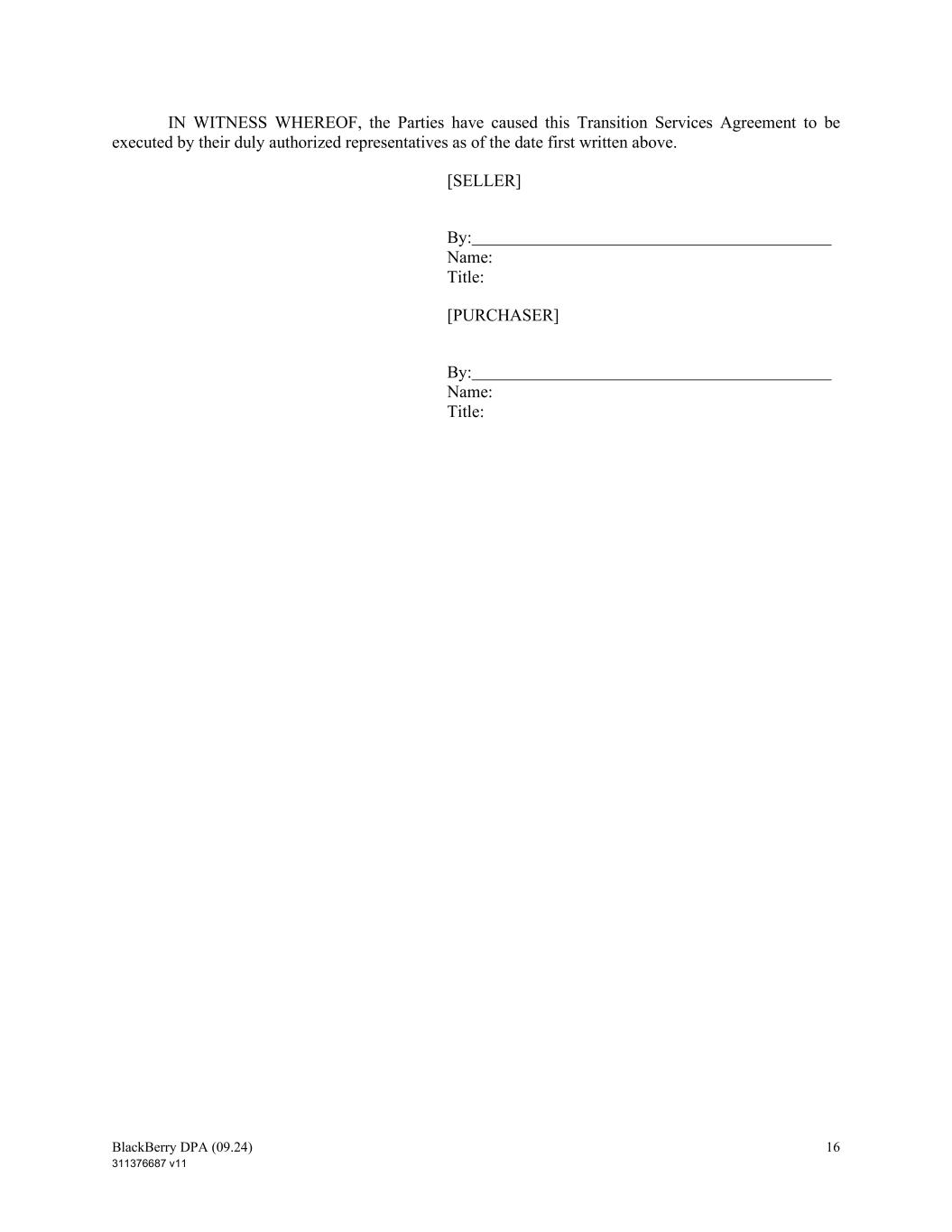311419275 v10 37 Section 4.24 Transferred Subsidiary Operations; Title to Assets; Sufficiency of Assets (a) Part A None. Part B Assets • Cash held in a euro-denominated Bank of America account. • Tax credits related to sales taxes paid and recoverable through VAT tax filings. • Intercompany receivables. • Prepaid Employee Liability Insurance (Worker’s Compensation) through May 31, 2025. • The Transferred Subsidiary is a party to the Contracts (“Transferred Subsidiary Vendor Contracts”) listed or described below: [Redacted: Vendor contracts subject to third party confidentiality obligations.] • Intercompany Services Agreement, dated October 17, 2016, by and between Cylance Inc. and the Transferred Subsidiary, as amended pursuant to Amendment A, dated May 1, 2019. • Intercompany Agreement for transfers of Personal Data, dated December 27, 2022, by and between BlackBerry Limited, the Transferred Subsidiary, and each of the other parties set out in Schedule A thereto. • Commercial Liability Policy No. [Redacted: Vendor contracts subject to third party confidentiality obligations.] • Letter Agreement, by and between the Transferred Subsidiary and each of the following employees: [Redacted: Protected personal information.] • The Cork Lease. • Leasehold improvements and building construction security relating to the Cork Lease. • Computer hardware and IT equipment. • Office supplies, office furniture and equipment. Liabilities • Accounts payables under the Transferred Company Vendor Contracts and intercompany payables. • Accrued liabilities relating to estimated dilapidation on the facility for Project SAS. • Employment-related liabilities, including accrued payroll, employee commissions and benefits. • Accrued liabilities relating to payroll withholdings, which are used to purchase shares in Seller at a 15% discount pursuant to the Employee Share Purchase Plan. • Taxes, including payroll withholding taxes and federal corporation income taxes. • Operating lease liabilities relating to the Cork Lease. (c) • Personal computers and laptops, legal services, corporate management services, finance services, human resource services and sales and marketing services.