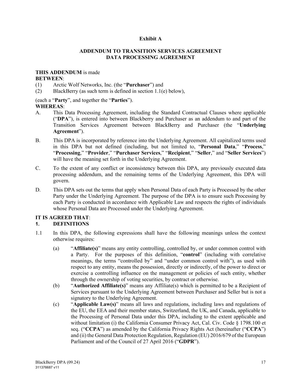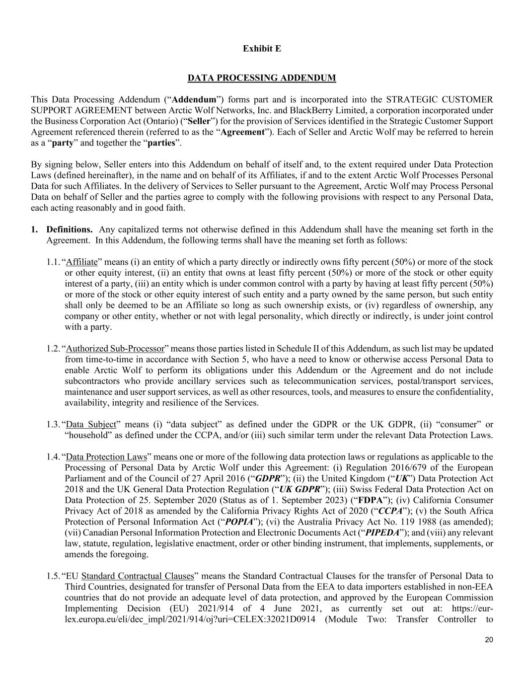 20 Exhibit E DATA PROCESSING ADDENDUM This Data Processing Addendum (“Addendum”) forms part and is incorporated into the STRATEGIC CUSTOMER SUPPORT AGREEMENT between Arctic Wolf Networks, Inc. and BlackBerry Limited, a corporation incorporated under the Business Corporation Act (Ontario) (“Seller”) for the provision of Services identified in the Strategic Customer Support Agreement referenced therein (referred to as the “Agreement”). Each of Seller and Arctic Wolf may be referred to herein as a “party” and together the “parties”. By signing below, Seller enters into this Addendum on behalf of itself and, to the extent required under Data Protection Laws (defined hereinafter), in the name and on behalf of its Affiliates, if and to the extent Arctic Wolf Processes Personal Data for such Affiliates. In the delivery of Services to Seller pursuant to the Agreement, Arctic Wolf may Process Personal Data on behalf of Seller and the parties agree to comply with the following provisions with respect to any Personal Data, each acting reasonably and in good faith. 1. Definitions. Any capitalized terms not otherwise defined in this Addendum shall have the meaning set forth in the Agreement. In this Addendum, the following terms shall have the meaning set forth as follows: 1.1. “Affiliate” means (i) an entity of which a party directly or indirectly owns fifty percent (50%) or more of the stock or other equity interest, (ii) an entity that owns at least fifty percent (50%) or more of the stock or other equity interest of a party, (iii) an entity which is under common control with a party by having at least fifty percent (50%) or more of the stock or other equity interest of such entity and a party owned by the same person, but such entity shall only be deemed to be an Affiliate so long as such ownership exists, or (iv) regardless of ownership, any company or other entity, whether or not with legal personality, which directly or indirectly, is under joint control with a party. 1.2. “Authorized Sub-Processor” means those parties listed in Schedule II of this Addendum, as such list may be updated from time-to-time in accordance with Section 5, who have a need to know or otherwise access Personal Data to enable Arctic Wolf to perform its obligations under this Addendum or the Agreement and do not include subcontractors who provide ancillary services such as telecommunication services, postal/transport services, maintenance and user support services, as well as other resources, tools, and measures to ensure the confidentiality, availability, integrity and resilience of the Services. 1.3. “Data Subject” means (i) “data subject” as defined under the GDPR or the UK GDPR, (ii) “consumer” or “household” as defined under the CCPA, and/or (iii) such similar term under the relevant Data Protection Laws. 1.4. “Data Protection Laws” means one or more of the following data protection laws or regulations as applicable to the Processing of Personal Data by Arctic Wolf under this Agreement: (i) Regulation 2016/679 of the European Parliament and of the Council of 27 April 2016 (“GDPR”); (ii) the United Kingdom (“UK”) Data Protection Act 2018 and the UK General Data Protection Regulation (“UK GDPR”); (iii) Swiss Federal Data Protection Act on Data Protection of 25. September 2020 (Status as of 1. September 2023) (“FDPA”); (iv) California Consumer Privacy Act of 2018 as amended by the California Privacy Rights Act of 2020 (“CCPA”); (v) the South Africa Protection of Personal Information Act (“POPIA”); (vi) the Australia Privacy Act No. 119 1988 (as amended); (vii) Canadian Personal Information Protection and Electronic Documents Act (“PIPEDA”); and (viii) any relevant law, statute, regulation, legislative enactment, order or other binding instrument, that implements, supplements, or amends the foregoing. 1.5. “EU Standard Contractual Clauses” means the Standard Contractual Clauses for the transfer of Personal Data to Third Countries, designated for transfer of Personal Data from the EEA to data importers established in non-EEA countries that do not provide an adequate level of data protection, and approved by the European Commission Implementing Decision (EU) 2021/914 of 4 June 2021, as currently set out at: https://eur- lex.europa.eu/eli/dec_impl/2021/914/oj?uri=CELEX:32021D0914 (Module Two: Transfer Controller to