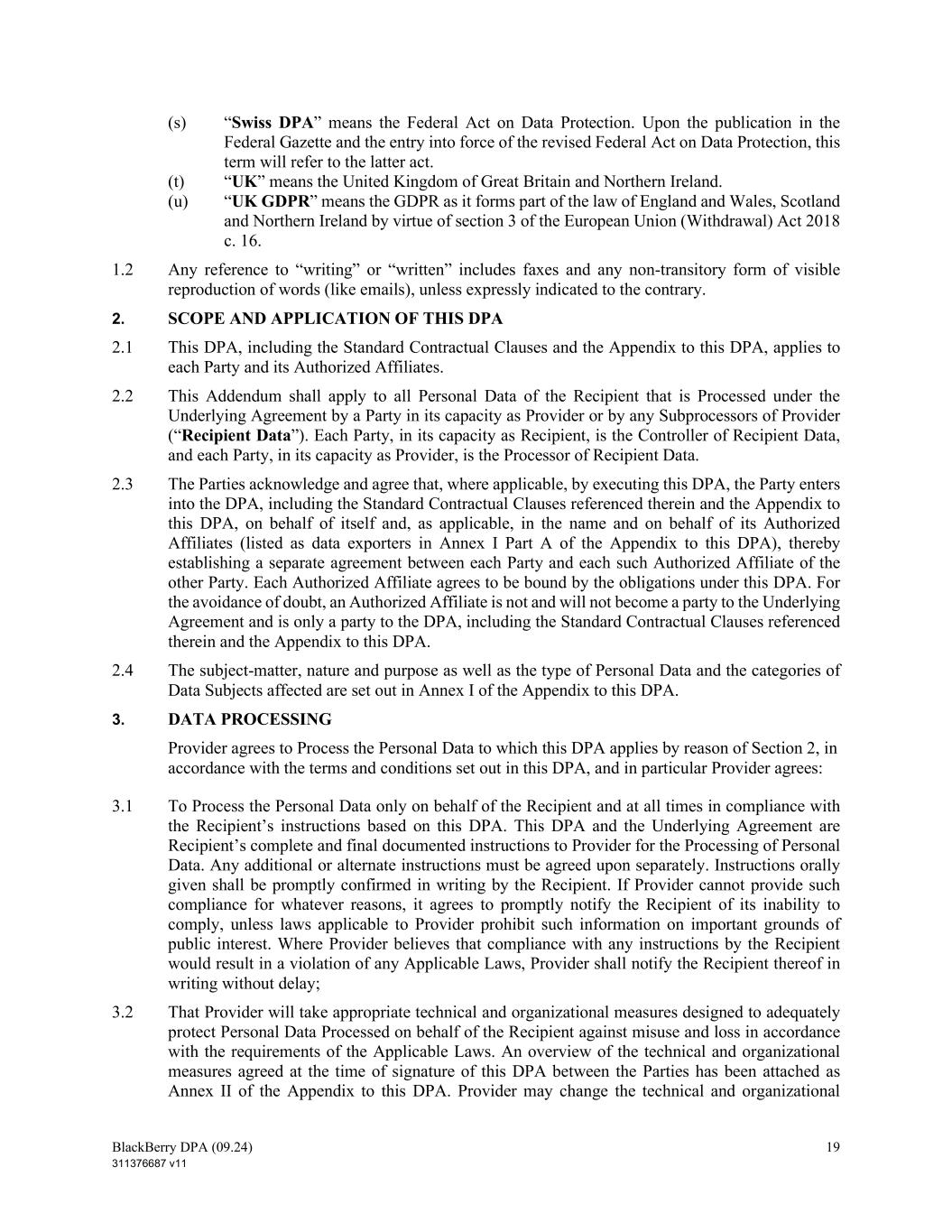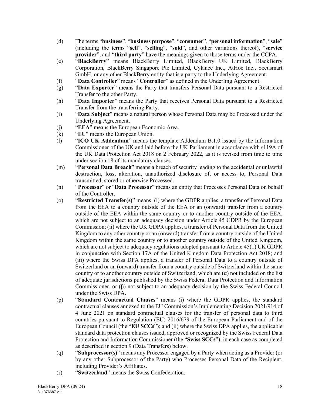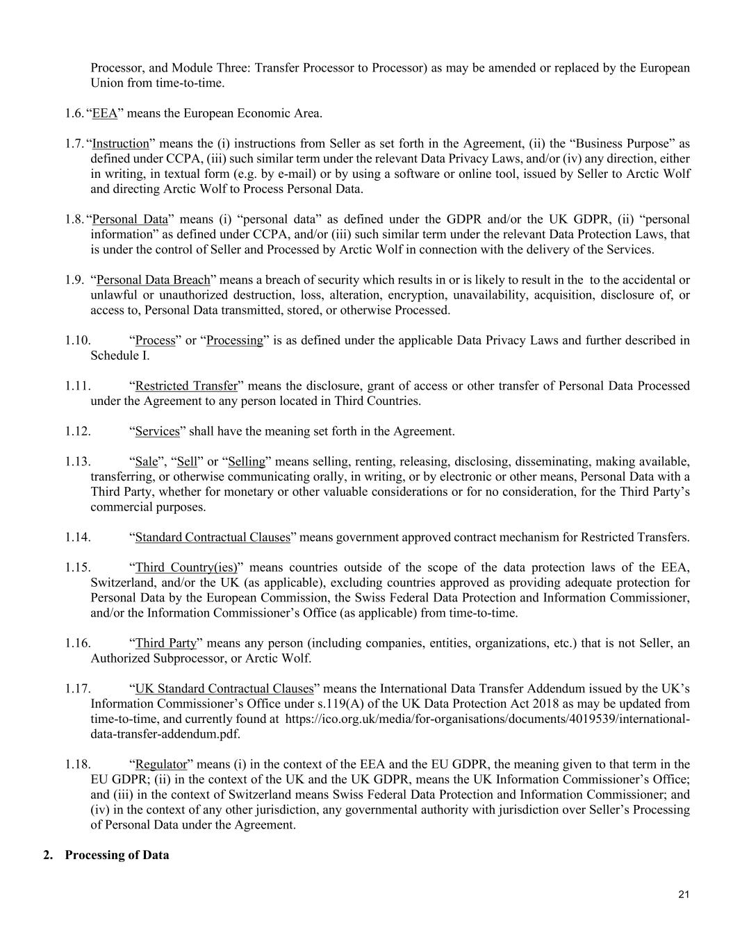21 Processor, and Module Three: Transfer Processor to Processor) as may be amended or replaced by the European Union from time-to-time. 1.6. “EEA” means the European Economic Area. 1.7. “Instruction” means the (i) instructions from Seller as set forth in the Agreement, (ii) the “Business Purpose” as defined under CCPA, (iii) such similar term under the relevant Data Privacy Laws, and/or (iv) any direction, either in writing, in textual form (e.g. by e-mail) or by using a software or online tool, issued by Seller to Arctic Wolf and directing Arctic Wolf to Process Personal Data. 1.8. “Personal Data” means (i) “personal data” as defined under the GDPR and/or the UK GDPR, (ii) “personal information” as defined under CCPA, and/or (iii) such similar term under the relevant Data Protection Laws, that is under the control of Seller and Processed by Arctic Wolf in connection with the delivery of the Services. 1.9. “Personal Data Breach” means a breach of security which results in or is likely to result in the to the accidental or unlawful or unauthorized destruction, loss, alteration, encryption, unavailability, acquisition, disclosure of, or access to, Personal Data transmitted, stored, or otherwise Processed. 1.10. “Process” or “Processing” is as defined under the applicable Data Privacy Laws and further described in Schedule I. 1.11. “Restricted Transfer” means the disclosure, grant of access or other transfer of Personal Data Processed under the Agreement to any person located in Third Countries. 1.12. “Services” shall have the meaning set forth in the Agreement. 1.13. “Sale”, “Sell” or “Selling” means selling, renting, releasing, disclosing, disseminating, making available, transferring, or otherwise communicating orally, in writing, or by electronic or other means, Personal Data with a Third Party, whether for monetary or other valuable considerations or for no consideration, for the Third Party’s commercial purposes. 1.14. “Standard Contractual Clauses” means government approved contract mechanism for Restricted Transfers. 1.15. “Third Country(ies)” means countries outside of the scope of the data protection laws of the EEA, Switzerland, and/or the UK (as applicable), excluding countries approved as providing adequate protection for Personal Data by the European Commission, the Swiss Federal Data Protection and Information Commissioner, and/or the Information Commissioner’s Office (as applicable) from time-to-time. 1.16. “Third Party” means any person (including companies, entities, organizations, etc.) that is not Seller, an Authorized Subprocessor, or Arctic Wolf. 1.17. “UK Standard Contractual Clauses” means the International Data Transfer Addendum issued by the UK’s Information Commissioner’s Office under s.119(A) of the UK Data Protection Act 2018 as may be updated from time-to-time, and currently found at https://ico.org.uk/media/for-organisations/documents/4019539/international- data-transfer-addendum.pdf. 1.18. “Regulator” means (i) in the context of the EEA and the EU GDPR, the meaning given to that term in the EU GDPR; (ii) in the context of the UK and the UK GDPR, means the UK Information Commissioner’s Office; and (iii) in the context of Switzerland means Swiss Federal Data Protection and Information Commissioner; and (iv) in the context of any other jurisdiction, any governmental authority with jurisdiction over Seller’s Processing of Personal Data under the Agreement. 2. Processing of Data