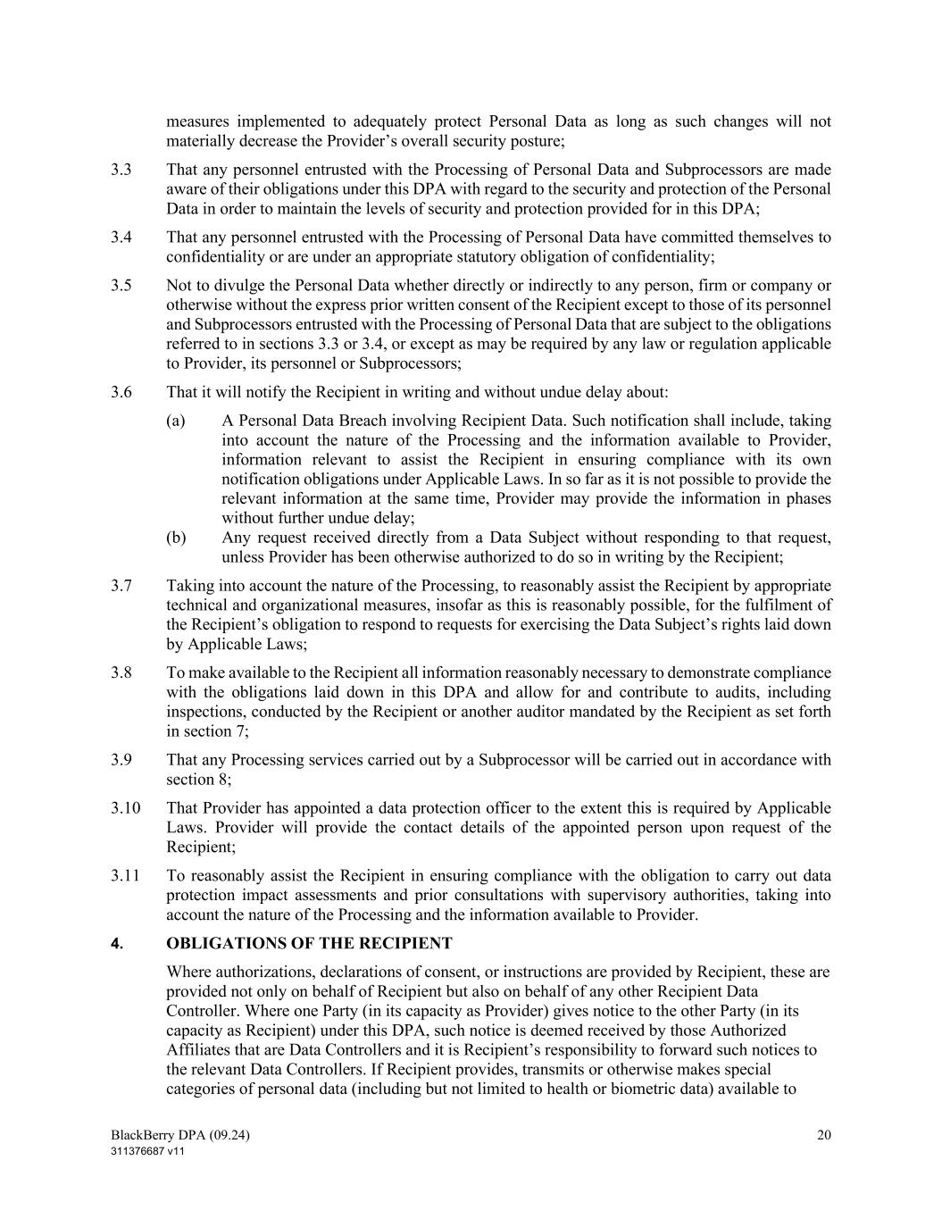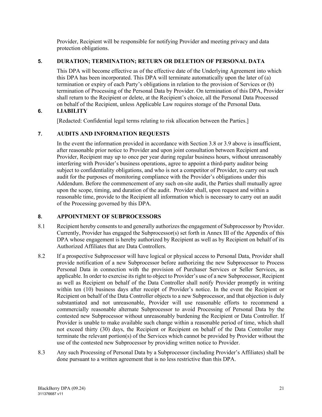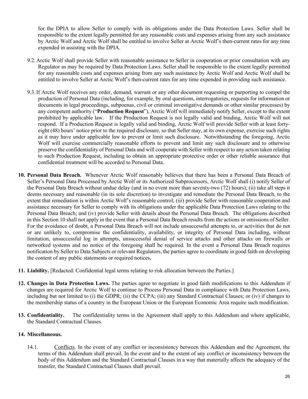 26 for the DPIA to allow Seller to comply with its obligations under the Data Protection Laws. Seller shall be responsible to the extent legally permitted for any reasonable costs and expenses arising from any such assistance by Arctic Wolf and Arctic Wolf shall be entitled to involve Seller at Arctic Wolf’s then-current rates for any time expended in assisting with the DPIA. 9.2. Arctic Wolf shall provide Seller with reasonable assistance to Seller in cooperation or prior consultation with any Regulator as may be required by Data Protection Laws. Seller shall be responsible to the extent legally permitted for any reasonable costs and expenses arising from any such assistance by Arctic Wolf and Arctic Wolf shall be entitled to involve Seller at Arctic Wolf’s then-current rates for any time expended in providing such assistance. 9.3. If Arctic Wolf receives any order, demand, warrant or any other document requesting or purporting to compel the production of Personal Data (including, for example, by oral questions, interrogatories, requests for information or documents in legal proceedings, subpoenas, civil or criminal investigative demands or other similar processes) by any competent authority (“Production Request”), Arctic Wolf will immediately notify Seller, except to the extent prohibited by applicable law. If the Production Request is not legally valid and binding, Arctic Wolf will not respond. If a Production Request is legally valid and binding, Arctic Wolf will provide Seller with at least forty- eight (48) hours’ notice prior to the required disclosure, so that Seller may, at its own expense, exercise such rights as it may have under applicable law to prevent or limit such disclosure. Notwithstanding the foregoing, Arctic Wolf will exercise commercially reasonable efforts to prevent and limit any such disclosure and to otherwise preserve the confidentiality of Personal Data and will cooperate with Seller with respect to any action taken relating to such Production Request, including to obtain an appropriate protective order or other reliable assurance that confidential treatment will be accorded to Personal Data. 10. Personal Data Breach. Whenever Arctic Wolf reasonably believes that there has been a Personal Data Breach of Seller’s Personal Data Processed by Arctic Wolf or its Authorized Subprocessors, Arctic Wolf shall (i) notify Seller of the Personal Data Breach without undue delay (and in no event more than seventy-two (72) hours); (ii) take all steps it deems necessary and reasonable (in its sole discretion) to investigate and remediate the Personal Data Breach, to the extent that remediation is within Arctic Wolf’s reasonable control; (iii) provide Seller with reasonable cooperation and assistance necessary for Seller to comply with its obligations under the applicable Data Protection Laws relating to the Personal Data Breach; and (iv) provide Seller with details about the Personal Data Breach. The obligations described in this Section 10 shall not apply in the event that a Personal Data Breach results from the actions or omissions of Seller. For the avoidance of doubt, a Personal Data Breach will not include unsuccessful attempts to, or activities that do not or are unlikely to, compromise the confidentiality, availability, or integrity of Personal Data including, without limitation, unsuccessful log in attempts, unsuccessful denial of service attacks and other attacks on firewalls or networked systems and no notice of the foregoing shall be required. In the event a Personal Data Breach requires notification by Seller to Data Subjects or relevant Regulators, the parties agree to coordinate in good faith on developing the content of any public statements or required notices. 11. Liability. [Redacted: Confidential legal terms relating to risk allocation between the Parties.] 12. Changes in Data Protection Laws. The parties agree to negotiate in good faith modifications to this Addendum if changes are required for Arctic Wolf to continue to Process Personal Data in compliance with Data Protection Laws, including but not limited to (i) the GDPR; (ii) the CCPA; (iii) any Standard Contractual Clauses; or (iv) if changes to the membership status of a country in the European Union or the European Economic Area require such modification. 13. Confidentiality. The confidentiality terms in the Agreement shall apply to this Addendum and where applicable, the Standard Contractual Clauses. 14. Miscellaneous. 14.1. Conflicts. In the event of any conflict or inconsistency between this Addendum and the Agreement, the terms of this Addendum shall prevail. In the event and to the extent of any conflict or inconsistency between the body of this Addendum and the Standard Contractual Clauses in a way that materially affects the adequacy of the transfer, the Standard Contractual Clauses shall prevail.
