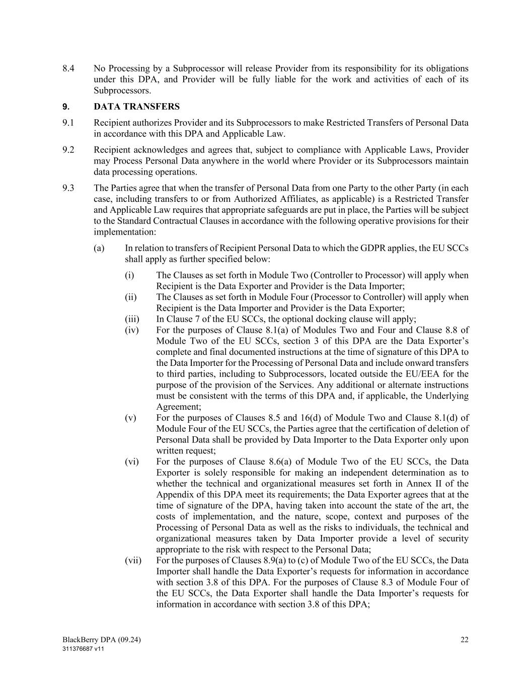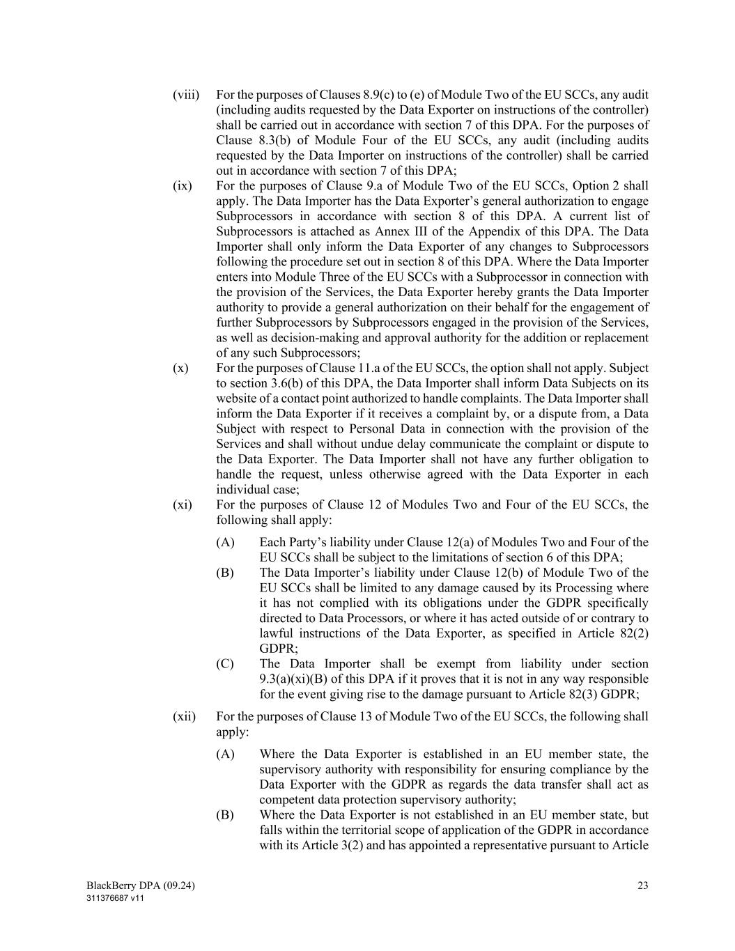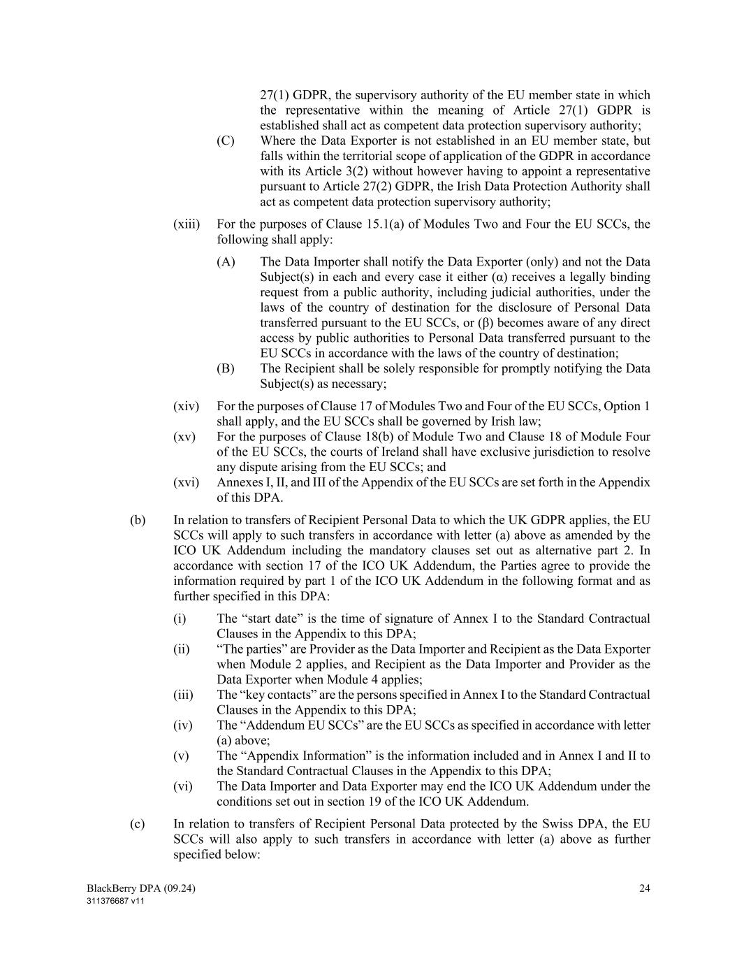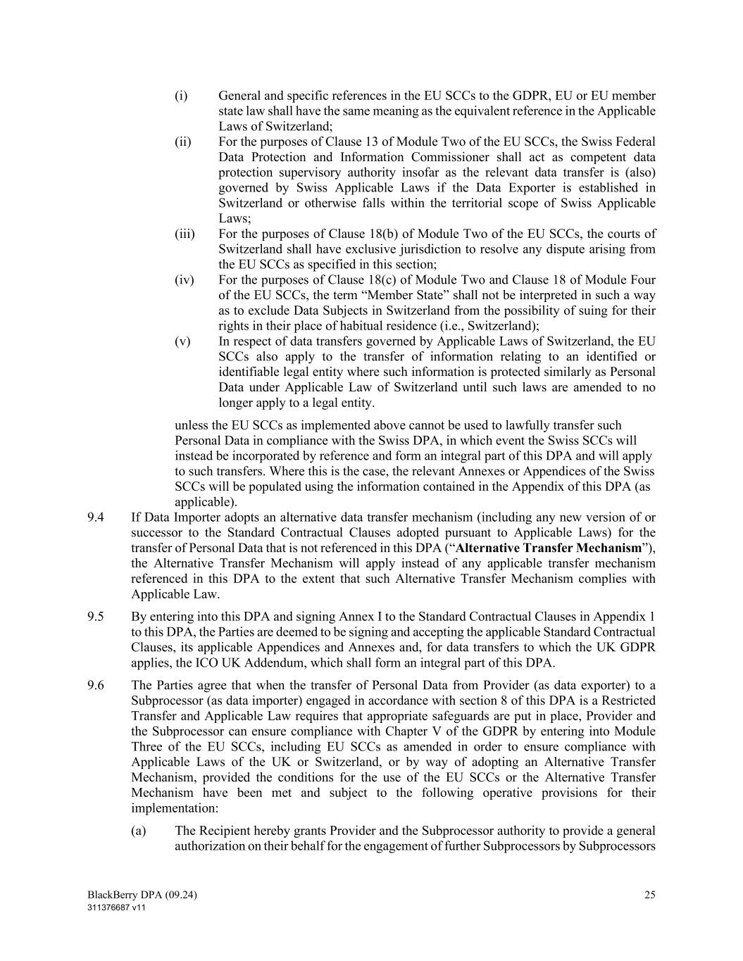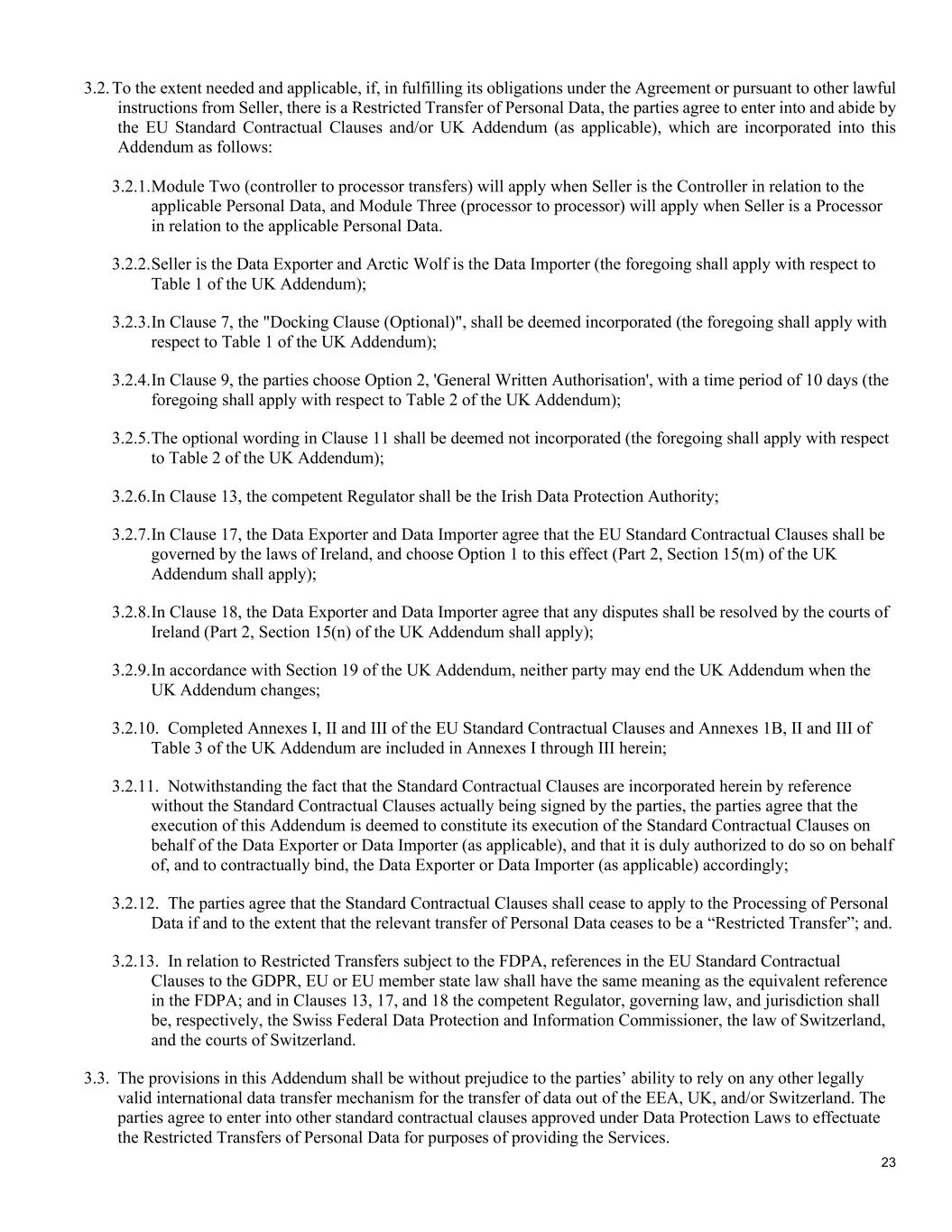 23 3.2. To the extent needed and applicable, if, in fulfilling its obligations under the Agreement or pursuant to other lawful instructions from Seller, there is a Restricted Transfer of Personal Data, the parties agree to enter into and abide by the EU Standard Contractual Clauses and/or UK Addendum (as applicable), which are incorporated into this Addendum as follows: 3.2.1. Module Two (controller to processor transfers) will apply when Seller is the Controller in relation to the applicable Personal Data, and Module Three (processor to processor) will apply when Seller is a Processor in relation to the applicable Personal Data. 3.2.2. Seller is the Data Exporter and Arctic Wolf is the Data Importer (the foregoing shall apply with respect to Table 1 of the UK Addendum); 3.2.3. In Clause 7, the "Docking Clause (Optional)", shall be deemed incorporated (the foregoing shall apply with respect to Table 1 of the UK Addendum); 3.2.4. In Clause 9, the parties choose Option 2, 'General Written Authorisation', with a time period of 10 days (the foregoing shall apply with respect to Table 2 of the UK Addendum); 3.2.5. The optional wording in Clause 11 shall be deemed not incorporated (the foregoing shall apply with respect to Table 2 of the UK Addendum); 3.2.6. In Clause 13, the competent Regulator shall be the Irish Data Protection Authority; 3.2.7. In Clause 17, the Data Exporter and Data Importer agree that the EU Standard Contractual Clauses shall be governed by the laws of Ireland, and choose Option 1 to this effect (Part 2, Section 15(m) of the UK Addendum shall apply); 3.2.8. In Clause 18, the Data Exporter and Data Importer agree that any disputes shall be resolved by the courts of Ireland (Part 2, Section 15(n) of the UK Addendum shall apply); 3.2.9. In accordance with Section 19 of the UK Addendum, neither party may end the UK Addendum when the UK Addendum changes; 3.2.10. Completed Annexes I, II and III of the EU Standard Contractual Clauses and Annexes 1B, II and III of Table 3 of the UK Addendum are included in Annexes I through III herein; 3.2.11. Notwithstanding the fact that the Standard Contractual Clauses are incorporated herein by reference without the Standard Contractual Clauses actually being signed by the parties, the parties agree that the execution of this Addendum is deemed to constitute its execution of the Standard Contractual Clauses on behalf of the Data Exporter or Data Importer (as applicable), and that it is duly authorized to do so on behalf of, and to contractually bind, the Data Exporter or Data Importer (as applicable) accordingly; 3.2.12. The parties agree that the Standard Contractual Clauses shall cease to apply to the Processing of Personal Data if and to the extent that the relevant transfer of Personal Data ceases to be a “Restricted Transfer”; and. 3.2.13. In relation to Restricted Transfers subject to the FDPA, references in the EU Standard Contractual Clauses to the GDPR, EU or EU member state law shall have the same meaning as the equivalent reference in the FDPA; and in Clauses 13, 17, and 18 the competent Regulator, governing law, and jurisdiction shall be, respectively, the Swiss Federal Data Protection and Information Commissioner, the law of Switzerland, and the courts of Switzerland. 3.3. The provisions in this Addendum shall be without prejudice to the parties’ ability to rely on any other legally valid international data transfer mechanism for the transfer of data out of the EEA, UK, and/or Switzerland. The parties agree to enter into other standard contractual clauses approved under Data Protection Laws to effectuate the Restricted Transfers of Personal Data for purposes of providing the Services.