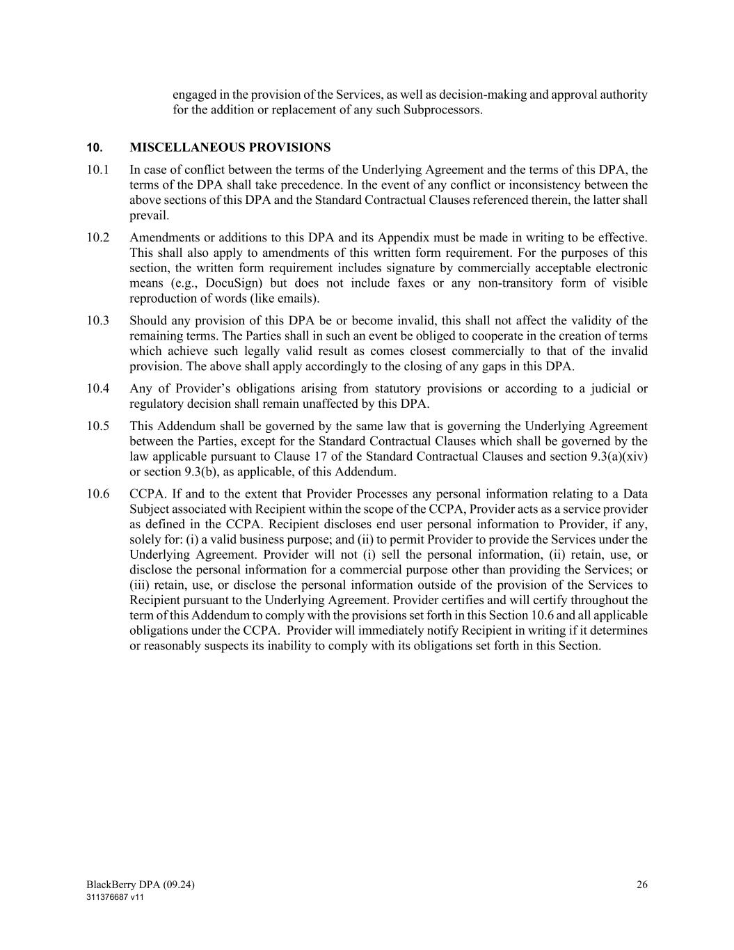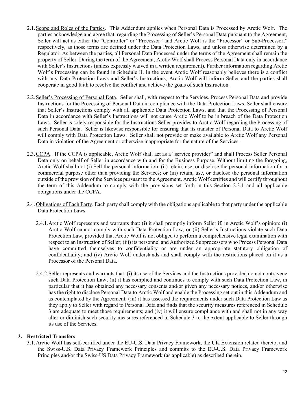 22 2.1. Scope and Roles of the Parties. This Addendum applies when Personal Data is Processed by Arctic Wolf. The parties acknowledge and agree that, regarding the Processing of Seller’s Personal Data pursuant to the Agreement, Seller will act as either the “Controller” or “Processor” and Arctic Wolf is the “Processor” or Sub-Processor,” respectively, as those terms are defined under the Data Protection Laws, and unless otherwise determined by a Regulator. As between the parties, all Personal Data Processed under the terms of the Agreement shall remain the property of Seller. During the term of the Agreement, Arctic Wolf shall Process Personal Data only in accordance with Seller’s Instructions (unless expressly waived in a written requirement). Further information regarding Arctic Wolf’s Processing can be found in Schedule II. In the event Arctic Wolf reasonably believes there is a conflict with any Data Protection Laws and Seller’s Instructions, Arctic Wolf will inform Seller and the parties shall cooperate in good faith to resolve the conflict and achieve the goals of such Instruction. 2.2. Seller’s Processing of Personal Data. Seller shall, with respect to the Services, Process Personal Data and provide Instructions for the Processing of Personal Data in compliance with the Data Protection Laws. Seller shall ensure that Seller’s Instructions comply with all applicable Data Protection Laws, and that the Processing of Personal Data in accordance with Seller’s Instructions will not cause Arctic Wolf to be in breach of the Data Protection Laws. Seller is solely responsible for the Instructions Seller provides to Arctic Wolf regarding the Processing of such Personal Data. Seller is likewise responsible for ensuring that its transfer of Personal Data to Arctic Wolf will comply with Data Protection Laws. Seller shall not provide or make available to Arctic Wolf any Personal Data in violation of the Agreement or otherwise inappropriate for the nature of the Services. 2.3. CCPA. If the CCPA is applicable, Arctic Wolf shall act as a “service provider” and shall Process Seller Personal Data only on behalf of Seller in accordance with and for the Business Purpose. Without limiting the foregoing, Arctic Wolf shall not (i) Sell the personal information, (ii) retain, use, or disclose the personal information for a commercial purpose other than providing the Services; or (iii) retain, use, or disclose the personal information outside of the provision of the Services pursuant to the Agreement. Arctic Wolf certifies and will certify throughout the term of this Addendum to comply with the provisions set forth in this Section 2.3.1 and all applicable obligations under the CCPA. 2.4. Obligations of Each Party. Each party shall comply with the obligations applicable to that party under the applicable Data Protection Laws. 2.4.1. Arctic Wolf represents and warrants that: (i) it shall promptly inform Seller if, in Arctic Wolf’s opinion: (i) Arctic Wolf cannot comply with such Data Protection Law, or (ii) Seller’s Instructions violate such Data Protection Law, provided that Arctic Wolf is not obliged to perform a comprehensive legal examination with respect to an Instruction of Seller; (iii) its personnel and Authorized Subprocessors who Process Personal Data have committed themselves to confidentiality or are under an appropriate statutory obligation of confidentiality; and (iv) Arctic Wolf understands and shall comply with the restrictions placed on it as a Processor of the Personal Data. 2.4.2. Seller represents and warrants that: (i) its use of the Services and the Instructions provided do not contravene such Data Protection Law; (ii) it has complied and continues to comply with such Data Protection Law, in particular that it has obtained any necessary consents and/or given any necessary notices, and/or otherwise has the right to disclose Personal Data to Arctic Wolf and enable the Processing set out in this Addendum and as contemplated by the Agreement; (iii) it has assessed the requirements under such Data Protection Law as they apply to Seller with regard to Personal Data and finds that the security measures referenced in Schedule 3 are adequate to meet those requirements; and (iv) it will ensure compliance with and shall not in any way alter or diminish such security measures referenced in Schedule 3 to the extent applicable to Seller through its use of the Services. 3. Restricted Transfers. 3.1. Arctic Wolf has self-certified under the EU-U.S. Data Privacy Framework, the UK Extension related thereto, and the Swiss-U.S. Data Privacy Framework Principles and commits to the EU-U.S. Data Privacy Framework Principles and/or the Swiss-US Data Privacy Framework (as applicable) as described therein.