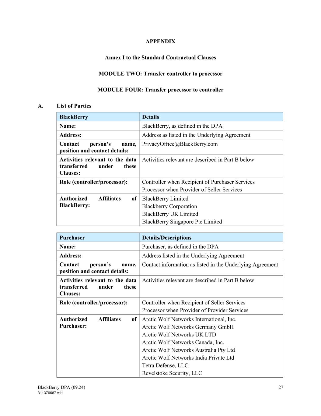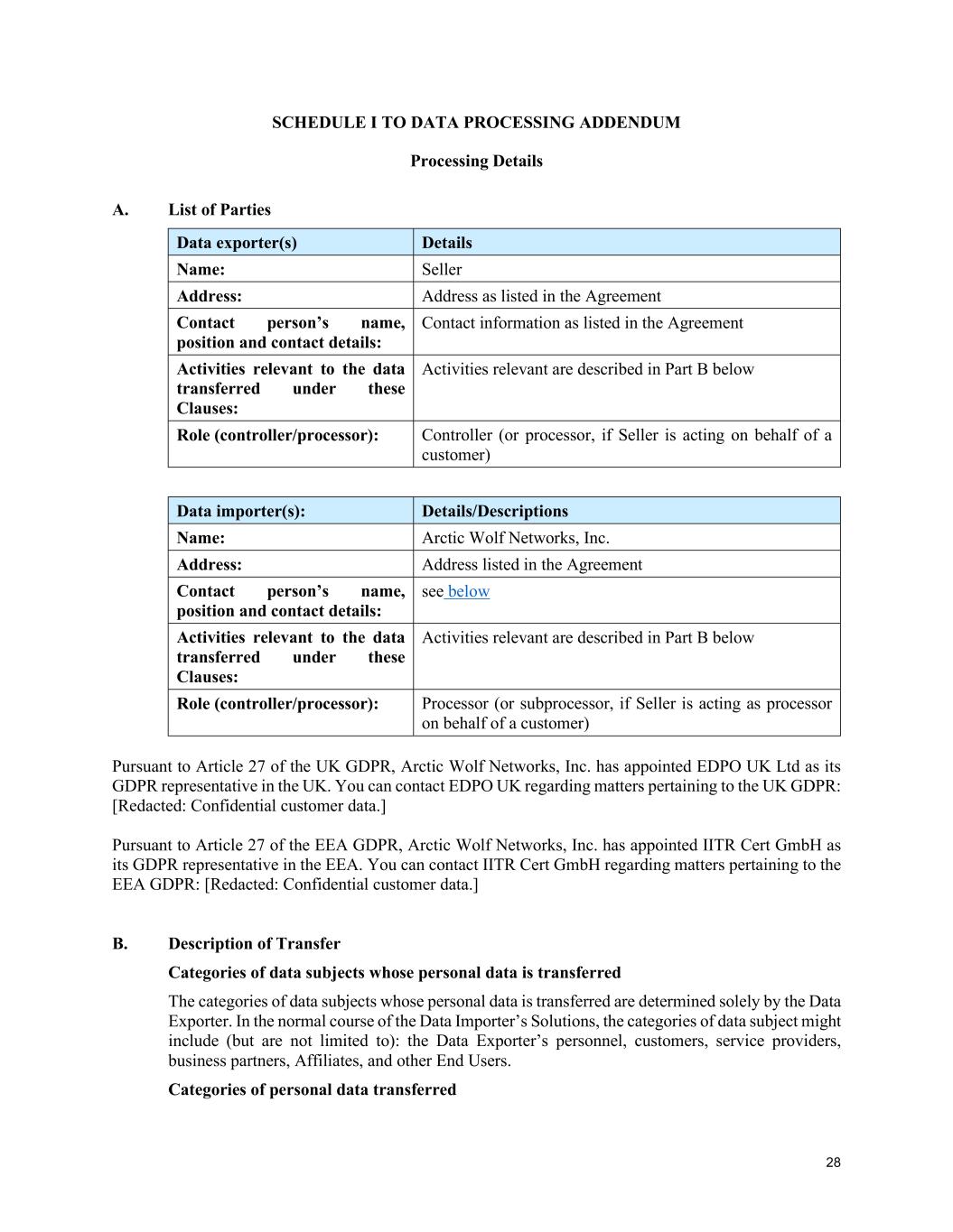 28 SCHEDULE I TO DATA PROCESSING ADDENDUM Processing Details A. List of Parties Data exporter(s) Details Name: Seller Address: Address as listed in the Agreement Contact person’s name, position and contact details: Contact information as listed in the Agreement Activities relevant to the data transferred under these Clauses: Activities relevant are described in Part B below Role (controller/processor): Controller (or processor, if Seller is acting on behalf of a customer) Data importer(s): Details/Descriptions Name: Arctic Wolf Networks, Inc. Address: Address listed in the Agreement Contact person’s name, position and contact details: see below Activities relevant to the data transferred under these Clauses: Activities relevant are described in Part B below Role (controller/processor): Processor (or subprocessor, if Seller is acting as processor on behalf of a customer) Pursuant to Article 27 of the UK GDPR, Arctic Wolf Networks, Inc. has appointed EDPO UK Ltd as its GDPR representative in the UK. You can contact EDPO UK regarding matters pertaining to the UK GDPR: [Redacted: Confidential customer data.] Pursuant to Article 27 of the EEA GDPR, Arctic Wolf Networks, Inc. has appointed IITR Cert GmbH as its GDPR representative in the EEA. You can contact IITR Cert GmbH regarding matters pertaining to the EEA GDPR: [Redacted: Confidential customer data.] B. Description of Transfer Categories of data subjects whose personal data is transferred The categories of data subjects whose personal data is transferred are determined solely by the Data Exporter. In the normal course of the Data Importer’s Solutions, the categories of data subject might include (but are not limited to): the Data Exporter’s personnel, customers, service providers, business partners, Affiliates, and other End Users. Categories of personal data transferred