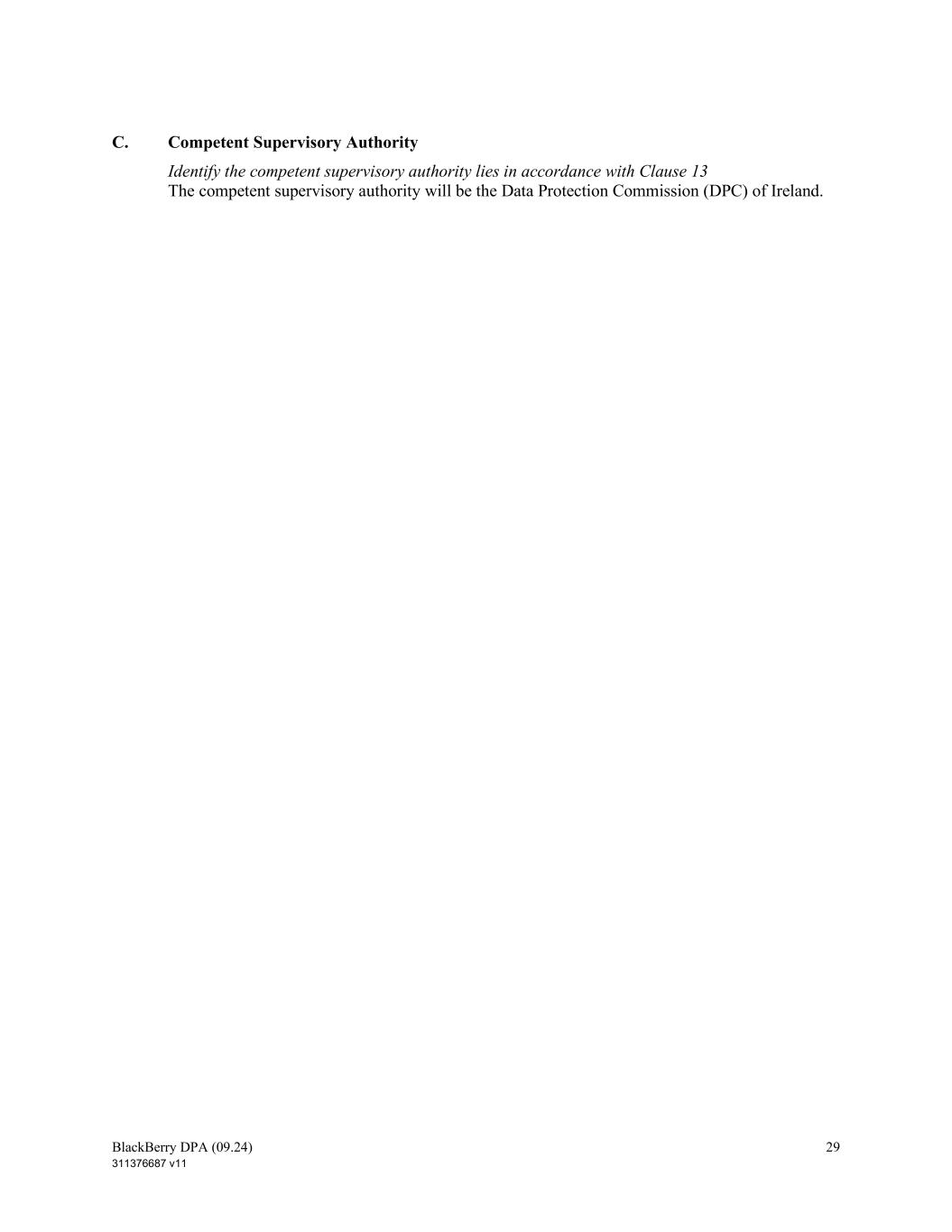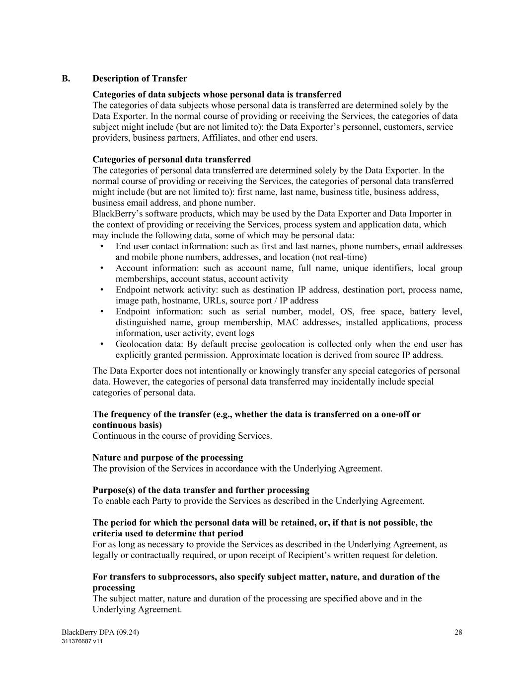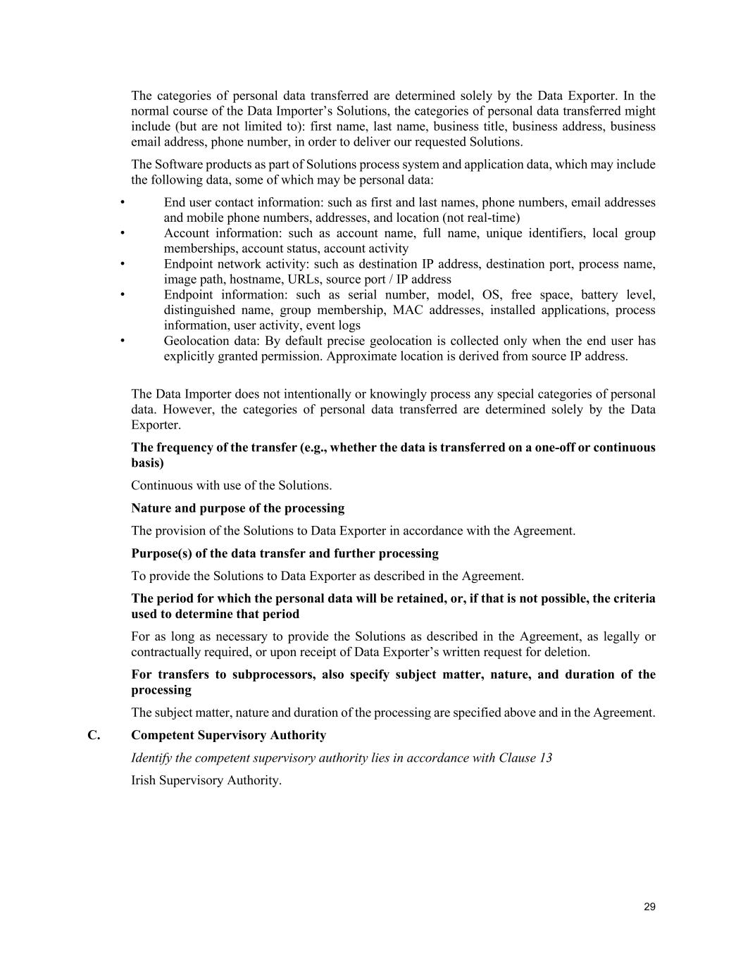 29 The categories of personal data transferred are determined solely by the Data Exporter. In the normal course of the Data Importer’s Solutions, the categories of personal data transferred might include (but are not limited to): first name, last name, business title, business address, business email address, phone number, in order to deliver our requested Solutions. The Software products as part of Solutions process system and application data, which may include the following data, some of which may be personal data: • End user contact information: such as first and last names, phone numbers, email addresses and mobile phone numbers, addresses, and location (not real-time) • Account information: such as account name, full name, unique identifiers, local group memberships, account status, account activity • Endpoint network activity: such as destination IP address, destination port, process name, image path, hostname, URLs, source port / IP address • Endpoint information: such as serial number, model, OS, free space, battery level, distinguished name, group membership, MAC addresses, installed applications, process information, user activity, event logs • Geolocation data: By default precise geolocation is collected only when the end user has explicitly granted permission. Approximate location is derived from source IP address. The Data Importer does not intentionally or knowingly process any special categories of personal data. However, the categories of personal data transferred are determined solely by the Data Exporter. The frequency of the transfer (e.g., whether the data is transferred on a one-off or continuous basis) Continuous with use of the Solutions. Nature and purpose of the processing The provision of the Solutions to Data Exporter in accordance with the Agreement. Purpose(s) of the data transfer and further processing To provide the Solutions to Data Exporter as described in the Agreement. The period for which the personal data will be retained, or, if that is not possible, the criteria used to determine that period For as long as necessary to provide the Solutions as described in the Agreement, as legally or contractually required, or upon receipt of Data Exporter’s written request for deletion. For transfers to subprocessors, also specify subject matter, nature, and duration of the processing The subject matter, nature and duration of the processing are specified above and in the Agreement. C. Competent Supervisory Authority Identify the competent supervisory authority lies in accordance with Clause 13 Irish Supervisory Authority.