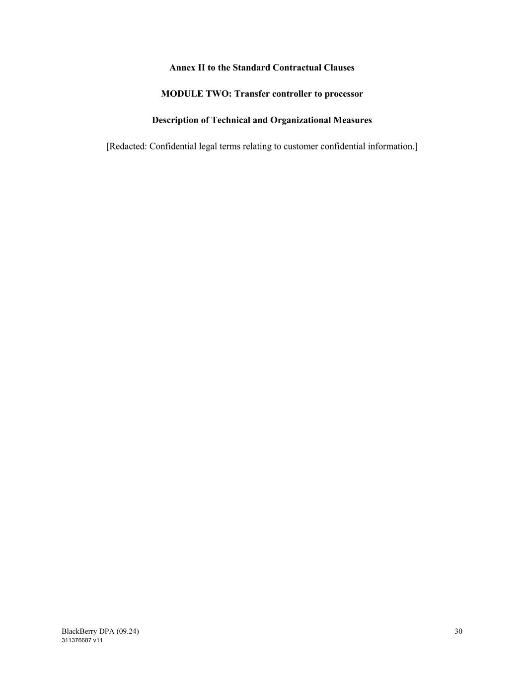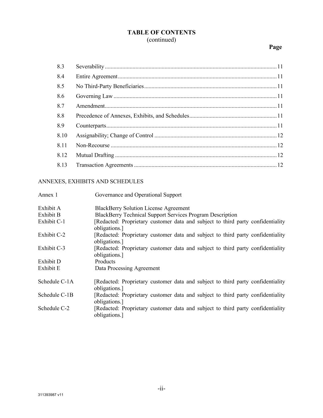 10 None. (B) • BlackBerry Sales Incentive Compensation Plan • BlackBerry FY25 Variable Incentive Pay Program (x) None. (xi) None. (xii) None. (xiii) None. (xiv) None. (xv) None. (xvi) • Contracts with each of the persons set forth in Annex 4.9(b)(xvi) attached hereto. [Redacted: Proprietary customer data and subject to third party confidentiality obligations.] (xvii) None. (xviii) None. (xix) None. (c) (iii) The following disclosure is made for informational purposes only and shall in no way affect any rights to indemnification under the Agreement that may arise in connection with such matter, if any: • [Redacted: Commercially sensitive third-party information subject to third party confidentiality obligations.] (d)