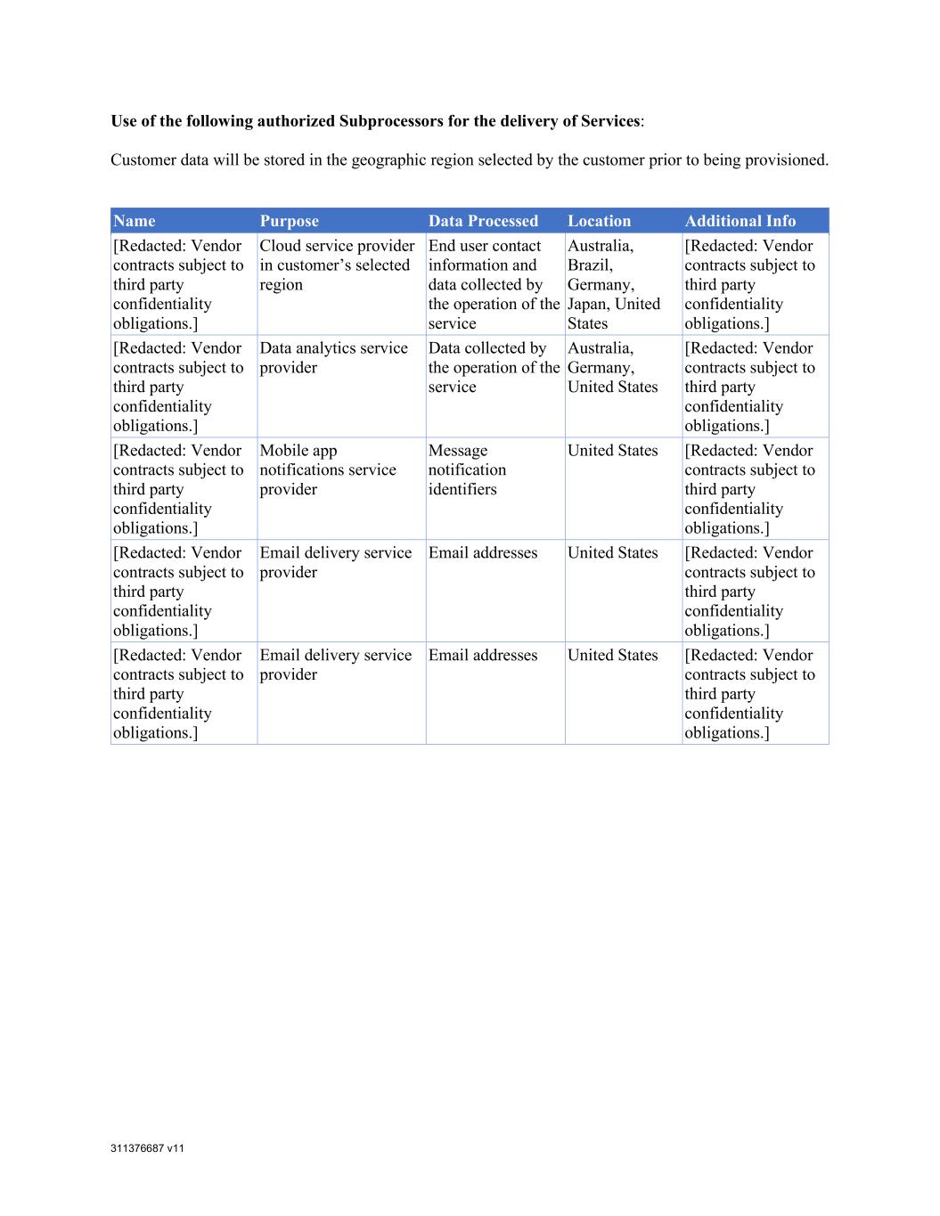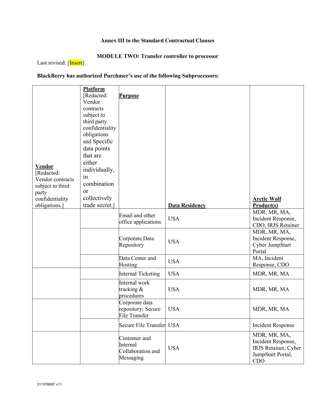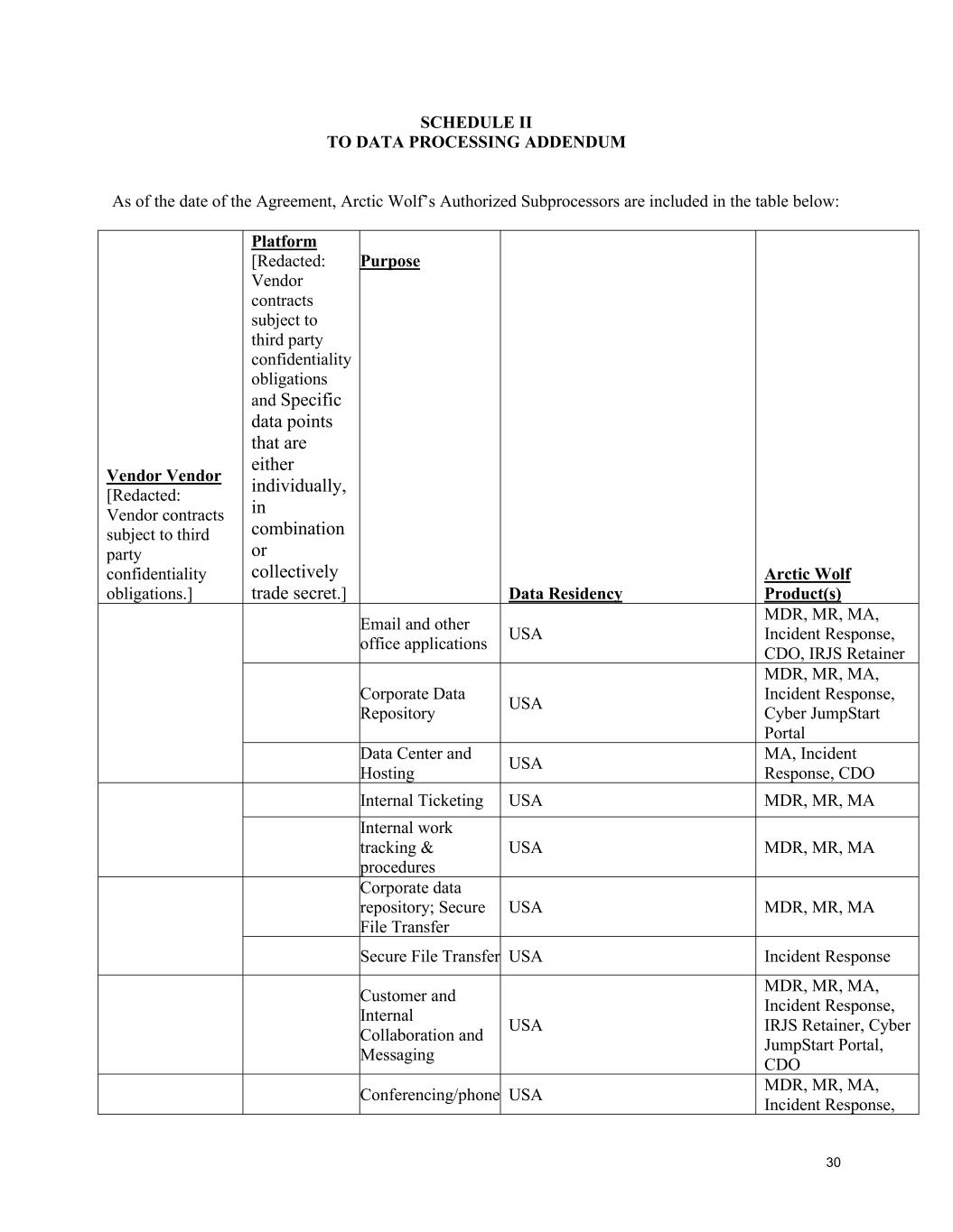 30 SCHEDULE II TO DATA PROCESSING ADDENDUM As of the date of the Agreement, Arctic Wolf’s Authorized Subprocessors are included in the table below: Vendor Vendor [Redacted: Vendor contracts subject to third party confidentiality obligations.] Platform [Redacted: Vendor contracts subject to third party confidentiality obligations and Specific data points that are either individually, in combination or collectively trade secret.] Purpose Data Residency Arctic Wolf Product(s) Email and other office applications USA MDR, MR, MA, Incident Response, CDO, IRJS Retainer Corporate Data Repository USA MDR, MR, MA, Incident Response, Cyber JumpStart Portal Data Center and Hosting USA MA, Incident Response, CDO Internal Ticketing USA MDR, MR, MA Internal work tracking & procedures USA MDR, MR, MA Corporate data repository; Secure File Transfer USA MDR, MR, MA Secure File Transfer USA Incident Response Customer and Internal Collaboration and Messaging USA MDR, MR, MA, Incident Response, IRJS Retainer, Cyber JumpStart Portal, CDO Conferencing/phone USA MDR, MR, MA, Incident Response,