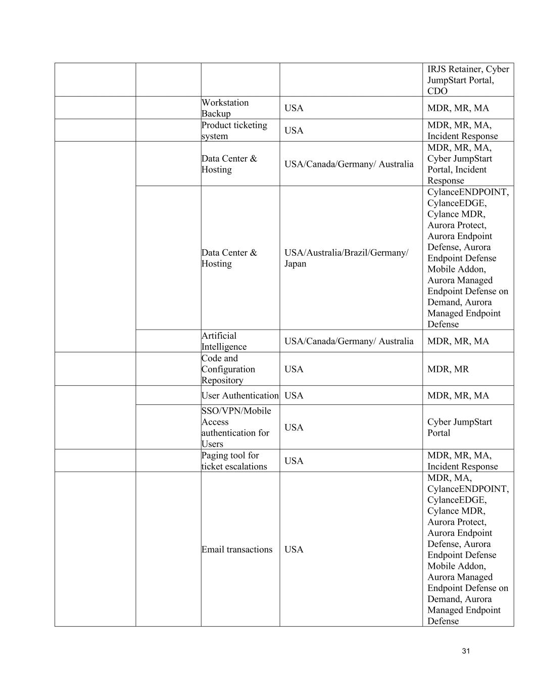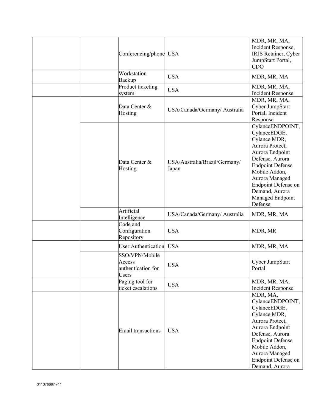 31 IRJS Retainer, Cyber JumpStart Portal, CDO Workstation Backup USA MDR, MR, MA Product ticketing system USA MDR, MR, MA, Incident Response Data Center & Hosting USA/Canada/Germany/ Australia MDR, MR, MA, Cyber JumpStart Portal, Incident Response Data Center & Hosting USA/Australia/Brazil/Germany/ Japan CylanceENDPOINT, CylanceEDGE, Cylance MDR, Aurora Protect, Aurora Endpoint Defense, Aurora Endpoint Defense Mobile Addon, Aurora Managed Endpoint Defense on Demand, Aurora Managed Endpoint Defense Artificial Intelligence USA/Canada/Germany/ Australia MDR, MR, MA Code and Configuration Repository USA MDR, MR User Authentication USA MDR, MR, MA SSO/VPN/Mobile Access authentication for Users USA Cyber JumpStart Portal Paging tool for ticket escalations USA MDR, MR, MA, Incident Response Email transactions USA MDR, MA, CylanceENDPOINT, CylanceEDGE, Cylance MDR, Aurora Protect, Aurora Endpoint Defense, Aurora Endpoint Defense Mobile Addon, Aurora Managed Endpoint Defense on Demand, Aurora Managed Endpoint Defense