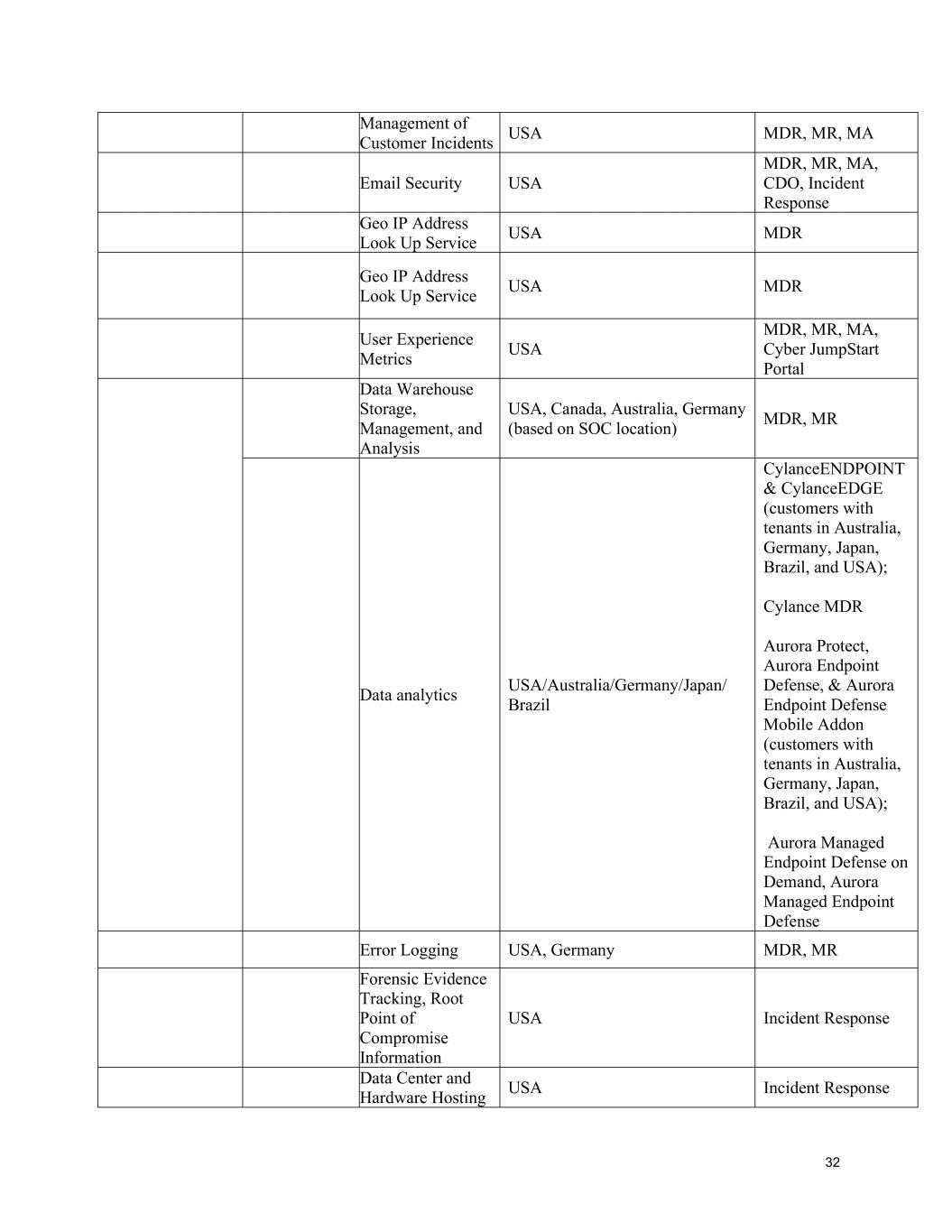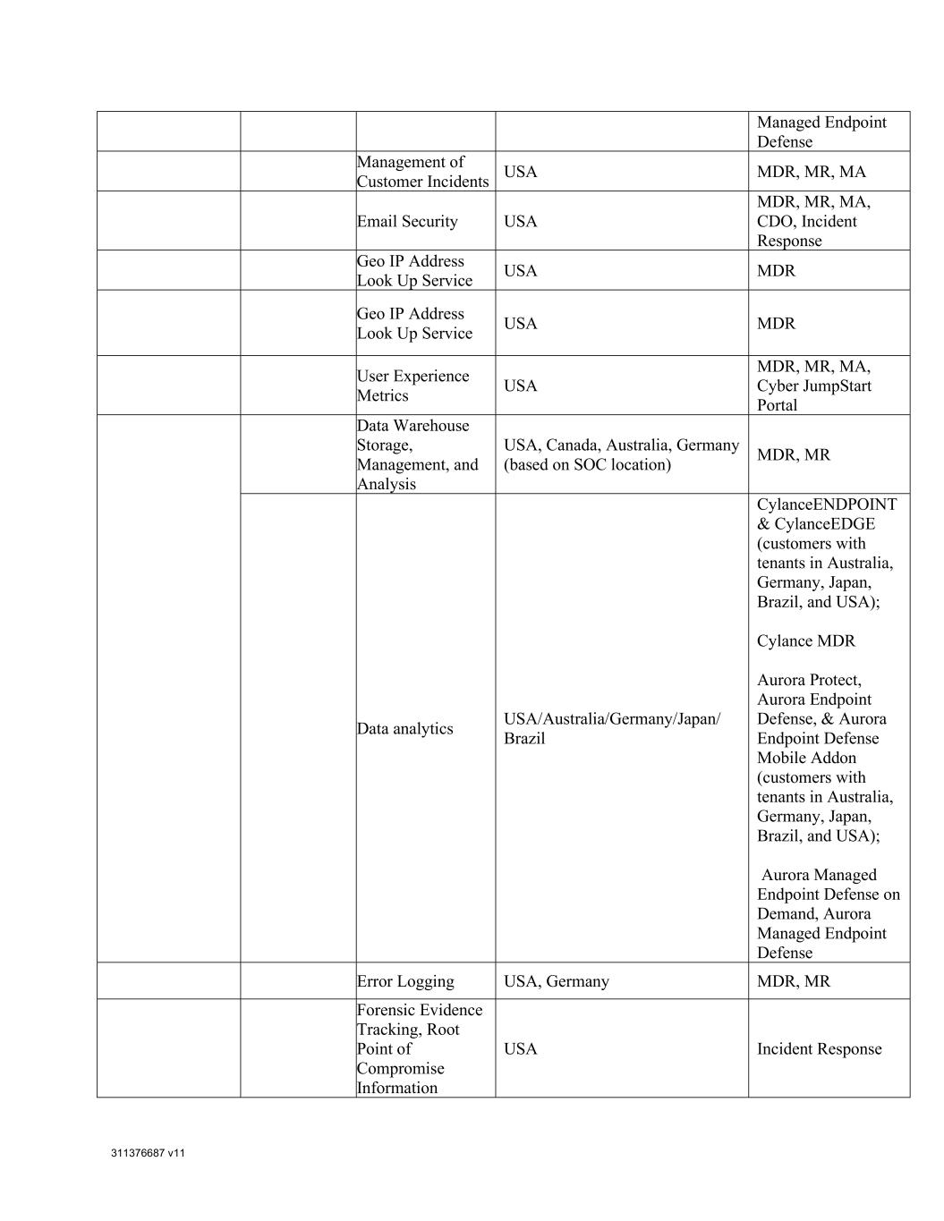 32 Management of Customer Incidents USA MDR, MR, MA Email Security USA MDR, MR, MA, CDO, Incident Response Geo IP Address Look Up Service USA MDR Geo IP Address Look Up Service USA MDR User Experience Metrics USA MDR, MR, MA, Cyber JumpStart Portal Data Warehouse Storage, Management, and Analysis USA, Canada, Australia, Germany (based on SOC location) MDR, MR Data analytics USA/Australia/Germany/Japan/ Brazil CylanceENDPOINT & CylanceEDGE (customers with tenants in Australia, Germany, Japan, Brazil, and USA); Cylance MDR Aurora Protect, Aurora Endpoint Defense, & Aurora Endpoint Defense Mobile Addon (customers with tenants in Australia, Germany, Japan, Brazil, and USA); Aurora Managed Endpoint Defense on Demand, Aurora Managed Endpoint Defense Error Logging USA, Germany MDR, MR Forensic Evidence Tracking, Root Point of Compromise Information USA Incident Response Data Center and Hardware Hosting USA Incident Response