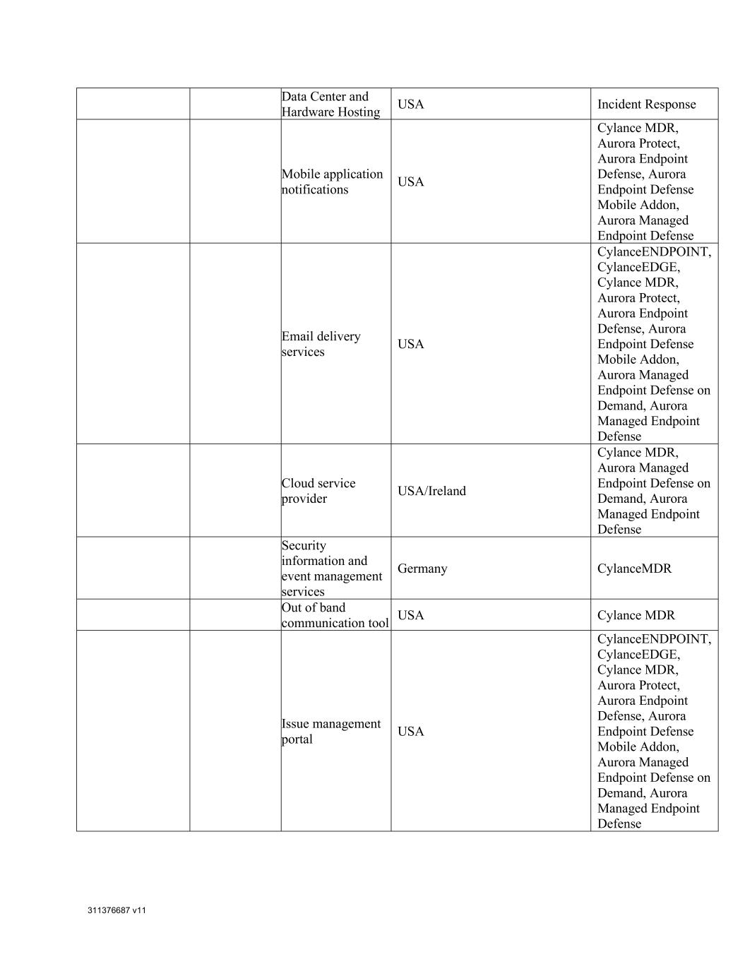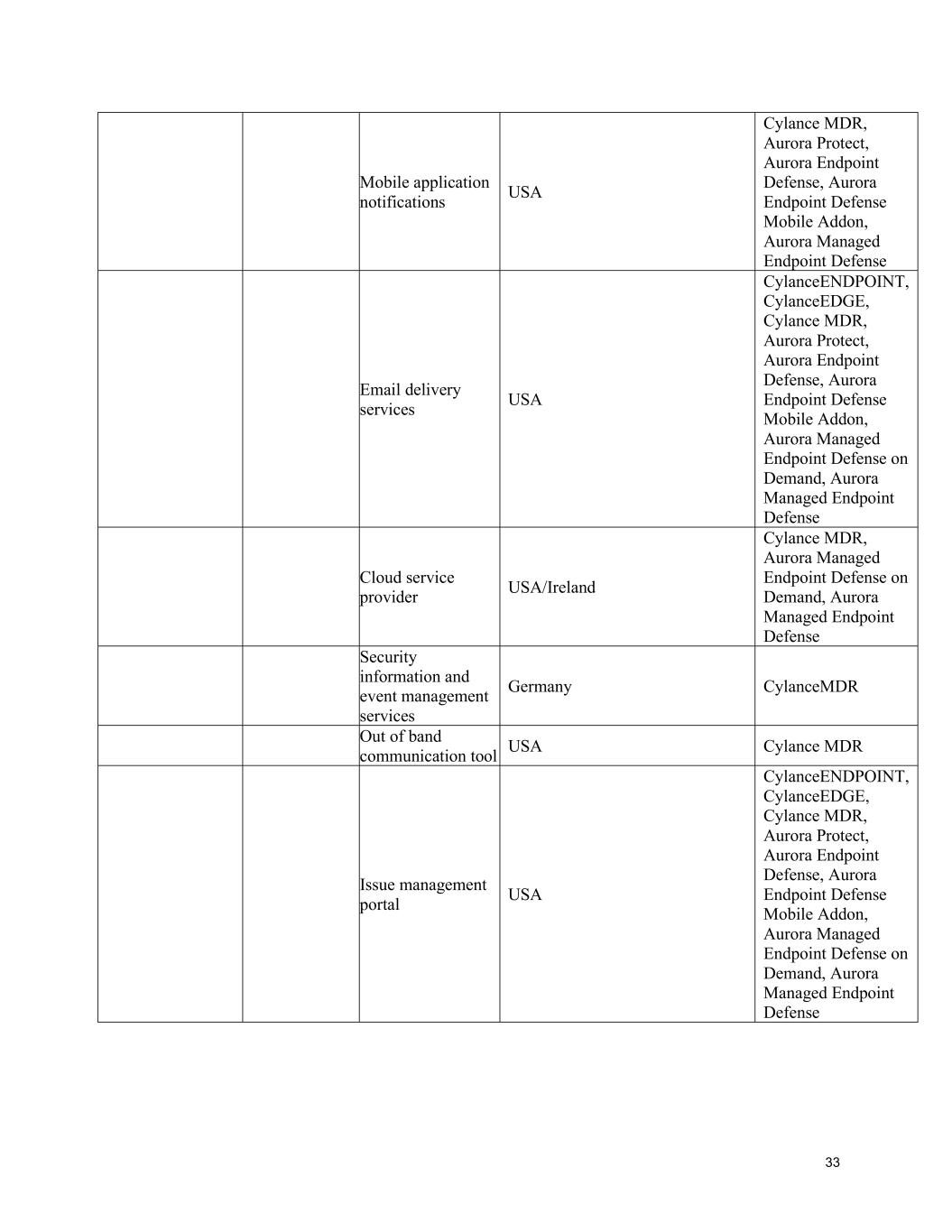 33 Mobile application notifications USA Cylance MDR, Aurora Protect, Aurora Endpoint Defense, Aurora Endpoint Defense Mobile Addon, Aurora Managed Endpoint Defense Email delivery services USA CylanceENDPOINT, CylanceEDGE, Cylance MDR, Aurora Protect, Aurora Endpoint Defense, Aurora Endpoint Defense Mobile Addon, Aurora Managed Endpoint Defense on Demand, Aurora Managed Endpoint Defense Cloud service provider USA/Ireland Cylance MDR, Aurora Managed Endpoint Defense on Demand, Aurora Managed Endpoint Defense Security information and event management services Germany CylanceMDR Out of band communication tool USA Cylance MDR Issue management portal USA CylanceENDPOINT, CylanceEDGE, Cylance MDR, Aurora Protect, Aurora Endpoint Defense, Aurora Endpoint Defense Mobile Addon, Aurora Managed Endpoint Defense on Demand, Aurora Managed Endpoint Defense