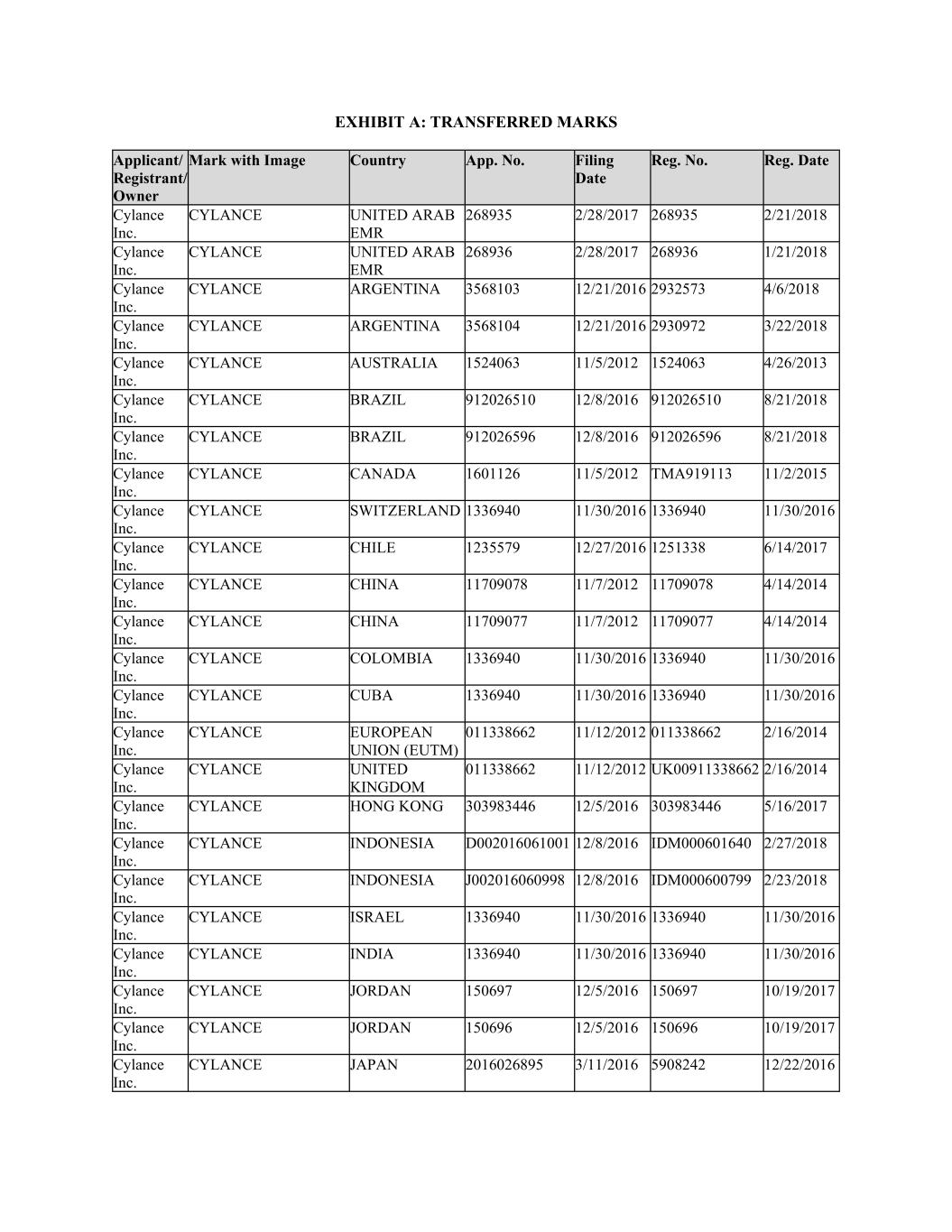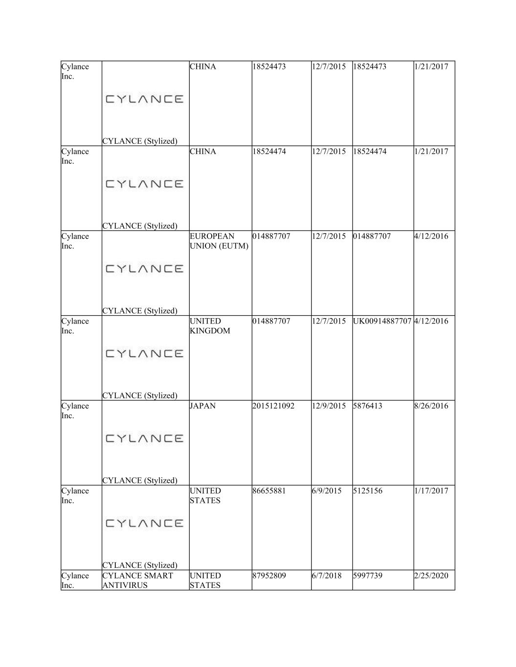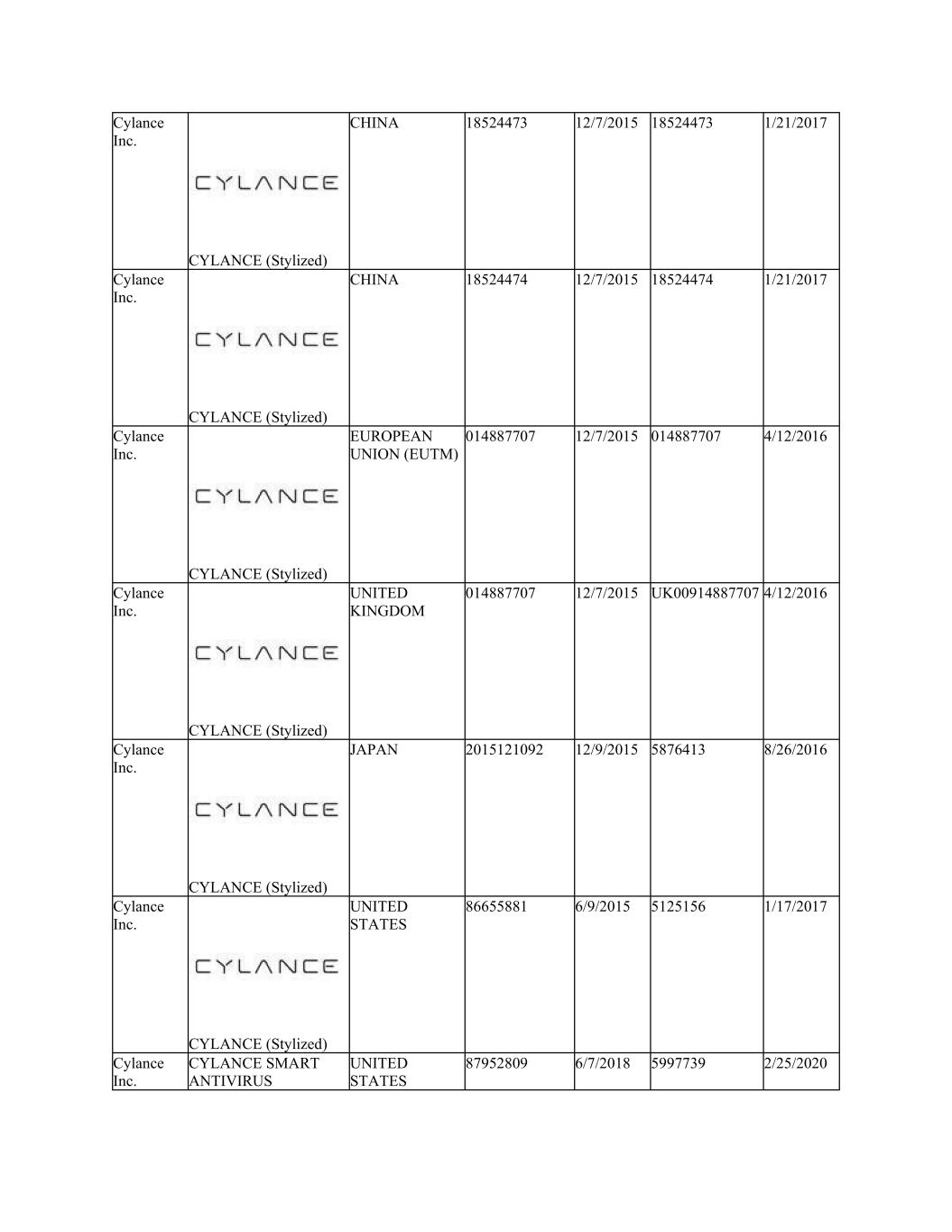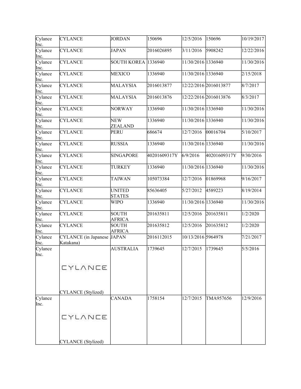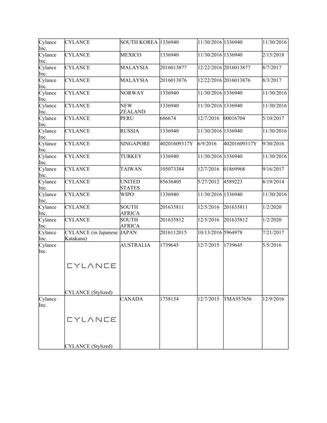 Cylance Inc. CYLANCE JORDAN 150696 12/5/2016 150696 10/19/2017 Cylance Inc. CYLANCE JAPAN 2016026895 3/11/2016 5908242 12/22/2016 Cylance Inc. CYLANCE SOUTH KOREA 1336940 11/30/2016 1336940 11/30/2016 Cylance Inc. CYLANCE MEXICO 1336940 11/30/2016 1336940 2/15/2018 Cylance Inc. CYLANCE MALAYSIA 2016013877 12/22/2016 2016013877 8/7/2017 Cylance Inc. CYLANCE MALAYSIA 2016013876 12/22/2016 2016013876 8/3/2017 Cylance Inc. CYLANCE NORWAY 1336940 11/30/2016 1336940 11/30/2016 Cylance Inc. CYLANCE NEW ZEALAND 1336940 11/30/2016 1336940 11/30/2016 Cylance Inc. CYLANCE PERU 686674 12/7/2016 00016704 5/10/2017 Cylance Inc. CYLANCE RUSSIA 1336940 11/30/2016 1336940 11/30/2016 Cylance Inc. CYLANCE SINGAPORE 40201609317Y 6/9/2016 40201609317Y 9/30/2016 Cylance Inc. CYLANCE TURKEY 1336940 11/30/2016 1336940 11/30/2016 Cylance Inc. CYLANCE TAIWAN 105073384 12/7/2016 01869968 9/16/2017 Cylance Inc. CYLANCE UNITED STATES 85636405 5/27/2012 4589223 8/19/2014 Cylance Inc. CYLANCE WIPO 1336940 11/30/2016 1336940 11/30/2016 Cylance Inc. CYLANCE SOUTH AFRICA 201635811 12/5/2016 201635811 1/2/2020 Cylance Inc. CYLANCE SOUTH AFRICA 201635812 12/5/2016 201635812 1/2/2020 Cylance Inc. CYLANCE (in Japanese Katakana) JAPAN 2016112015 10/13/2016 5964978 7/21/2017 Cylance Inc. CYLANCE (Stylized) AUSTRALIA 1739645 12/7/2015 1739645 5/5/2016 Cylance Inc. CYLANCE (Stylized) CANADA 1758154 12/7/2015 TMA957656 12/9/2016