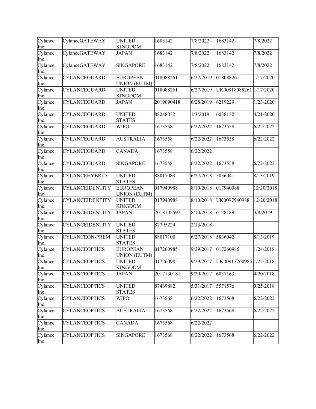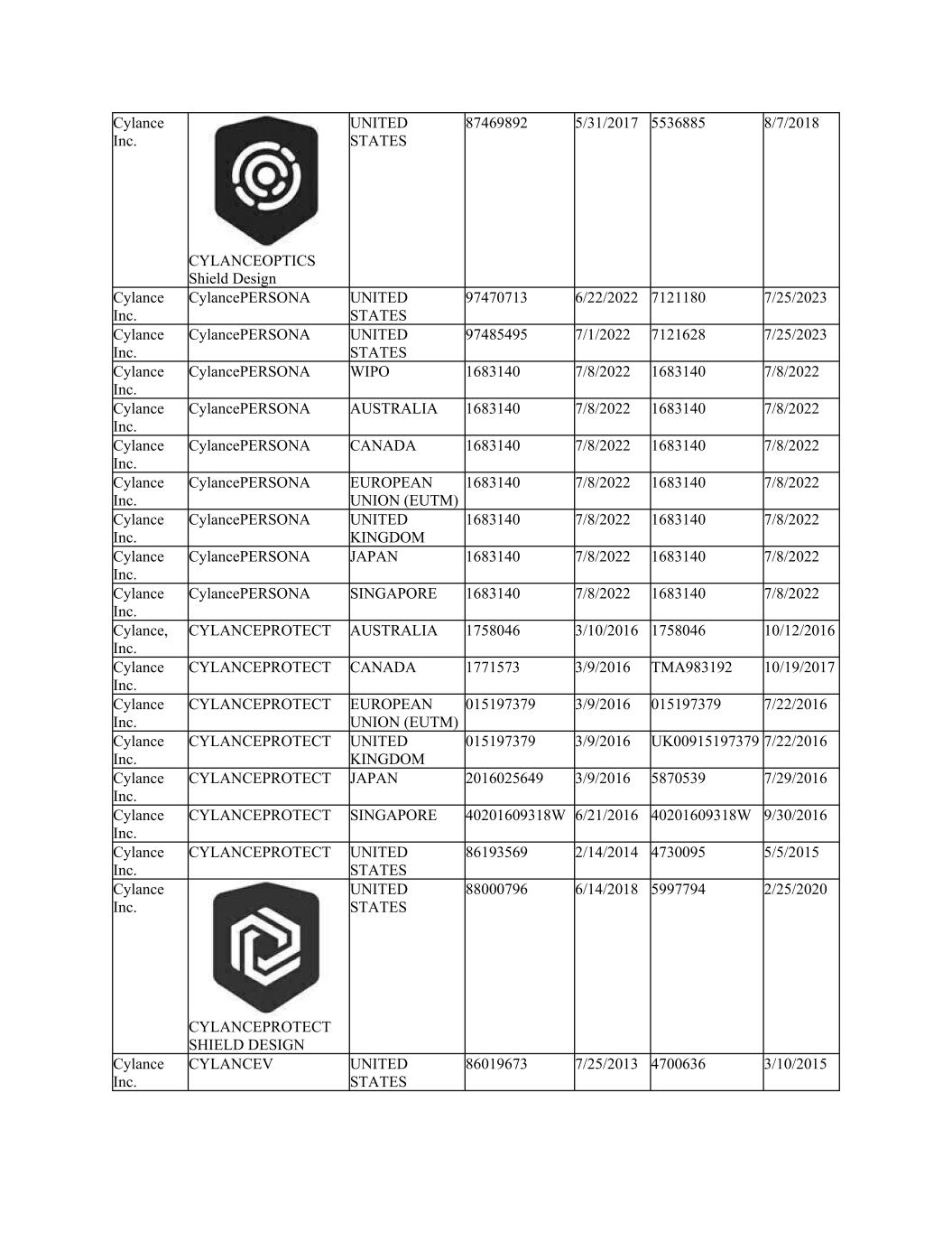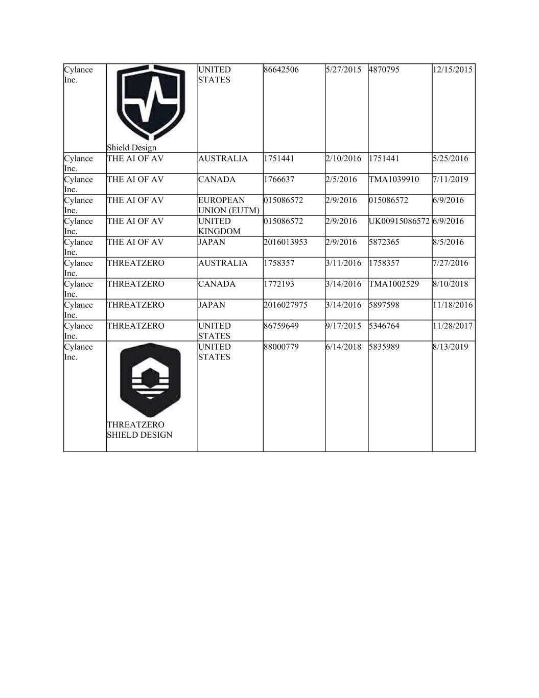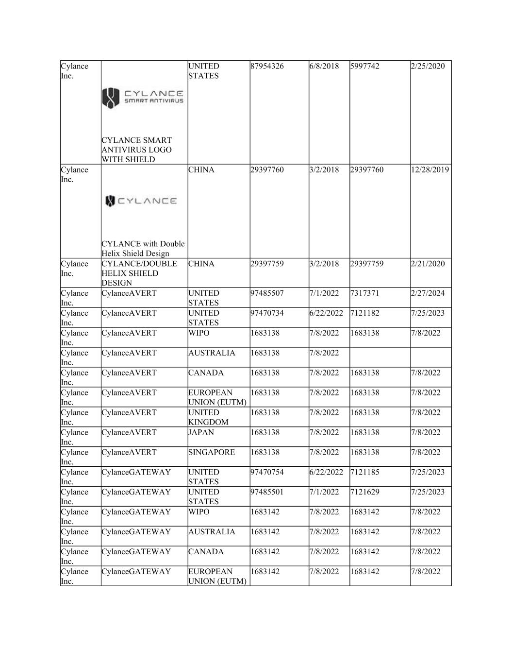 Cylance Inc. CYLANCEOPTICS Shield Design UNITED STATES 87469892 5/31/2017 5536885 8/7/2018 Cylance Inc. CylancePERSONA UNITED STATES 97470713 6/22/2022 7121180 7/25/2023 Cylance Inc. CylancePERSONA UNITED STATES 97485495 7/1/2022 7121628 7/25/2023 Cylance Inc. CylancePERSONA WIPO 1683140 7/8/2022 1683140 7/8/2022 Cylance Inc. CylancePERSONA AUSTRALIA 1683140 7/8/2022 1683140 7/8/2022 Cylance Inc. CylancePERSONA CANADA 1683140 7/8/2022 1683140 7/8/2022 Cylance Inc. CylancePERSONA EUROPEAN UNION (EUTM) 1683140 7/8/2022 1683140 7/8/2022 Cylance Inc. CylancePERSONA UNITED KINGDOM 1683140 7/8/2022 1683140 7/8/2022 Cylance Inc. CylancePERSONA JAPAN 1683140 7/8/2022 1683140 7/8/2022 Cylance Inc. CylancePERSONA SINGAPORE 1683140 7/8/2022 1683140 7/8/2022 Cylance, Inc. CYLANCEPROTECT AUSTRALIA 1758046 3/10/2016 1758046 10/12/2016 Cylance Inc. CYLANCEPROTECT CANADA 1771573 3/9/2016 TMA983192 10/19/2017 Cylance Inc. CYLANCEPROTECT EUROPEAN UNION (EUTM) 015197379 3/9/2016 015197379 7/22/2016 Cylance Inc. CYLANCEPROTECT UNITED KINGDOM 015197379 3/9/2016 UK00915197379 7/22/2016 Cylance Inc. CYLANCEPROTECT JAPAN 2016025649 3/9/2016 5870539 7/29/2016 Cylance Inc. CYLANCEPROTECT SINGAPORE 40201609318W 6/21/2016 40201609318W 9/30/2016 Cylance Inc. CYLANCEPROTECT UNITED STATES 86193569 2/14/2014 4730095 5/5/2015 Cylance Inc. CYLANCEPROTECT SHIELD DESIGN UNITED STATES 88000796 6/14/2018 5997794 2/25/2020 Cylance Inc. CYLANCEV UNITED STATES 86019673 7/25/2013 4700636 3/10/2015