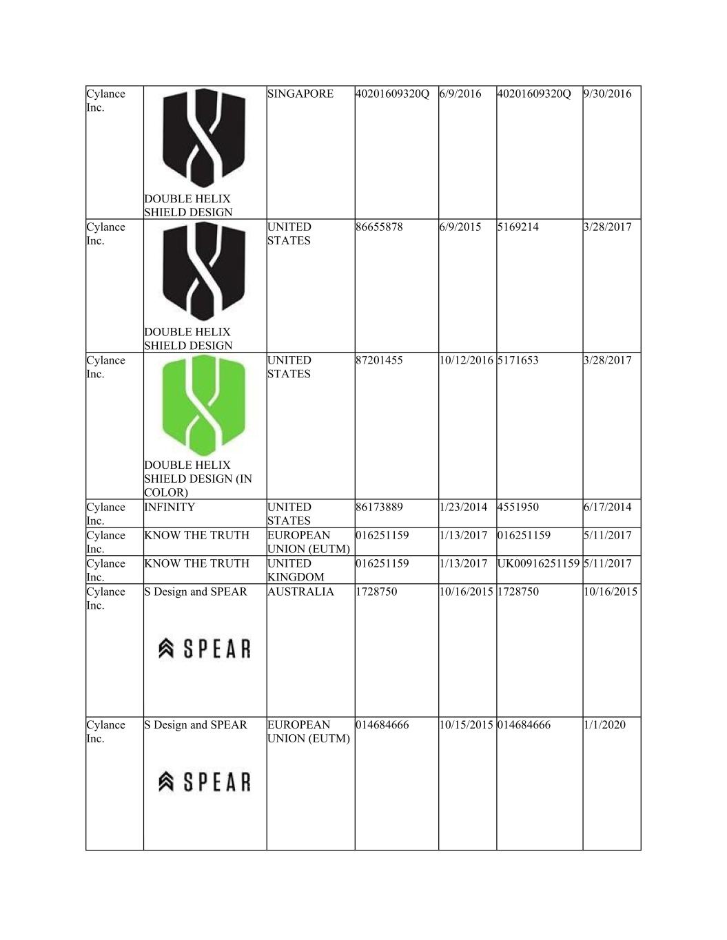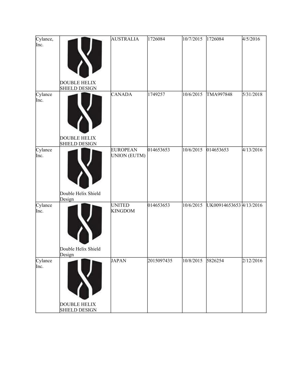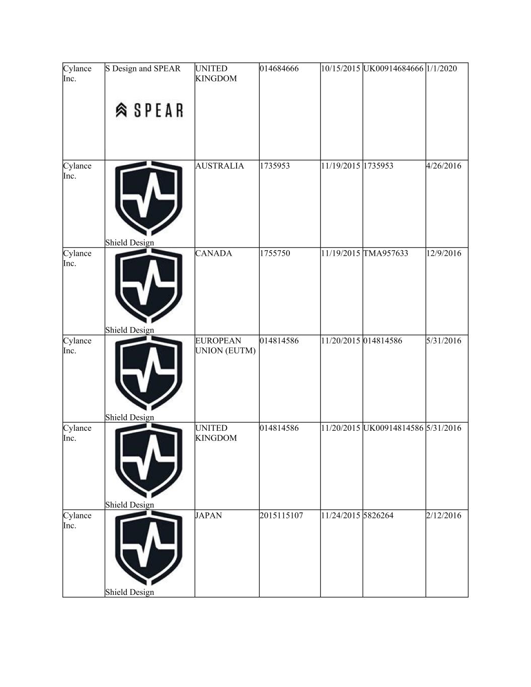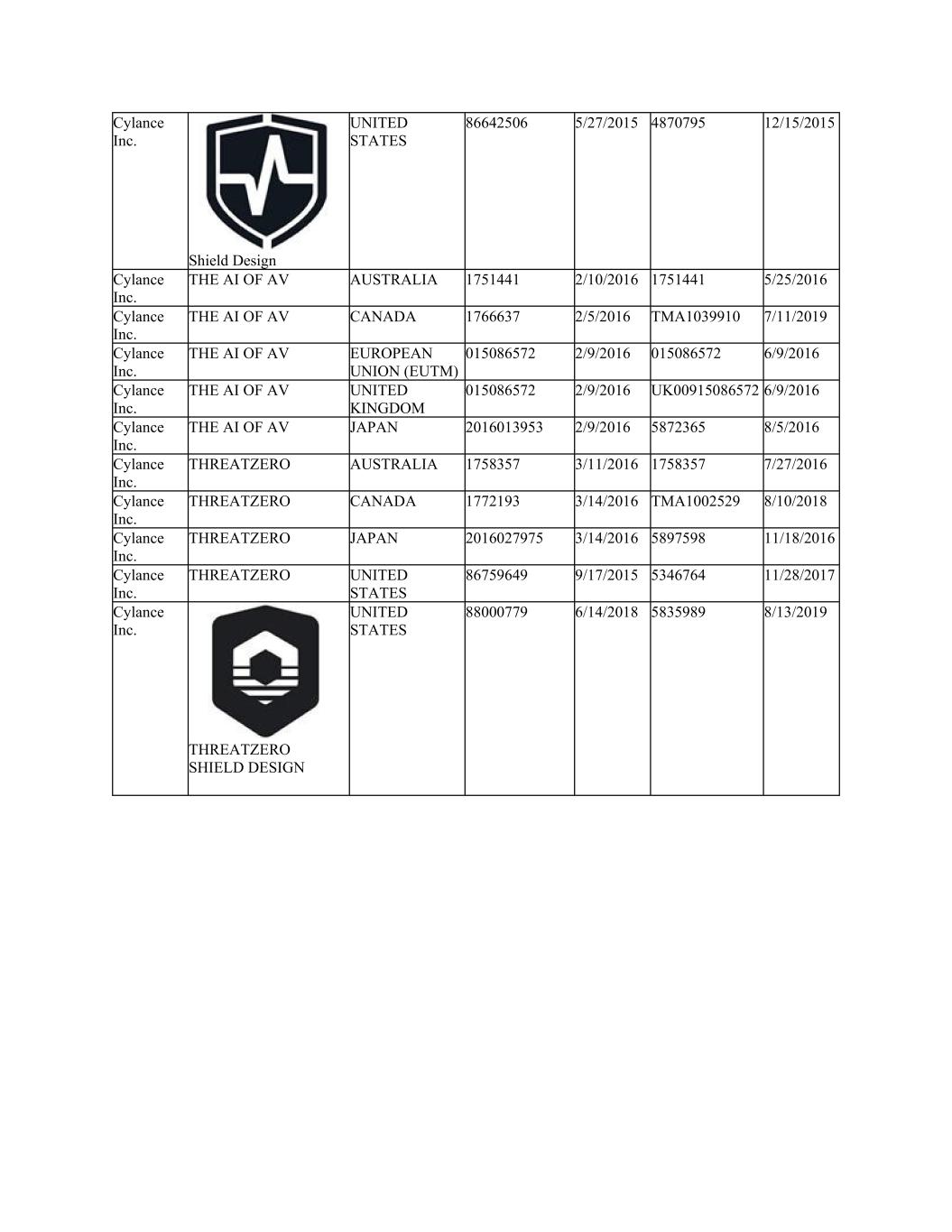 Cylance, Inc. DOUBLE HELIX SHIELD DESIGN AUSTRALIA 1726084 10/7/2015 1726084 4/5/2016 Cylance Inc. DOUBLE HELIX SHIELD DESIGN CANADA 1749257 10/6/2015 TMA997848 5/31/2018 Cylance Inc. Double Helix Shield Design EUROPEAN UNION (EUTM) 014653653 10/6/2015 014653653 4/13/2016 Cylance Inc. Double Helix Shield Design UNITED KINGDOM 014653653 10/6/2015 UK00914653653 4/13/2016 Cylance Inc. DOUBLE HELIX SHIELD DESIGN JAPAN 2015097435 10/8/2015 5826254 2/12/2016