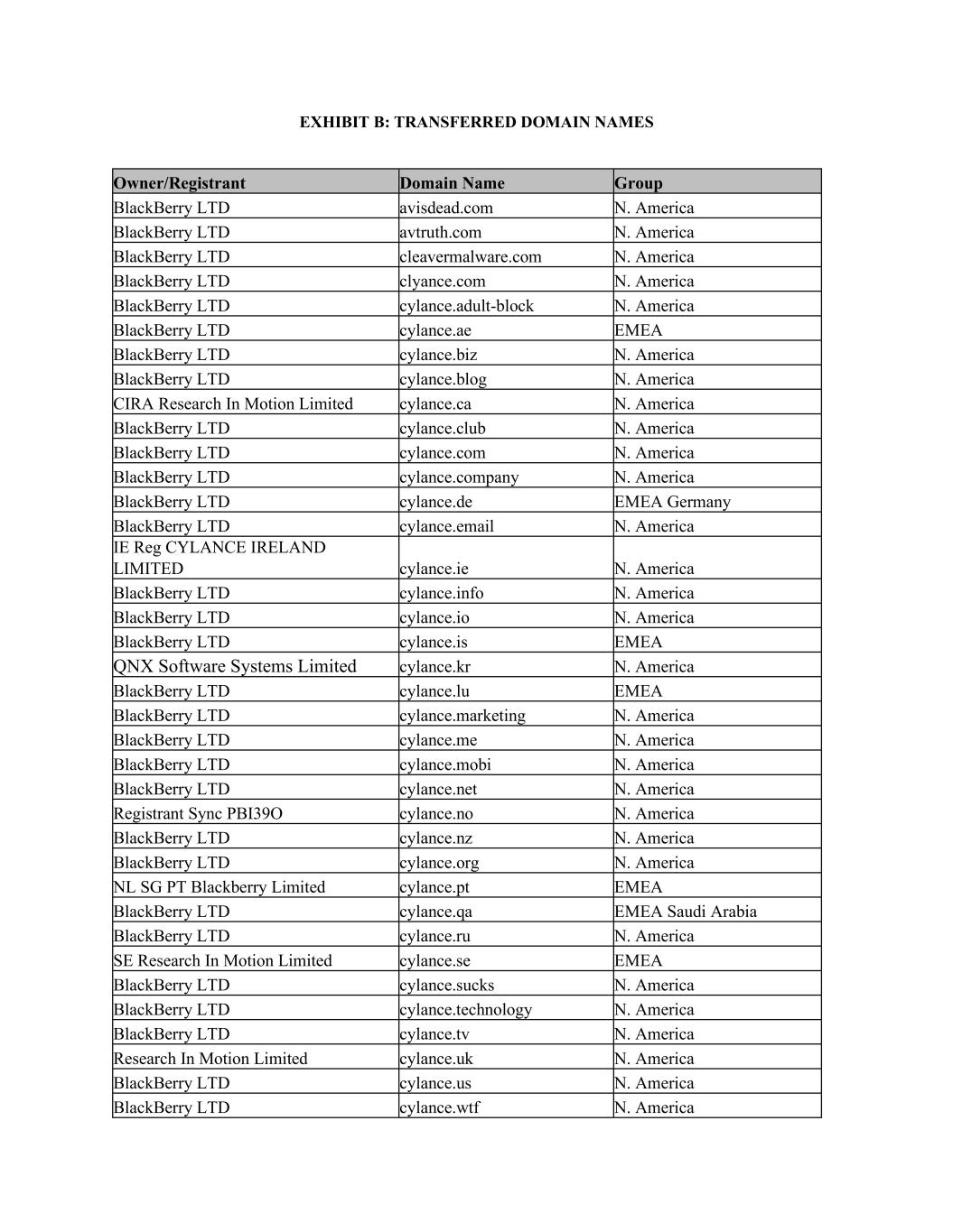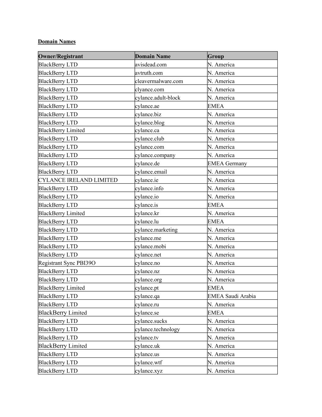 Domain Names Owner/Registrant Domain Name Group BlackBerry LTD avisdead.com N. America BlackBerry LTD avtruth.com N. America BlackBerry LTD cleavermalware.com N. America BlackBerry LTD clyance.com N. America BlackBerry LTD cylance.adult-block N. America BlackBerry LTD cylance.ae EMEA BlackBerry LTD cylance.biz N. America BlackBerry LTD cylance.blog N. America BlackBerry Limited cylance.ca N. America BlackBerry LTD cylance.club N. America BlackBerry LTD cylance.com N. America BlackBerry LTD cylance.company N. America BlackBerry LTD cylance.de EMEA Germany BlackBerry LTD cylance.email N. America CYLANCE IRELAND LIMITED cylance.ie N. America BlackBerry LTD cylance.info N. America BlackBerry LTD cylance.io N. America BlackBerry LTD cylance.is EMEA BlackBerry Limited cylance.kr N. America BlackBerry LTD cylance.lu EMEA BlackBerry LTD cylance.marketing N. America BlackBerry LTD cylance.me N. America BlackBerry LTD cylance.mobi N. America BlackBerry LTD cylance.net N. America Registrant Sync PBI39O cylance.no N. America BlackBerry LTD cylance.nz N. America BlackBerry LTD cylance.org N. America BlackBerry Limited cylance.pt EMEA BlackBerry LTD cylance.qa EMEA Saudi Arabia BlackBerry LTD cylance.ru N. America BlackBerry Limited cylance.se EMEA BlackBerry LTD cylance.sucks N. America BlackBerry LTD cylance.technology N. America BlackBerry LTD cylance.tv N. America BlackBerry Limited cylance.uk N. America BlackBerry LTD cylance.us N. America BlackBerry LTD cylance.wtf N. America BlackBerry LTD cylance.xyz N. America