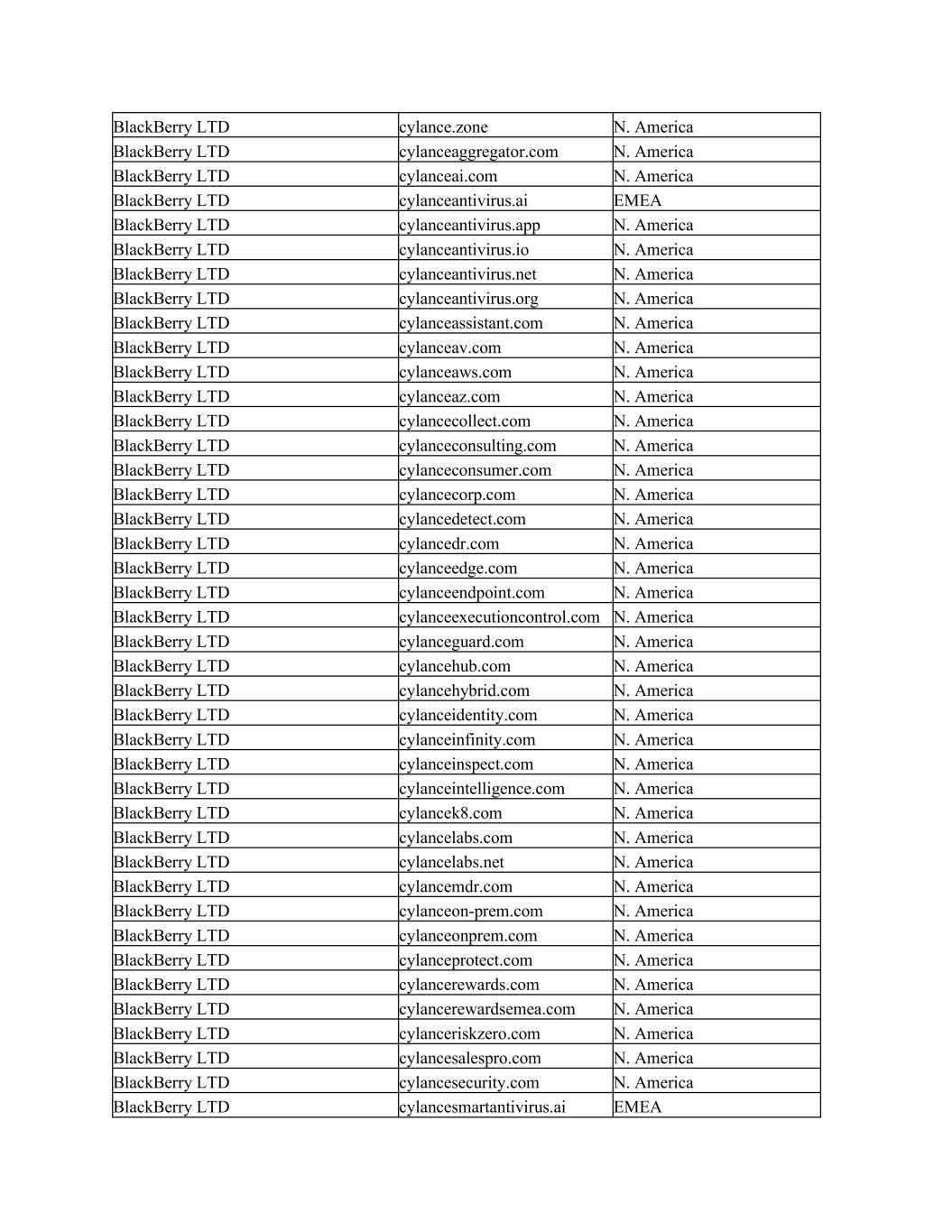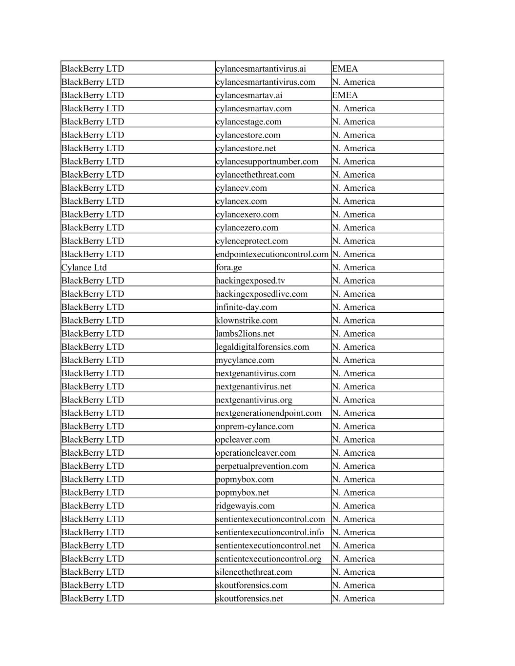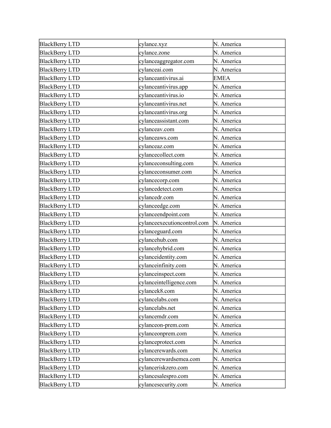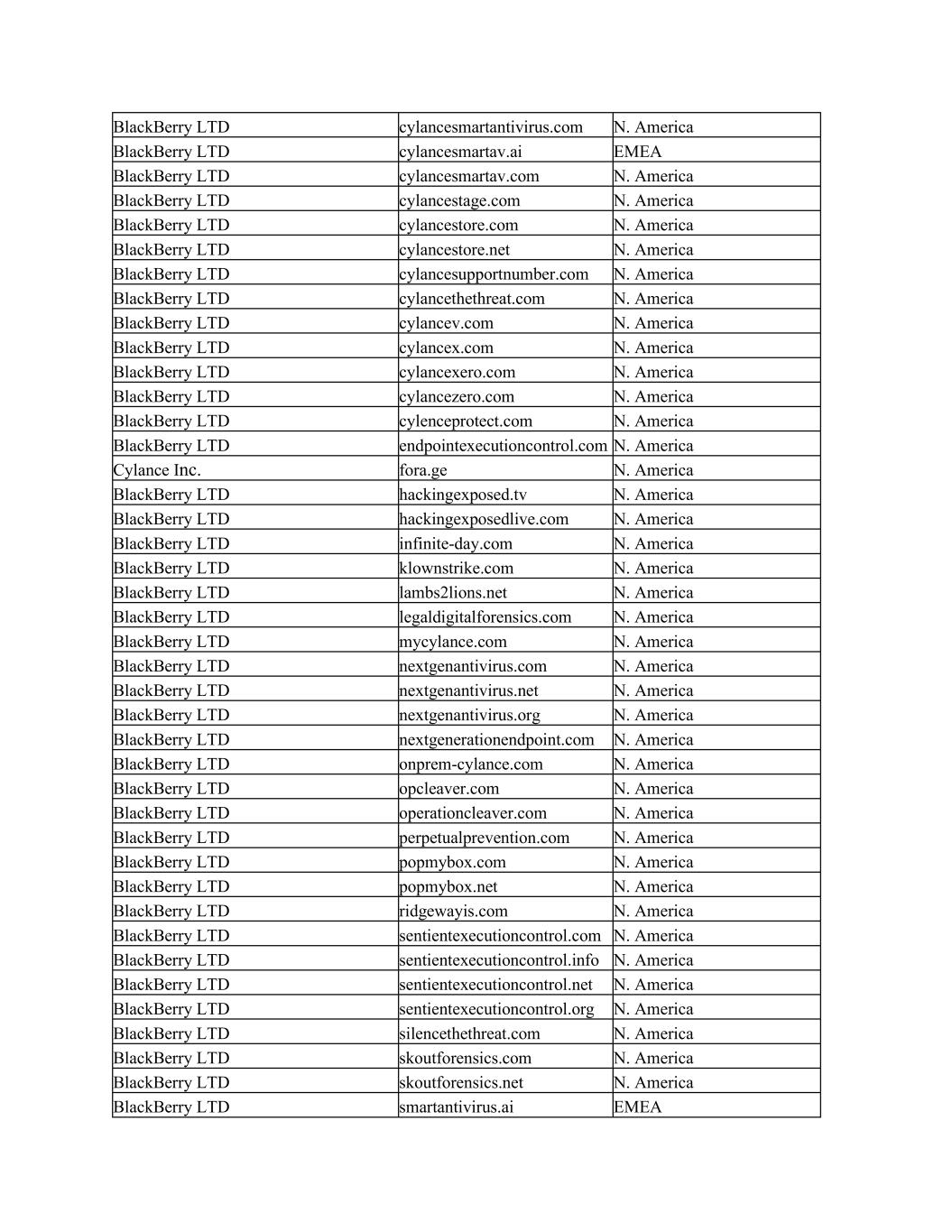 BlackBerry LTD cylancesmartantivirus.com N. America BlackBerry LTD cylancesmartav.ai EMEA BlackBerry LTD cylancesmartav.com N. America BlackBerry LTD cylancestage.com N. America BlackBerry LTD cylancestore.com N. America BlackBerry LTD cylancestore.net N. America BlackBerry LTD cylancesupportnumber.com N. America BlackBerry LTD cylancethethreat.com N. America BlackBerry LTD cylancev.com N. America BlackBerry LTD cylancex.com N. America BlackBerry LTD cylancexero.com N. America BlackBerry LTD cylancezero.com N. America BlackBerry LTD cylenceprotect.com N. America BlackBerry LTD endpointexecutioncontrol.com N. America Cylance Inc. fora.ge N. America BlackBerry LTD hackingexposed.tv N. America BlackBerry LTD hackingexposedlive.com N. America BlackBerry LTD infinite-day.com N. America BlackBerry LTD klownstrike.com N. America BlackBerry LTD lambs2lions.net N. America BlackBerry LTD legaldigitalforensics.com N. America BlackBerry LTD mycylance.com N. America BlackBerry LTD nextgenantivirus.com N. America BlackBerry LTD nextgenantivirus.net N. America BlackBerry LTD nextgenantivirus.org N. America BlackBerry LTD nextgenerationendpoint.com N. America BlackBerry LTD onprem-cylance.com N. America BlackBerry LTD opcleaver.com N. America BlackBerry LTD operationcleaver.com N. America BlackBerry LTD perpetualprevention.com N. America BlackBerry LTD popmybox.com N. America BlackBerry LTD popmybox.net N. America BlackBerry LTD ridgewayis.com N. America BlackBerry LTD sentientexecutioncontrol.com N. America BlackBerry LTD sentientexecutioncontrol.info N. America BlackBerry LTD sentientexecutioncontrol.net N. America BlackBerry LTD sentientexecutioncontrol.org N. America BlackBerry LTD silencethethreat.com N. America BlackBerry LTD skoutforensics.com N. America BlackBerry LTD skoutforensics.net N. America BlackBerry LTD smartantivirus.ai EMEA