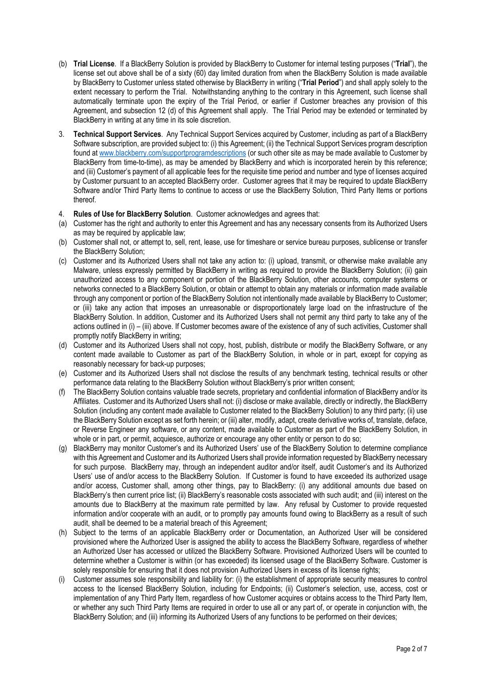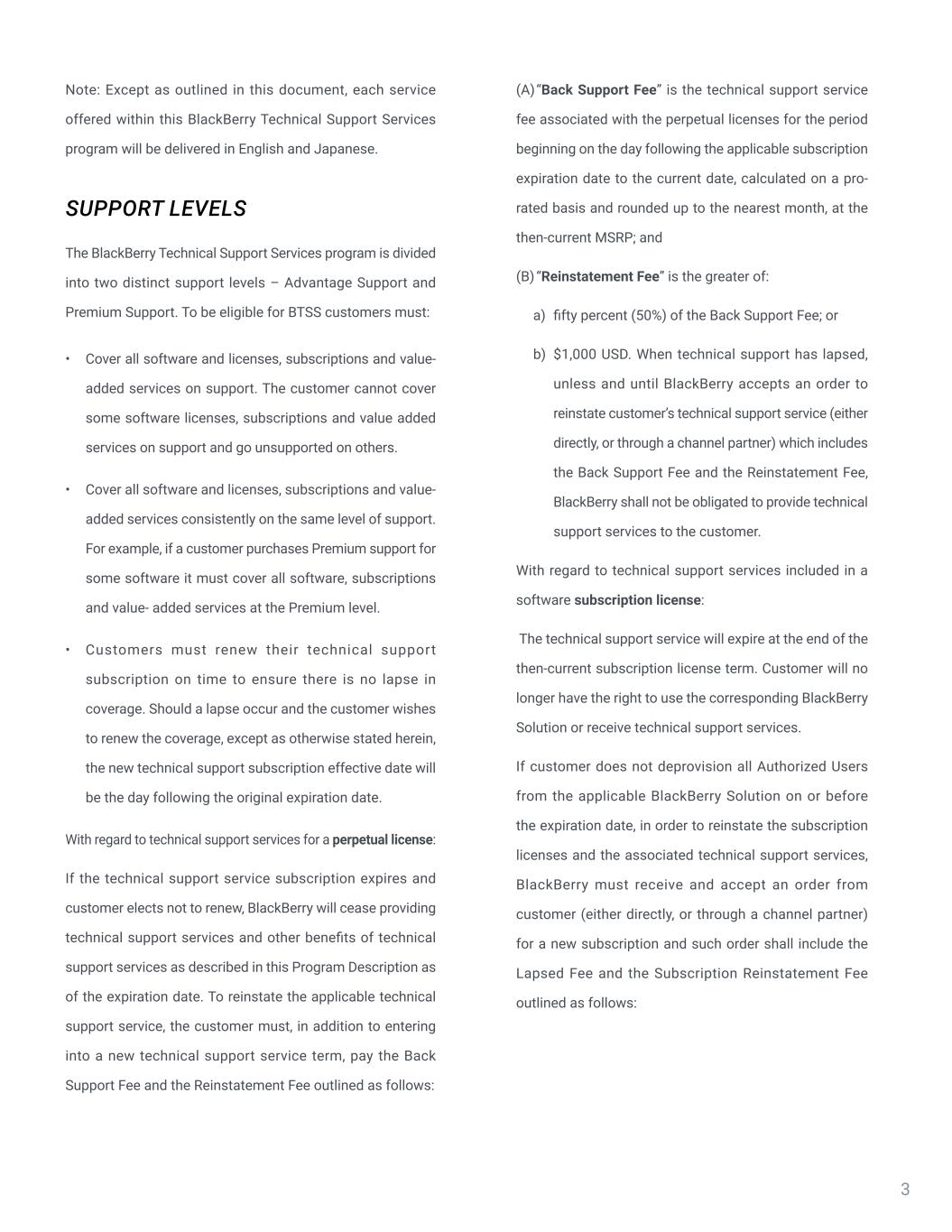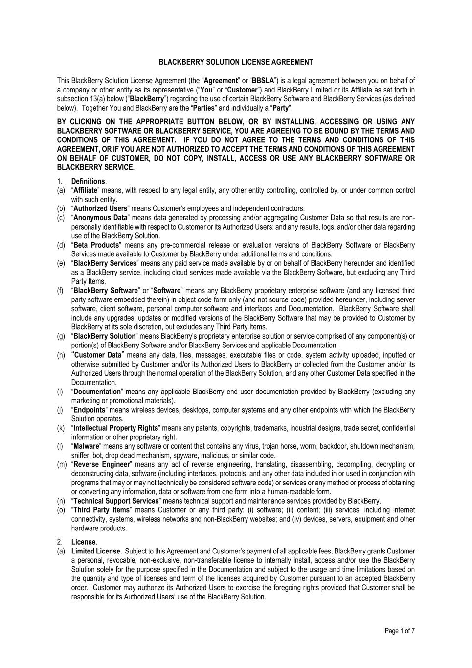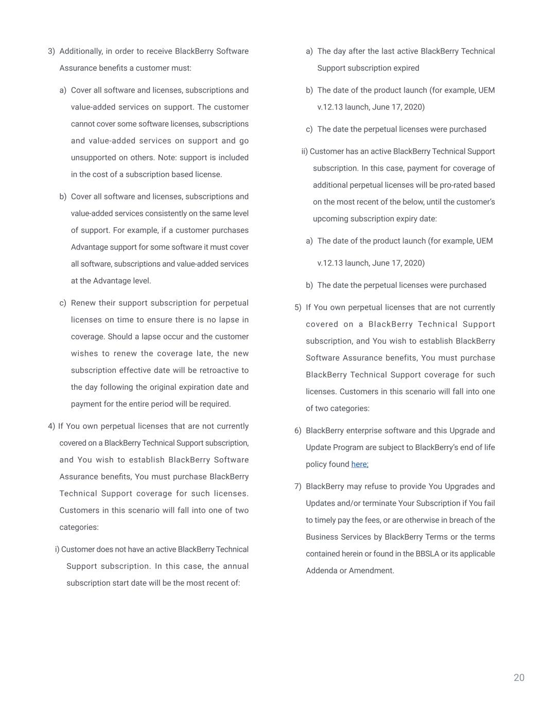 3) Additionally, in order to receive BlackBerry Software Assurance benefits a customer must: a) Cover all software and licenses, subscriptions and value-added services on support. The customer cannot cover some software licenses, subscriptions and value-added services on support and go unsupported on others. Note: support is included in the cost of a subscription based license. b) Cover all software and licenses, subscriptions and value-added services consistently on the same level of support. For example, if a customer purchases Advantage support for some software it must cover all software, subscriptions and value-added services at the Advantage level. c) Renew their support subscription for perpetual licenses on time to ensure there is no lapse in coverage. Should a lapse occur and the customer wishes to renew the coverage late, the new subscription effective date will be retroactive to the day following the original expiration date and payment for the entire period will be required. 4) If You own perpetual licenses that are not currently covered on a BlackBerry Technical Support subscription, and You wish to establish BlackBerry Software Assurance benefits, You must purchase BlackBerry Technical Support coverage for such licenses. Customers in this scenario will fall into one of two categories: i) Customer does not have an active BlackBerry Technical Support subscription. In this case, the annual subscription start date will be the most recent of: a) The day after the last active BlackBerry Technical Support subscription expired b) The date of the product launch (for example, UEM v.12.13 launch, June 17, 2020) c) The date the perpetual licenses were purchased ii) Customer has an active BlackBerry Technical Support subscription. In this case, payment for coverage of additional perpetual licenses will be pro-rated based on the most recent of the below, until the customer’s upcoming subscription expiry date: a) The date of the product launch (for example, UEM v.12.13 launch, June 17, 2020) b) The date the perpetual licenses were purchased 5) If You own perpetual licenses that are not currently covered on a BlackBerry Technical Support subscription, and You wish to establish BlackBerry Software Assurance benefits, You must purchase BlackBerry Technical Support coverage for such licenses. Customers in this scenario will fall into one of two categories: 6) BlackBerry enterprise software and this Upgrade and Update Program are subject to BlackBerry’s end of life policy found here; 7) BlackBerry may refuse to provide You Upgrades and Updates and/or terminate Your Subscription if You fail to timely pay the fees, or are otherwise in breach of the Business Services by BlackBerry Terms or the terms contained herein or found in the BBSLA or its applicable Addenda or Amendment. 20