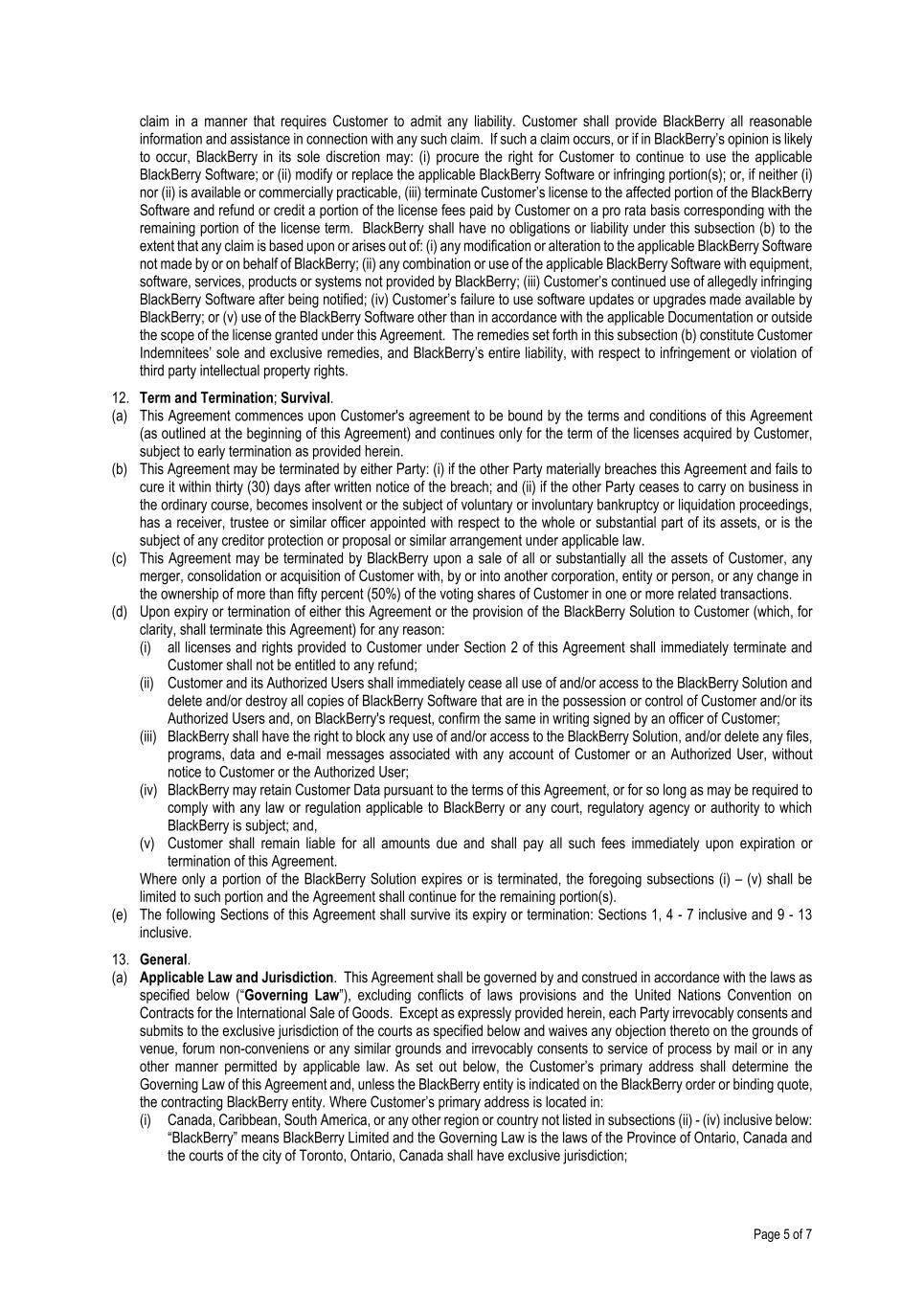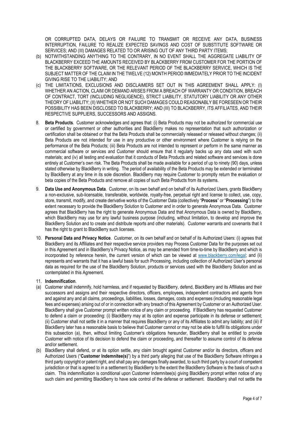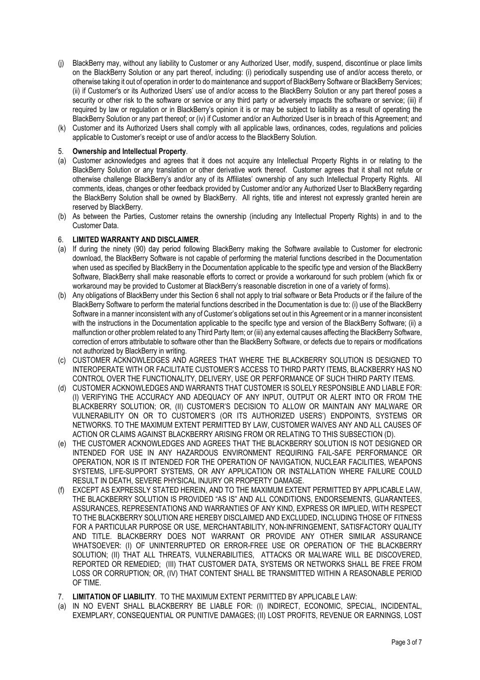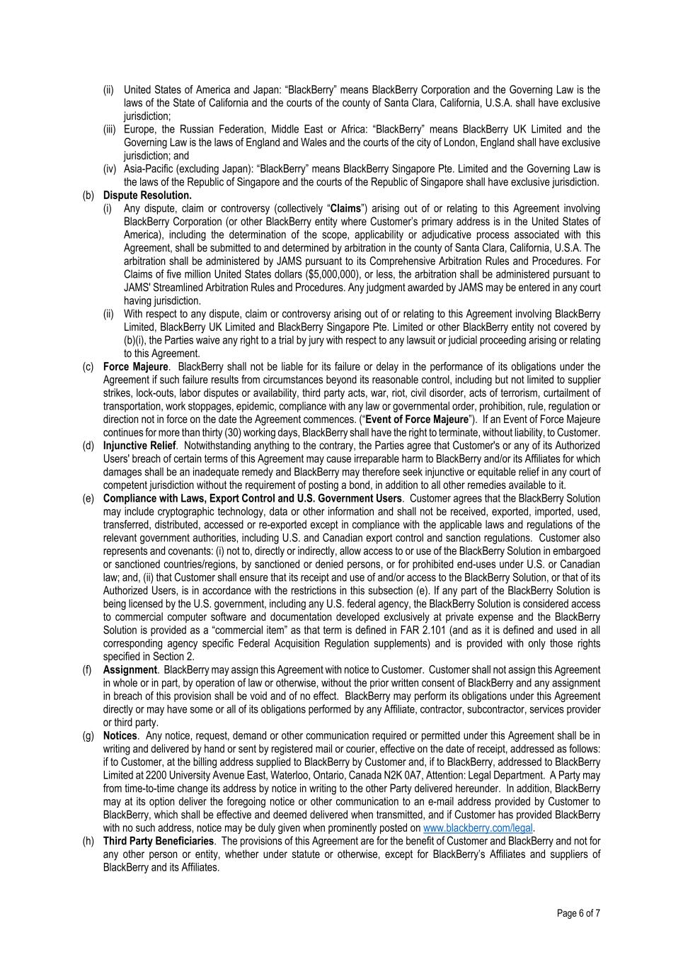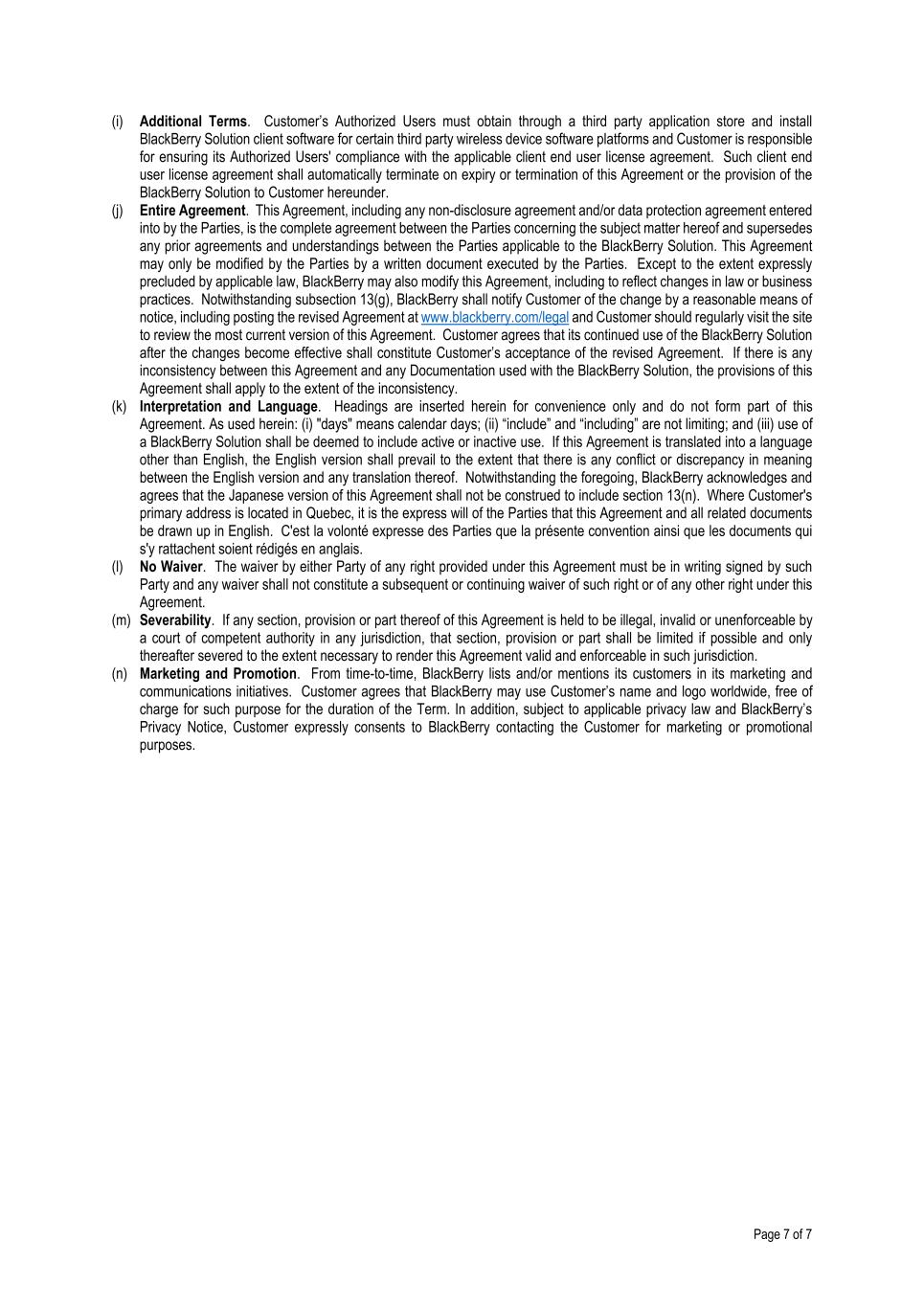 3) Additionally, in order to receive BlackBerry Software Assurance benefits a customer must: a) Cover all software and licenses, subscriptions and value-added services on support. The customer cannot cover some software licenses, subscriptions and value-added services on support and go unsupported on others. Note: support is included in the cost of a subscription based license. b) Cover all software and licenses, subscriptions and value-added services consistently on the same level of support. For example, if a customer purchases Advantage support for some software it must cover all software, subscriptions and value-added services at the Advantage level. c) Renew their support subscription for perpetual licenses on time to ensure there is no lapse in coverage. Should a lapse occur and the customer wishes to renew the coverage late, the new subscription effective date will be retroactive to the day following the original expiration date and payment for the entire period will be required. 4) If You own perpetual licenses that are not currently covered on a BlackBerry Technical Support subscription, and You wish to establish BlackBerry Software Assurance benefits, You must purchase BlackBerry Technical Support coverage for such licenses. Customers in this scenario will fall into one of two categories: i) Customer does not have an active BlackBerry Technical Support subscription. In this case, the annual subscription start date will be the most recent of: a) The day after the last active BlackBerry Technical Support subscription expired b) The date of the product launch (for example, UEM v.12.13 launch, June 17, 2020) c) The date the perpetual licenses were purchased ii) Customer has an active BlackBerry Technical Support subscription. In this case, payment for coverage of additional perpetual licenses will be pro-rated based on the most recent of the below, until the customer’s upcoming subscription expiry date: a) The date of the product launch (for example, UEM v.12.13 launch, June 17, 2020) b) The date the perpetual licenses were purchased 5) If You own perpetual licenses that are not currently covered on a BlackBerry Technical Support subscription, and You wish to establish BlackBerry Software Assurance benefits, You must purchase BlackBerry Technical Support coverage for such licenses. Customers in this scenario will fall into one of two categories: 6) BlackBerry enterprise software and this Upgrade and Update Program are subject to BlackBerry’s end of life policy found here; 7) BlackBerry may refuse to provide You Upgrades and Updates and/or terminate Your Subscription if You fail to timely pay the fees, or are otherwise in breach of the Business Services by BlackBerry Terms or the terms contained herein or found in the BBSLA or its applicable Addenda or Amendment. 20