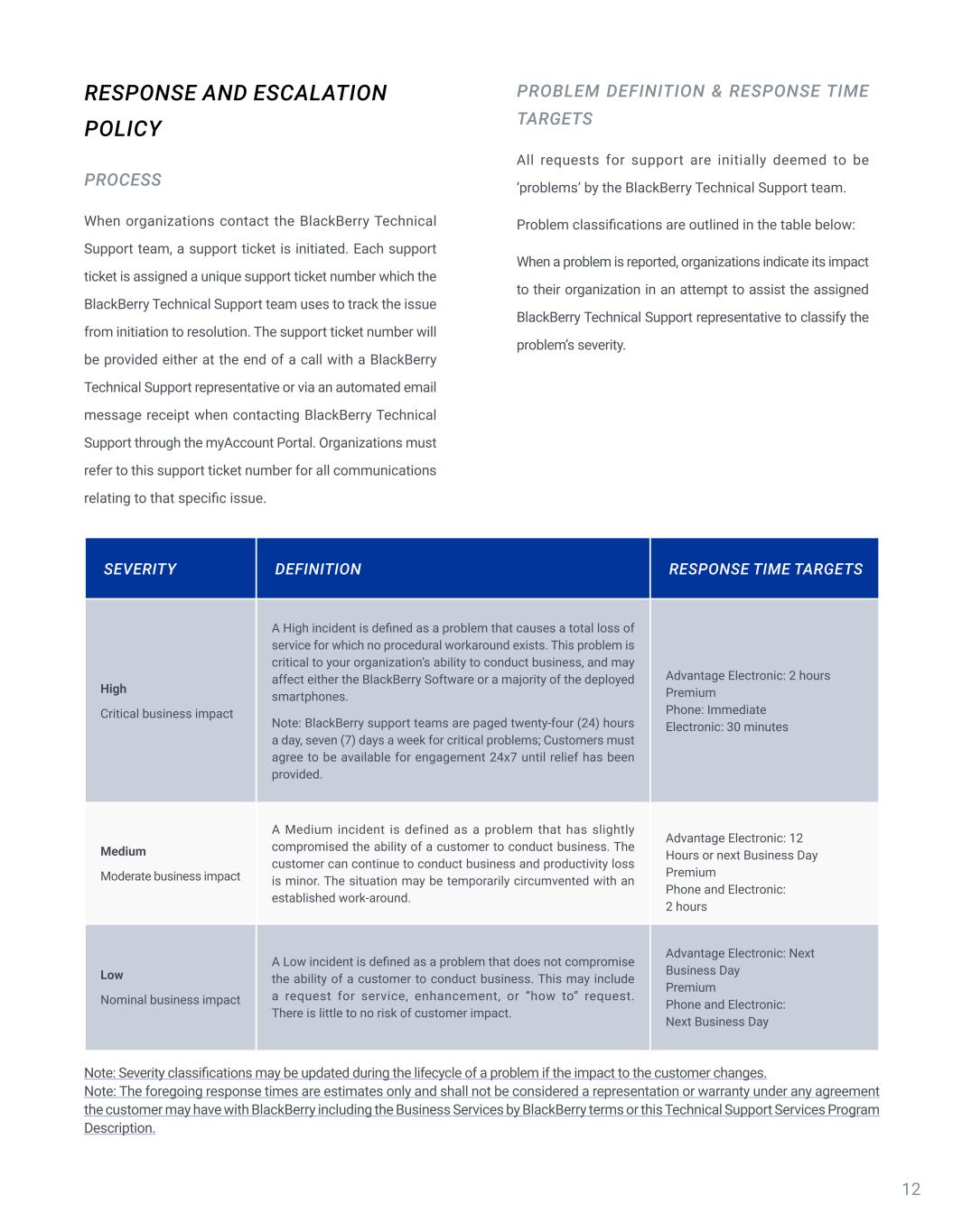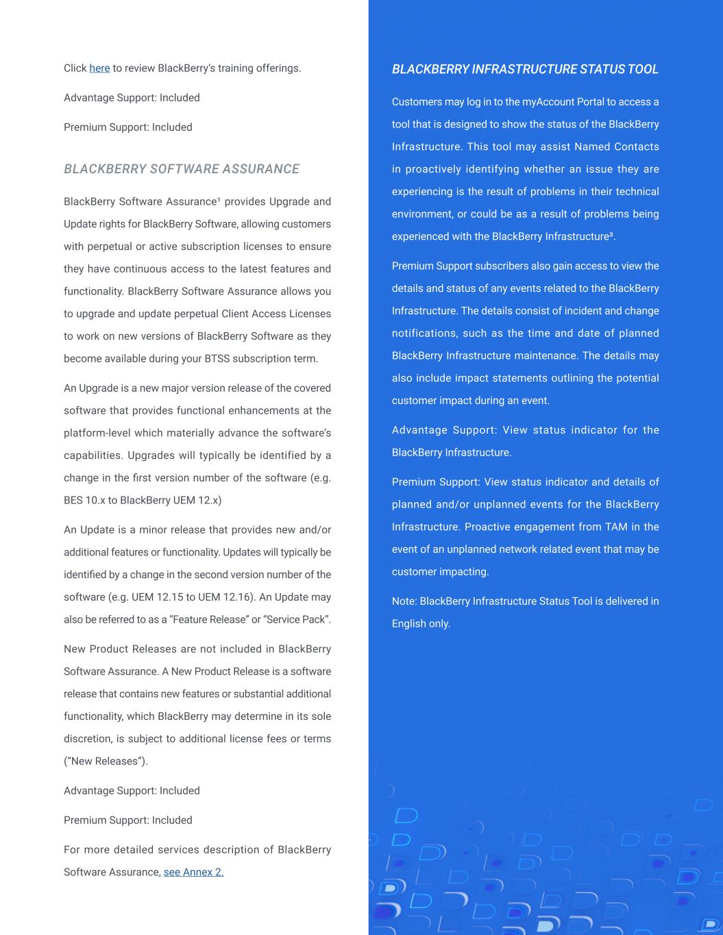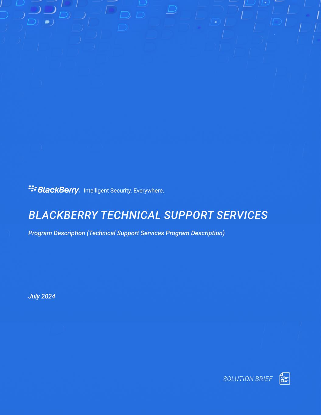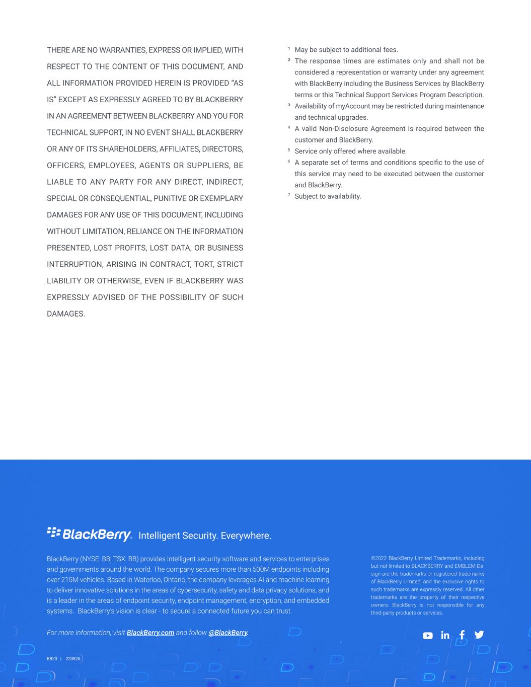BlackBerry (NYSE: BB; TSX: BB) provides intelligent security software and services to enterprises and governments around the world. The company secures more than 500M endpoints including over 215M vehicles. Based in Waterloo, Ontario, the company leverages AI and machine learning to deliver innovative solutions in the areas of cybersecurity, safety and data privacy solutions, and is a leader in the areas of endpoint security, endpoint management, encryption, and embedded systems. BlackBerry’s vision is clear - to secure a connected future you can trust. For more information, visit BlackBerry.com and follow @BlackBerry. ©2022 BlackBerry Limited Trademarks, including but not limited to BLACKBERRY and EMBLEM De- sign are the trademarks or registered trademarks of BlackBerry Limited, and the exclusive rights to such trademarks are expressly reserved. All other trademarks are the property of their respective owners. BlackBerry is not responsible for any third-party products or services. BB23 | 220826 THERE ARE NO WARRANTIES, EXPRESS OR IMPLIED, WITH RESPECT TO THE CONTENT OF THIS DOCUMENT, AND ALL INFORMATION PROVIDED HEREIN IS PROVIDED “AS IS” EXCEPT AS EXPRESSLY AGREED TO BY BLACKBERRY IN AN AGREEMENT BETWEEN BLACKBERRY AND YOU FOR TECHNICAL SUPPORT, IN NO EVENT SHALL BLACKBERRY OR ANY OF ITS SHAREHOLDERS, AFFILIATES, DIRECTORS, OFFICERS, EMPLOYEES, AGENTS OR SUPPLIERS, BE LIABLE TO ANY PARTY FOR ANY DIRECT, INDIRECT, SPECIAL OR CONSEQUENTIAL, PUNITIVE OR EXEMPLARY DAMAGES FOR ANY USE OF THIS DOCUMENT, INCLUDING WITHOUT LIMITATION, RELIANCE ON THE INFORMATION PRESENTED, LOST PROFITS, LOST DATA, OR BUSINESS INTERRUPTION, ARISING IN CONTRACT, TORT, STRICT LIABILITY OR OTHERWISE, EVEN IF BLACKBERRY WAS EXPRESSLY ADVISED OF THE POSSIBILITY OF SUCH DAMAGES. ¹ May be subject to additional fees. ² The response times are estimates only and shall not be considered a representation or warranty under any agreement with BlackBerry including the Business Services by BlackBerry terms or this Technical Support Services Program Description. ³ Availability of myAccount may be restricted during maintenance and technical upgrades. 4 A valid Non-Disclosure Agreement is required between the customer and BlackBerry. 5 Service only offered where available. 6 A separate set of terms and conditions specific to the use of this service may need to be executed between the customer and BlackBerry. 7 Subject to availability.