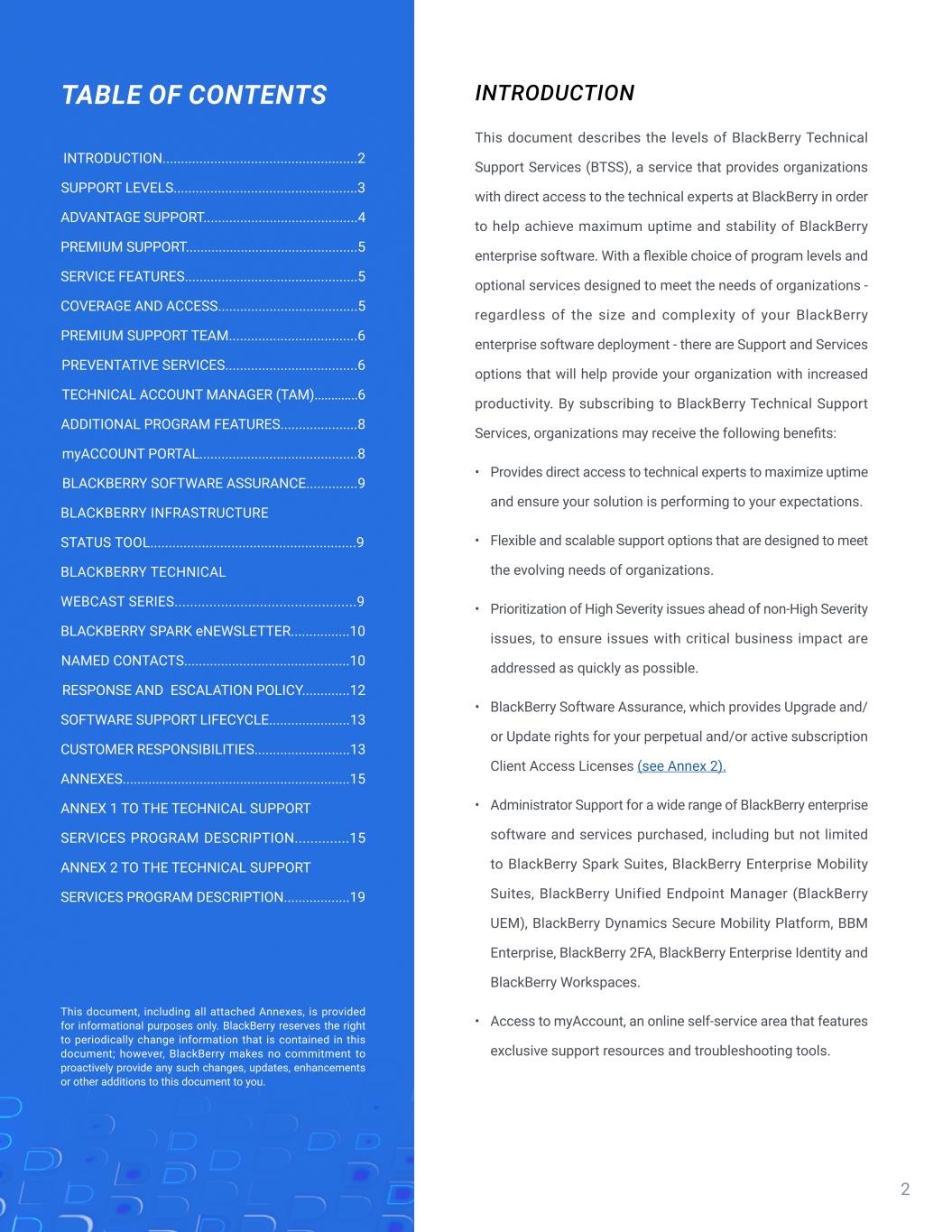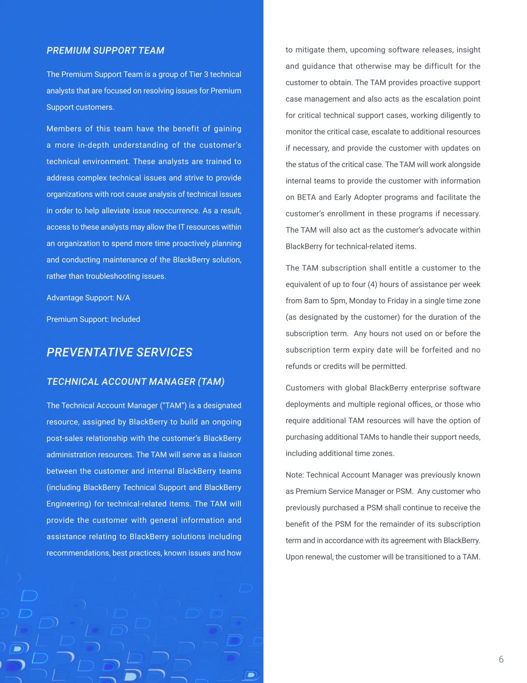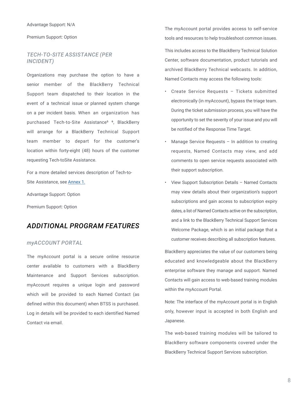 BlackBerry (NYSE: BB; TSX: BB) provides intelligent security software and services to enterprises and governments around the world. The company secures more than 500M endpoints including over 215M vehicles. Based in Waterloo, Ontario, the company leverages AI and machine learning to deliver innovative solutions in the areas of cybersecurity, safety and data privacy solutions, and is a leader in the areas of endpoint security, endpoint management, encryption, and embedded systems. BlackBerry’s vision is clear - to secure a connected future you can trust. For more information, visit BlackBerry.com and follow @BlackBerry. ©2022 BlackBerry Limited Trademarks, including but not limited to BLACKBERRY and EMBLEM De- sign are the trademarks or registered trademarks of BlackBerry Limited, and the exclusive rights to such trademarks are expressly reserved. All other trademarks are the property of their respective owners. BlackBerry is not responsible for any third-party products or services. BB23 | 220826 THERE ARE NO WARRANTIES, EXPRESS OR IMPLIED, WITH RESPECT TO THE CONTENT OF THIS DOCUMENT, AND ALL INFORMATION PROVIDED HEREIN IS PROVIDED “AS IS” EXCEPT AS EXPRESSLY AGREED TO BY BLACKBERRY IN AN AGREEMENT BETWEEN BLACKBERRY AND YOU FOR TECHNICAL SUPPORT, IN NO EVENT SHALL BLACKBERRY OR ANY OF ITS SHAREHOLDERS, AFFILIATES, DIRECTORS, OFFICERS, EMPLOYEES, AGENTS OR SUPPLIERS, BE LIABLE TO ANY PARTY FOR ANY DIRECT, INDIRECT, SPECIAL OR CONSEQUENTIAL, PUNITIVE OR EXEMPLARY DAMAGES FOR ANY USE OF THIS DOCUMENT, INCLUDING WITHOUT LIMITATION, RELIANCE ON THE INFORMATION PRESENTED, LOST PROFITS, LOST DATA, OR BUSINESS INTERRUPTION, ARISING IN CONTRACT, TORT, STRICT LIABILITY OR OTHERWISE, EVEN IF BLACKBERRY WAS EXPRESSLY ADVISED OF THE POSSIBILITY OF SUCH DAMAGES. ¹ May be subject to additional fees. ² The response times are estimates only and shall not be considered a representation or warranty under any agreement with BlackBerry including the Business Services by BlackBerry terms or this Technical Support Services Program Description. ³ Availability of myAccount may be restricted during maintenance and technical upgrades. 4 A valid Non-Disclosure Agreement is required between the customer and BlackBerry. 5 Service only offered where available. 6 A separate set of terms and conditions specific to the use of this service may need to be executed between the customer and BlackBerry. 7 Subject to availability.