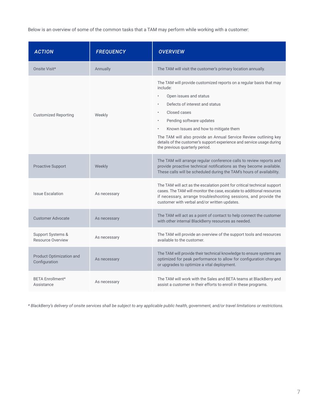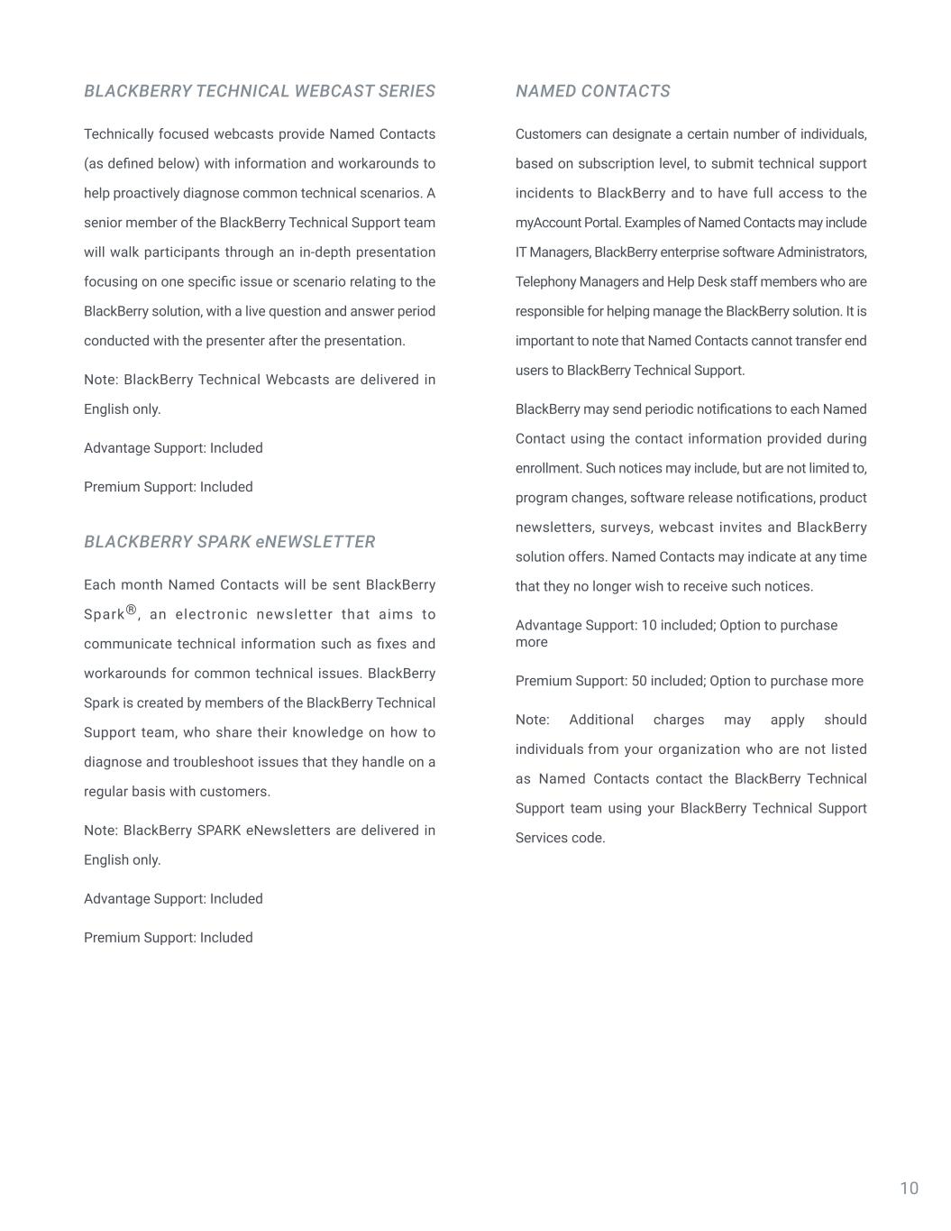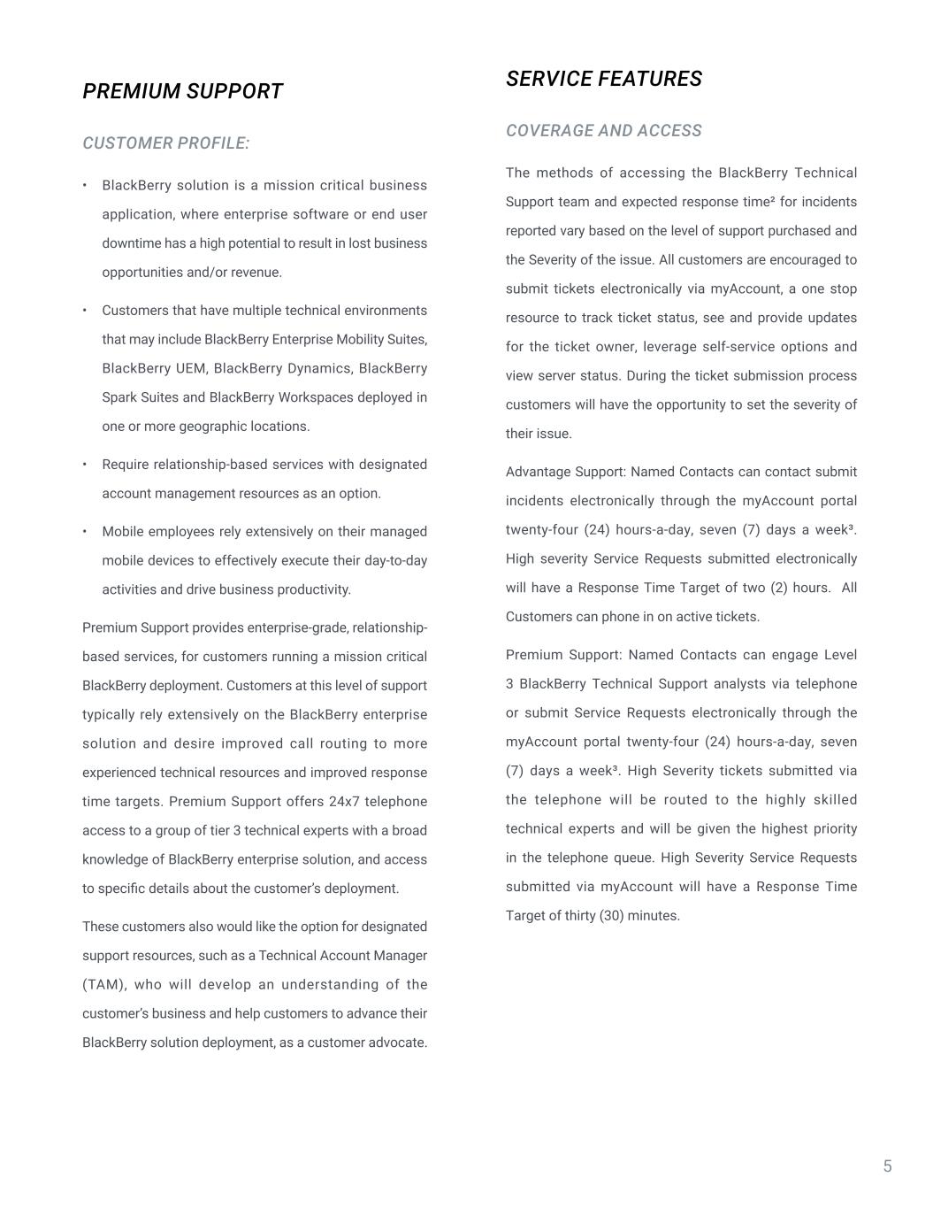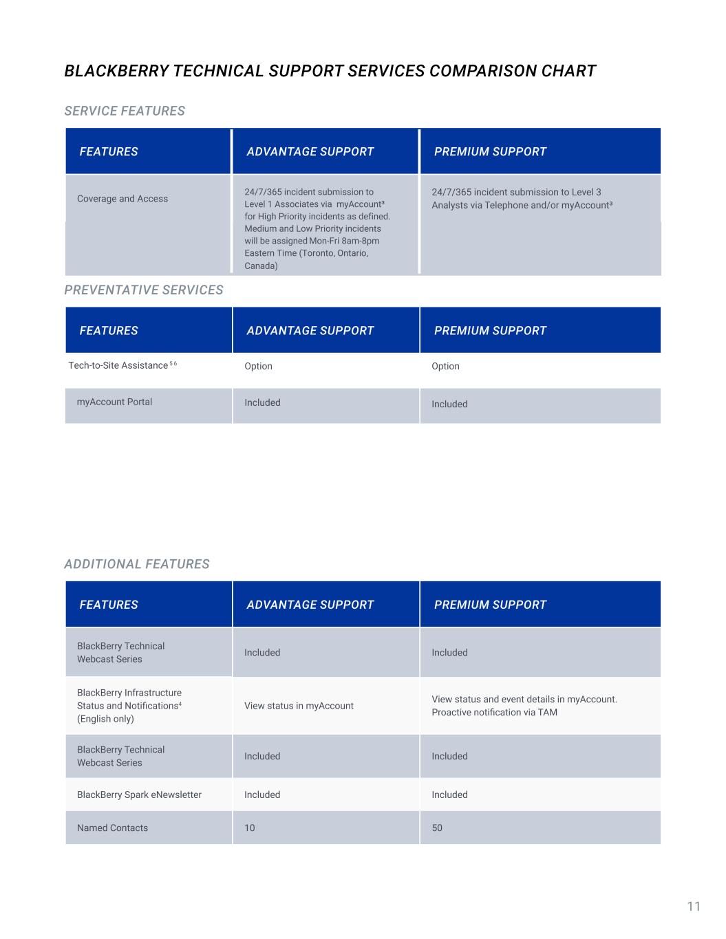 BlackBerry (NYSE: BB; TSX: BB) provides intelligent security software and services to enterprises and governments around the world. The company secures more than 500M endpoints including over 215M vehicles. Based in Waterloo, Ontario, the company leverages AI and machine learning to deliver innovative solutions in the areas of cybersecurity, safety and data privacy solutions, and is a leader in the areas of endpoint security, endpoint management, encryption, and embedded systems. BlackBerry’s vision is clear - to secure a connected future you can trust. For more information, visit BlackBerry.com and follow @BlackBerry. ©2022 BlackBerry Limited Trademarks, including but not limited to BLACKBERRY and EMBLEM De- sign are the trademarks or registered trademarks of BlackBerry Limited, and the exclusive rights to such trademarks are expressly reserved. All other trademarks are the property of their respective owners. BlackBerry is not responsible for any third-party products or services. BB23 | 220826 THERE ARE NO WARRANTIES, EXPRESS OR IMPLIED, WITH RESPECT TO THE CONTENT OF THIS DOCUMENT, AND ALL INFORMATION PROVIDED HEREIN IS PROVIDED “AS IS” EXCEPT AS EXPRESSLY AGREED TO BY BLACKBERRY IN AN AGREEMENT BETWEEN BLACKBERRY AND YOU FOR TECHNICAL SUPPORT, IN NO EVENT SHALL BLACKBERRY OR ANY OF ITS SHAREHOLDERS, AFFILIATES, DIRECTORS, OFFICERS, EMPLOYEES, AGENTS OR SUPPLIERS, BE LIABLE TO ANY PARTY FOR ANY DIRECT, INDIRECT, SPECIAL OR CONSEQUENTIAL, PUNITIVE OR EXEMPLARY DAMAGES FOR ANY USE OF THIS DOCUMENT, INCLUDING WITHOUT LIMITATION, RELIANCE ON THE INFORMATION PRESENTED, LOST PROFITS, LOST DATA, OR BUSINESS INTERRUPTION, ARISING IN CONTRACT, TORT, STRICT LIABILITY OR OTHERWISE, EVEN IF BLACKBERRY WAS EXPRESSLY ADVISED OF THE POSSIBILITY OF SUCH DAMAGES. ¹ May be subject to additional fees. ² The response times are estimates only and shall not be considered a representation or warranty under any agreement with BlackBerry including the Business Services by BlackBerry terms or this Technical Support Services Program Description. ³ Availability of myAccount may be restricted during maintenance and technical upgrades. 4 A valid Non-Disclosure Agreement is required between the customer and BlackBerry. 5 Service only offered where available. 6 A separate set of terms and conditions specific to the use of this service may need to be executed between the customer and BlackBerry. 7 Subject to availability.