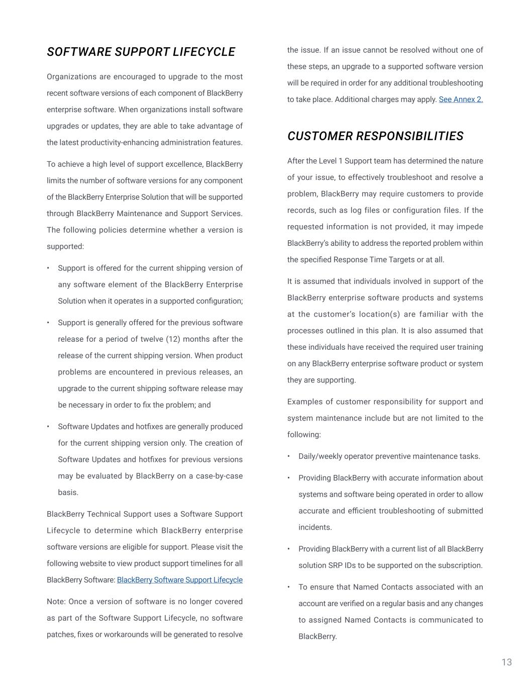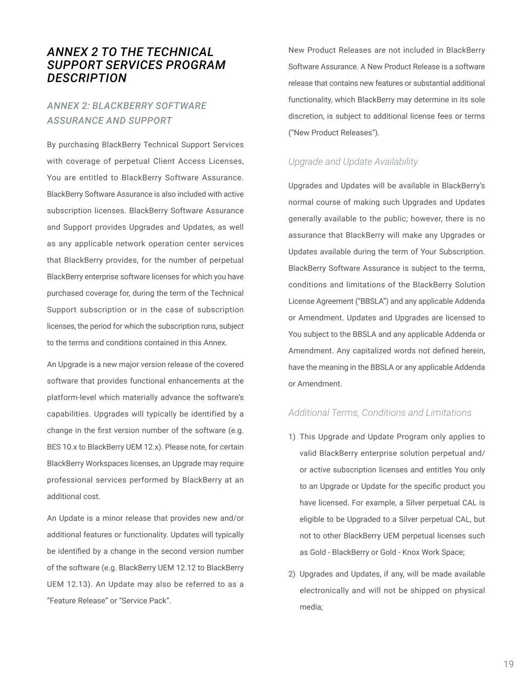 ANNEX 2 TO THE TECHNICAL SUPPORT SERVICES PROGRAM DESCRIPTION ANNEX 2: BLACKBERRY SOFTWARE ASSURANCE AND SUPPORT By purchasing BlackBerry Technical Support Services with coverage of perpetual Client Access Licenses, You are entitled to BlackBerry Software Assurance. BlackBerry Software Assurance is also included with active subscription licenses. BlackBerry Software Assurance and Support provides Upgrades and Updates, as well as any applicable network operation center services that BlackBerry provides, for the number of perpetual BlackBerry enterprise software licenses for which you have purchased coverage for, during the term of the Technical Support subscription or in the case of subscription licenses, the period for which the subscription runs, subject to the terms and conditions contained in this Annex. An Upgrade is a new major version release of the covered software that provides functional enhancements at the platform-level which materially advance the software’s capabilities. Upgrades will typically be identified by a change in the first version number of the software (e.g. BES 10.x to BlackBerry UEM 12.x). Please note, for certain BlackBerry Workspaces licenses, an Upgrade may require professional services performed by BlackBerry at an additional cost. An Update is a minor release that provides new and/or additional features or functionality. Updates will typically be identified by a change in the second version number of the software (e.g. BlackBerry UEM 12.12 to BlackBerry UEM 12.13). An Update may also be referred to as a “Feature Release” or “Service Pack”. New Product Releases are not included in BlackBerry Software Assurance. A New Product Release is a software release that contains new features or substantial additional functionality, which BlackBerry may determine in its sole discretion, is subject to additional license fees or terms (“New Product Releases”). Upgrade and Update Availability Upgrades and Updates will be available in BlackBerry’s normal course of making such Upgrades and Updates generally available to the public; however, there is no assurance that BlackBerry will make any Upgrades or Updates available during the term of Your Subscription. BlackBerry Software Assurance is subject to the terms, conditions and limitations of the BlackBerry Solution License Agreement (“BBSLA”) and any applicable Addenda or Amendment. Updates and Upgrades are licensed to You subject to the BBSLA and any applicable Addenda or Amendment. Any capitalized words not defined herein, have the meaning in the BBSLA or any applicable Addenda or Amendment. Additional Terms, Conditions and Limitations 1) This Upgrade and Update Program only applies to valid BlackBerry enterprise solution perpetual and/ or active subscription licenses and entitles You only to an Upgrade or Update for the specific product you have licensed. For example, a Silver perpetual CAL is eligible to be Upgraded to a Silver perpetual CAL, but not to other BlackBerry UEM perpetual licenses such as Gold - BlackBerry or Gold - Knox Work Space; 2) Upgrades and Updates, if any, will be made available electronically and will not be shipped on physical media; 19