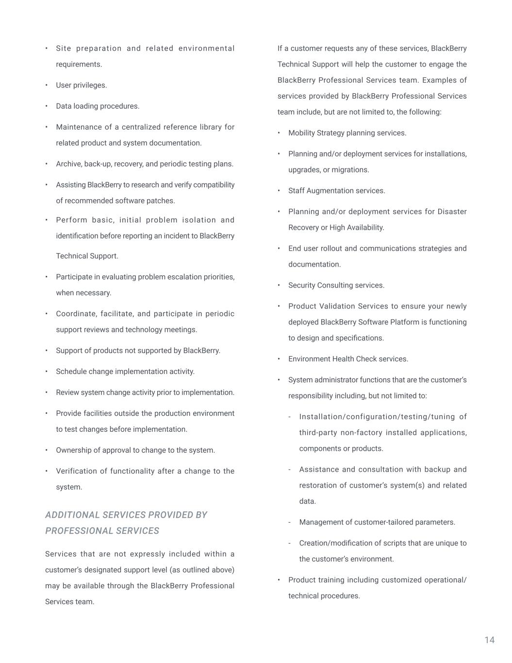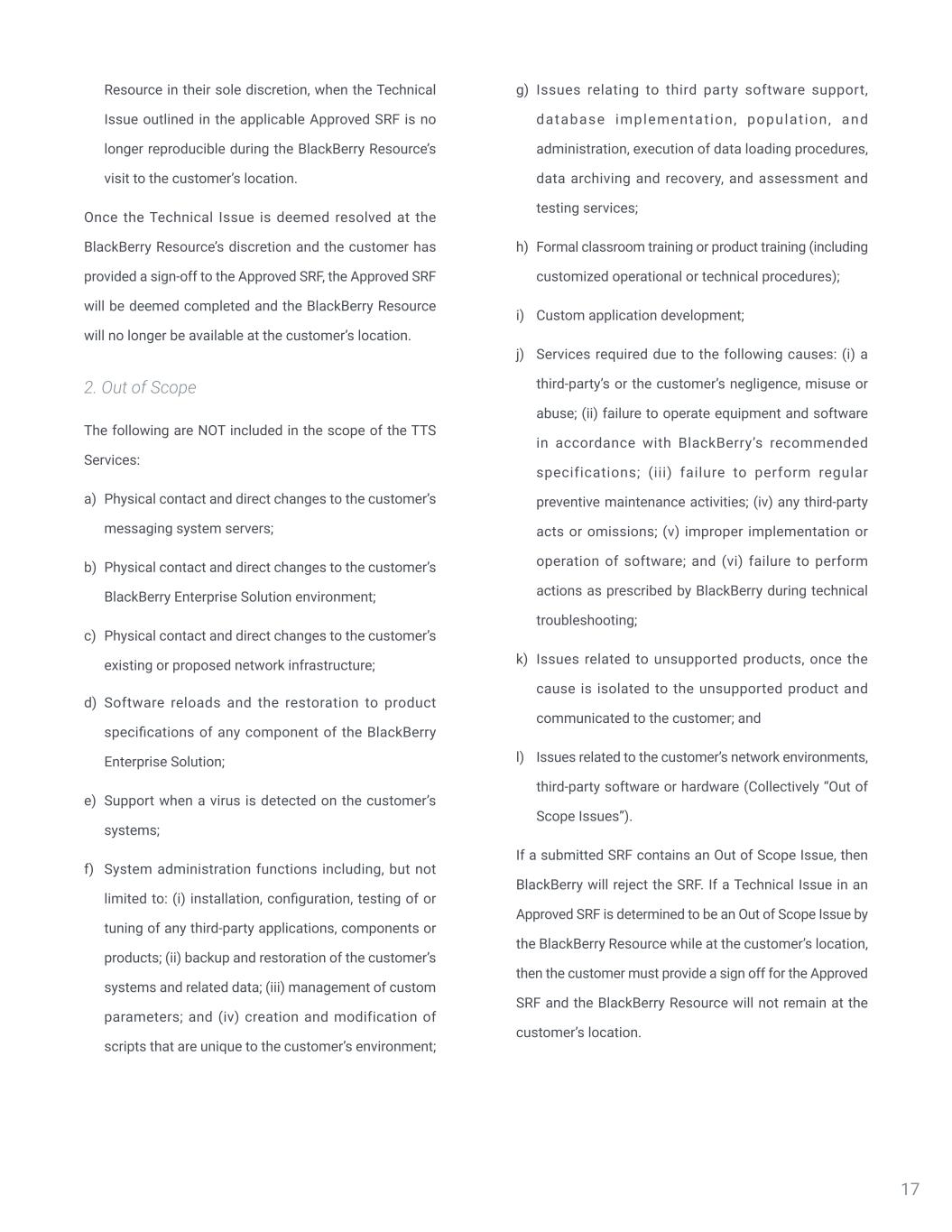 Resource in their sole discretion, when the Technical Issue outlined in the applicable Approved SRF is no longer reproducible during the BlackBerry Resource’s visit to the customer’s location. Once the Technical Issue is deemed resolved at the BlackBerry Resource’s discretion and the customer has provided a sign-off to the Approved SRF, the Approved SRF will be deemed completed and the BlackBerry Resource will no longer be available at the customer’s location. 2. Out of Scope The following are NOT included in the scope of the TTS Services: a) Physical contact and direct changes to the customer’s messaging system servers; b) Physical contact and direct changes to the customer’s BlackBerry Enterprise Solution environment; c) Physical contact and direct changes to the customer’s existing or proposed network infrastructure; d) Software reloads and the restoration to product specifications of any component of the BlackBerry Enterprise Solution; e) Support when a virus is detected on the customer’s systems; f) System administration functions including, but not limited to: (i) installation, configuration, testing of or tuning of any third-party applications, components or products; (ii) backup and restoration of the customer’s systems and related data; (iii) management of custom parameters; and (iv) creation and modification of scripts that are unique to the customer’s environment; g) Issues relating to third party software support, database implementat ion, populat ion, and administration, execution of data loading procedures, data archiving and recovery, and assessment and testing services; h) Formal classroom training or product training (including customized operational or technical procedures); i) Custom application development; j) Services required due to the following causes: (i) a third-party’s or the customer’s negligence, misuse or abuse; (ii) failure to operate equipment and software in accordance with BlackBerry’s recommended specifications; (iii) failure to perform regular preventive maintenance activities; (iv) any third-party acts or omissions; (v) improper implementation or operation of software; and (vi) failure to perform actions as prescribed by BlackBerry during technical troubleshooting; k) Issues related to unsupported products, once the cause is isolated to the unsupported product and communicated to the customer; and l) Issues related to the customer’s network environments, third-party software or hardware (Collectively “Out of Scope Issues”). If a submitted SRF contains an Out of Scope Issue, then BlackBerry will reject the SRF. If a Technical Issue in an Approved SRF is determined to be an Out of Scope Issue by the BlackBerry Resource while at the customer’s location, then the customer must provide a sign off for the Approved SRF and the BlackBerry Resource will not remain at the customer’s location. 17