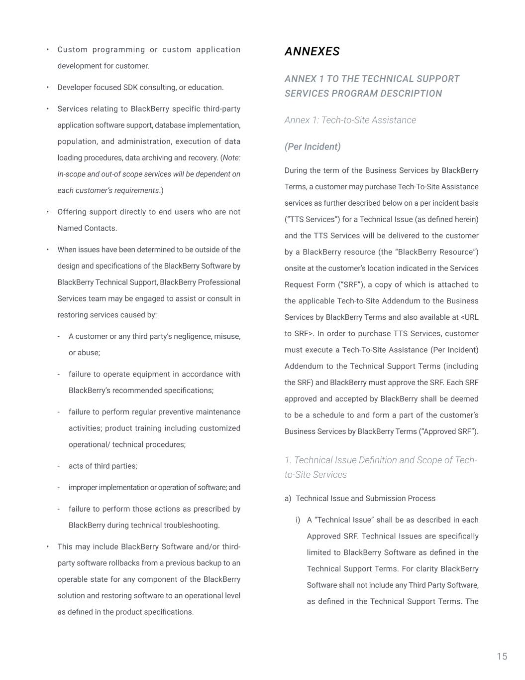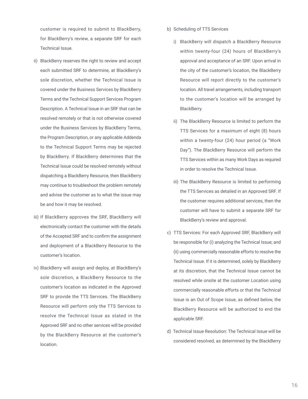 customer is required to submit to BlackBerry, for BlackBerry’s review, a separate SRF for each Technical Issue. ii) BlackBerry reserves the right to review and accept each submitted SRF to determine, at BlackBerry’s sole discretion, whether the Technical Issue is covered under the Business Services by BlackBerry Terms and the Technical Support Services Program Description. A Technical Issue in an SRF that can be resolved remotely or that is not otherwise covered under the Business Services by BlackBerry Terms, the Program Description, or any applicable Addenda to the Technical Support Terms may be rejected by BlackBerry. If BlackBerry determines that the Technical Issue could be resolved remotely without dispatching a BlackBerry Resource, then BlackBerry may continue to troubleshoot the problem remotely and advise the customer as to what the issue may be and how it may be resolved. iii) If BlackBerry approves the SRF, BlackBerry will electronically contact the customer with the details of the Accepted SRF and to confirm the assignment and deployment of a BlackBerry Resource to the customer’s location. iv) BlackBerry will assign and deploy, at BlackBerry’s sole discretion, a BlackBerry Resource to the customer’s location as indicated in the Approved SRF to provide the TTS Services. The BlackBerry Resource will perform only the TTS Services to resolve the Technical Issue as stated in the Approved SRF and no other services will be provided by the BlackBerry Resource at the customer’s location. b) Scheduling of TTS Services i) BlackBerry will dispatch a BlackBerry Resource within twenty-four (24) hours of BlackBerry’s approval and acceptance of an SRF. Upon arrival in the city of the customer’s location, the BlackBerry Resource will report directly to the customer’s location. All travel arrangements, including transport to the customer’s location will be arranged by BlackBerry. ii) The BlackBerry Resource is limited to perform the TTS Services for a maximum of eight (8) hours within a twenty-four (24) hour period (a “Work Day”). The BlackBerry Resource will perform the TTS Services within as many Work Days as required in order to resolve the Technical Issue. iii) The BlackBerry Resource is limited to performing the TTS Services as detailed in an Approved SRF. If the customer requires additional services, then the customer will have to submit a separate SRF for BlackBerry’s review and approval. c) TTS Services: For each Approved SRF, BlackBerry will be responsible for (i) analyzing the Technical Issue; and (ii) using commercially reasonable efforts to resolve the Technical Issue. If it is determined, solely by BlackBerry at its discretion, that the Technical Issue cannot be resolved while onsite at the customer Location using commercially reasonable efforts or that the Technical Issue is an Out of Scope Issue, as defined below, the BlackBerry Resource will be authorized to end the applicable SRF. d) Technical Issue Resolution: The Technical Issue will be considered resolved, as determined by the BlackBerry 16