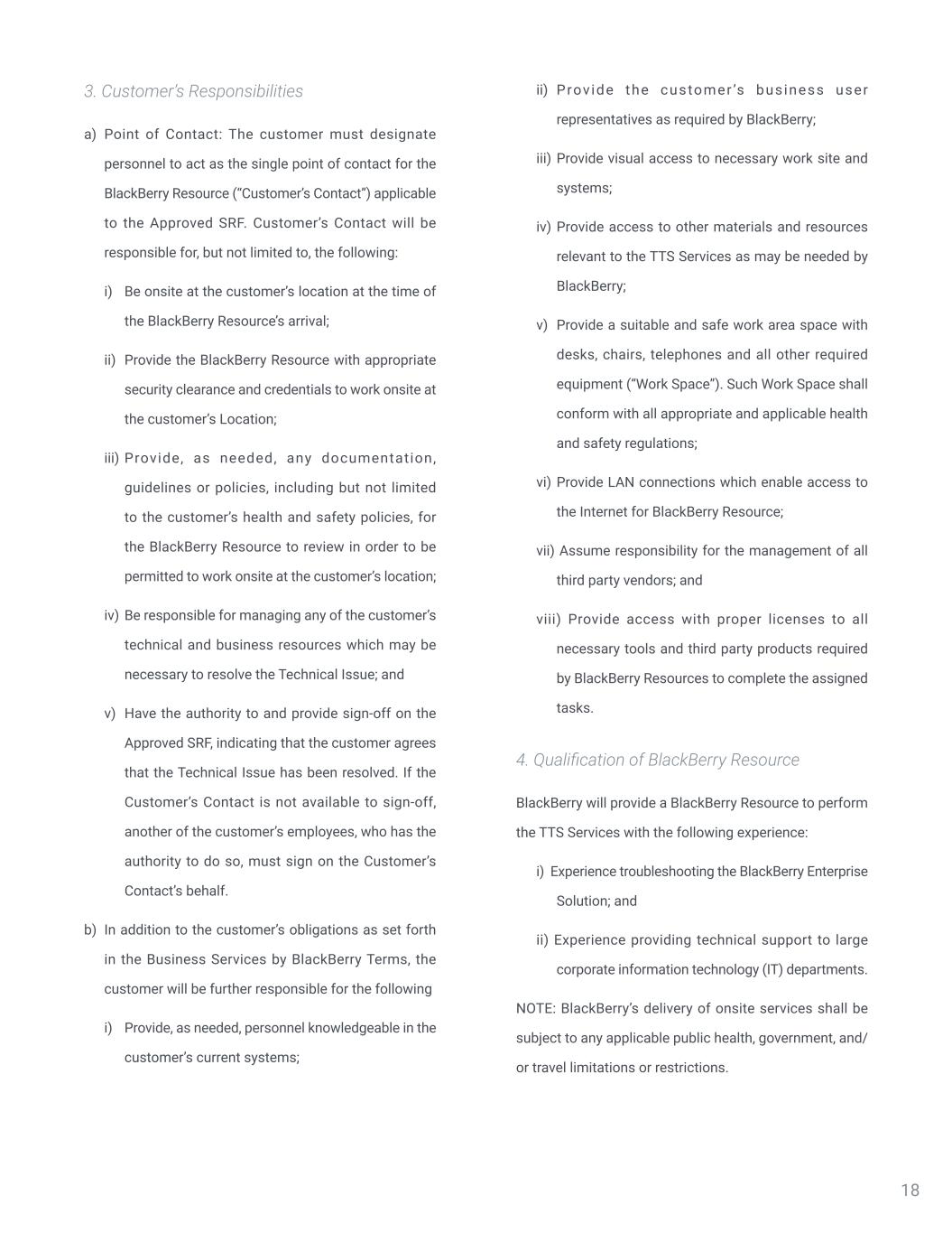 3. Customer’s Responsibilities a) Point of Contact: The customer must designate personnel to act as the single point of contact for the BlackBerry Resource (“Customer’s Contact”) applicable to the Approved SRF. Customer’s Contact will be responsible for, but not limited to, the following: i) Be onsite at the customer’s location at the time of the BlackBerry Resource’s arrival; ii) Provide the BlackBerry Resource with appropriate security clearance and credentials to work onsite at the customer’s Location; iii) Provide, as needed, any documentation, guidelines or policies, including but not limited to the customer’s health and safety policies, for the BlackBerry Resource to review in order to be permitted to work onsite at the customer’s location; iv) Be responsible for managing any of the customer’s technical and business resources which may be necessary to resolve the Technical Issue; and v) Have the authority to and provide sign-off on the Approved SRF, indicating that the customer agrees that the Technical Issue has been resolved. If the Customer’s Contact is not available to sign-off, another of the customer’s employees, who has the authority to do so, must sign on the Customer’s Contact’s behalf. b) In addition to the customer’s obligations as set forth in the Business Services by BlackBerry Terms, the customer will be further responsible for the following i) Provide, as needed, personnel knowledgeable in the customer’s current systems; ii) Prov ide the customer ’s bus iness user representatives as required by BlackBerry; iii) Provide visual access to necessary work site and systems; iv) Provide access to other materials and resources relevant to the TTS Services as may be needed by BlackBerry; v) Provide a suitable and safe work area space with desks, chairs, telephones and all other required equipment (“Work Space”). Such Work Space shall conform with all appropriate and applicable health and safety regulations; vi) Provide LAN connections which enable access to the Internet for BlackBerry Resource; vii) Assume responsibility for the management of all third party vendors; and viii) Provide access with proper licenses to all necessary tools and third party products required by BlackBerry Resources to complete the assigned tasks. 4. Qualification of BlackBerry Resource BlackBerry will provide a BlackBerry Resource to perform the TTS Services with the following experience: i) Experience troubleshooting the BlackBerry Enterprise Solution; and ii) Experience providing technical support to large corporate information technology (IT) departments. NOTE: BlackBerry’s delivery of onsite services shall be subject to any applicable public health, government, and/ or travel limitations or restrictions. 18