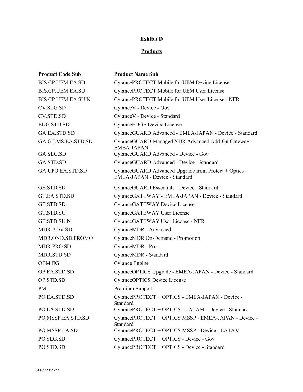 311393987 v11 Exhibit D Products Product Code Sub Product Name Sub BIS.CP.UEM.EA.SD CylancePROTECT Mobile for UEM Device License BIS.CP.UEM.EA.SU CylancePROTECT Mobile for UEM User License BIS.CP.UEM.EA.SU.N CylancePROTECT Mobile for UEM User License - NFR CV.SLG.SD CylanceV - Device - Gov CV.STD.SD CylanceV - Device - Standard EDG.STD.SD CylanceEDGE Device License GA.EA.STD.SD CylanceGUARD Advanced - EMEA-JAPAN - Device - Standard GA.GT.MS.EA.STD.SD CylanceGUARD Managed XDR Advanced Add-On Gateway - EMEA-JAPAN GA.SLG.SD CylanceGUARD Advanced - Device - Gov GA.STD.SD CylanceGUARD Advanced - Device - Standard GA.UPO.EA.STD.SD CylanceGUARD Advanced Upgrade from Protect + Optics - EMEA-JAPAN - Device - Standard GE.STD.SD CylanceGUARD Essentials - Device - Standard GT.EA.STD.SD CylanceGATEWAY - EMEA-JAPAN - Device - Standard GT.STD.SD CylanceGATEWAY Device License GT.STD.SU CylanceGATEWAY User License GT.STD.SU.N CylanceGATEWAY User License - NFR MDR.ADV.SD CylanceMDR - Advanced MDR.OND.SD.PROMO CylanceMDR On-Demand - Promotion MDR.PRO.SD CylanceMDR - Pro MDR.STD.SD CylanceMDR - Standard OEM.EG Cylance Engine OP.EA.STD.SD CylanceOPTICS Upgrade - EMEA-JAPAN - Device - Standard OP.STD.SD CylanceOPTICS Device License PM Premium Support PO.EA.STD.SD CylancePROTECT + OPTICS - EMEA-JAPAN - Device - Standard PO.LA.STD.SD CylancePROTECT + OPTICS - LATAM - Device - Standard PO.MSSP.EA.STD.SD CylancePROTECT + OPTICS MSSP - EMEA-JAPAN - Device - Standard PO.MSSP.LA.SD CylancePROTECT + OPTICS MSSP - Device - LATAM PO.SLG.SD CylancePROTECT + OPTICS - Device - Gov PO.STD.SD CylancePROTECT + OPTICS - Device - Standard