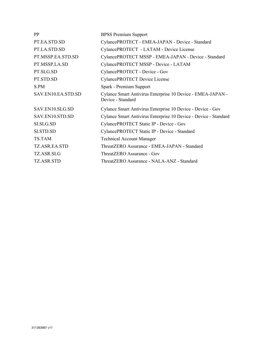 311393987 v11 PP BPSS Premium Support PT.EA.STD.SD CylancePROTECT - EMEA-JAPAN - Device - Standard PT.LA.STD.SD CylancePROTECT - LATAM - Device License PT.MSSP.EA.STD.SD CylancePROTECT MSSP - EMEA-JAPAN - Device - Standard PT.MSSP.LA.SD CylancePROTECT MSSP - Device - LATAM PT.SLG.SD CylancePROTECT - Device - Gov PT.STD.SD CylancePROTECT Device License S.PM Spark - Premium Support SAV.EN10.EA.STD.SD Cylance Smart Antivirus Enterprise 10 Device - EMEA-JAPAN - Device - Standard SAV.EN10.SLG.SD Cylance Smart Antivirus Enterprise 10 Device - Device - Gov SAV.EN10.STD.SD Cylance Smart Antivirus Enterprise 10 Device - Device - Standard SI.SLG.SD CylancePROTECT Static IP - Device - Gov SI.STD.SD CylancePROTECT Static IP - Device - Standard TS.TAM Technical Account Manager TZ.ASR.EA.STD ThreatZERO Assurance - EMEA-JAPAN - Standard TZ.ASR.SLG ThreatZERO Assurance - Gov TZ.ASR.STD ThreatZERO Assurance - NALA-ANZ - Standard