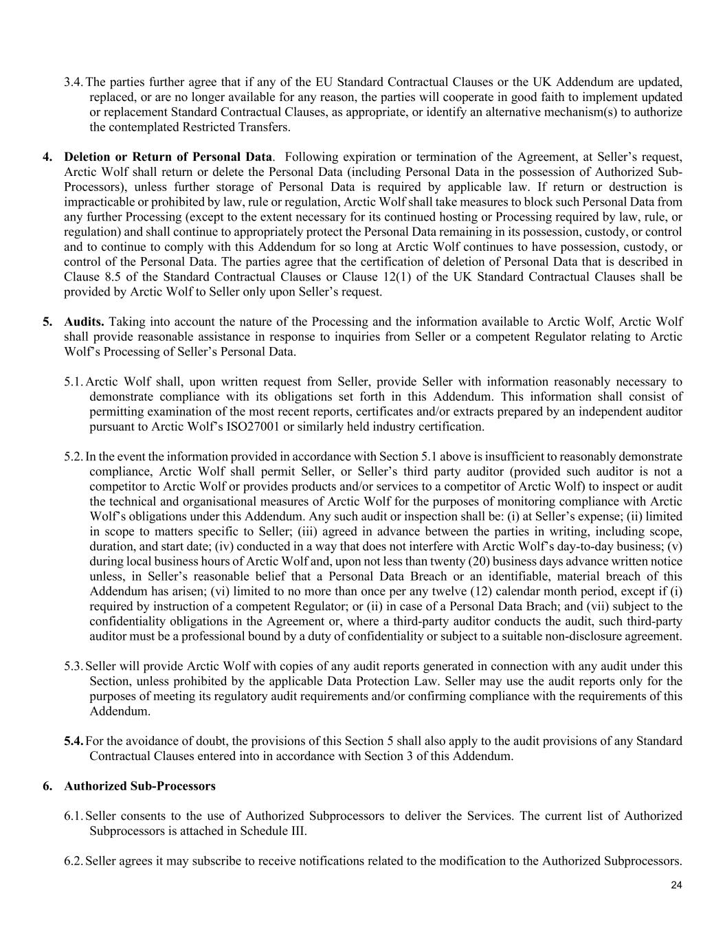 24 3.4. The parties further agree that if any of the EU Standard Contractual Clauses or the UK Addendum are updated, replaced, or are no longer available for any reason, the parties will cooperate in good faith to implement updated or replacement Standard Contractual Clauses, as appropriate, or identify an alternative mechanism(s) to authorize the contemplated Restricted Transfers. 4. Deletion or Return of Personal Data. Following expiration or termination of the Agreement, at Seller’s request, Arctic Wolf shall return or delete the Personal Data (including Personal Data in the possession of Authorized Sub- Processors), unless further storage of Personal Data is required by applicable law. If return or destruction is impracticable or prohibited by law, rule or regulation, Arctic Wolf shall take measures to block such Personal Data from any further Processing (except to the extent necessary for its continued hosting or Processing required by law, rule, or regulation) and shall continue to appropriately protect the Personal Data remaining in its possession, custody, or control and to continue to comply with this Addendum for so long at Arctic Wolf continues to have possession, custody, or control of the Personal Data. The parties agree that the certification of deletion of Personal Data that is described in Clause 8.5 of the Standard Contractual Clauses or Clause 12(1) of the UK Standard Contractual Clauses shall be provided by Arctic Wolf to Seller only upon Seller’s request. 5. Audits. Taking into account the nature of the Processing and the information available to Arctic Wolf, Arctic Wolf shall provide reasonable assistance in response to inquiries from Seller or a competent Regulator relating to Arctic Wolf’s Processing of Seller’s Personal Data. 5.1. Arctic Wolf shall, upon written request from Seller, provide Seller with information reasonably necessary to demonstrate compliance with its obligations set forth in this Addendum. This information shall consist of permitting examination of the most recent reports, certificates and/or extracts prepared by an independent auditor pursuant to Arctic Wolf’s ISO27001 or similarly held industry certification. 5.2. In the event the information provided in accordance with Section 5.1 above is insufficient to reasonably demonstrate compliance, Arctic Wolf shall permit Seller, or Seller’s third party auditor (provided such auditor is not a competitor to Arctic Wolf or provides products and/or services to a competitor of Arctic Wolf) to inspect or audit the technical and organisational measures of Arctic Wolf for the purposes of monitoring compliance with Arctic Wolf’s obligations under this Addendum. Any such audit or inspection shall be: (i) at Seller’s expense; (ii) limited in scope to matters specific to Seller; (iii) agreed in advance between the parties in writing, including scope, duration, and start date; (iv) conducted in a way that does not interfere with Arctic Wolf’s day-to-day business; (v) during local business hours of Arctic Wolf and, upon not less than twenty (20) business days advance written notice unless, in Seller’s reasonable belief that a Personal Data Breach or an identifiable, material breach of this Addendum has arisen; (vi) limited to no more than once per any twelve (12) calendar month period, except if (i) required by instruction of a competent Regulator; or (ii) in case of a Personal Data Brach; and (vii) subject to the confidentiality obligations in the Agreement or, where a third-party auditor conducts the audit, such third-party auditor must be a professional bound by a duty of confidentiality or subject to a suitable non-disclosure agreement. 5.3. Seller will provide Arctic Wolf with copies of any audit reports generated in connection with any audit under this Section, unless prohibited by the applicable Data Protection Law. Seller may use the audit reports only for the purposes of meeting its regulatory audit requirements and/or confirming compliance with the requirements of this Addendum. 5.4. For the avoidance of doubt, the provisions of this Section 5 shall also apply to the audit provisions of any Standard Contractual Clauses entered into in accordance with Section 3 of this Addendum. 6. Authorized Sub-Processors 6.1. Seller consents to the use of Authorized Subprocessors to deliver the Services. The current list of Authorized Subprocessors is attached in Schedule III. 6.2. Seller agrees it may subscribe to receive notifications related to the modification to the Authorized Subprocessors.