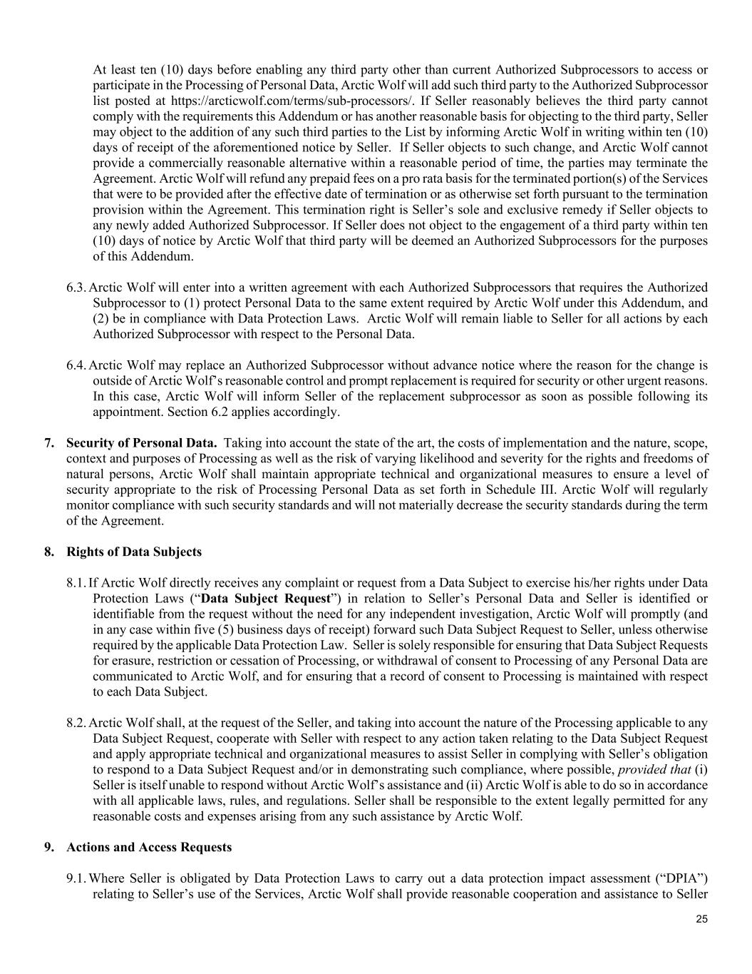 25 At least ten (10) days before enabling any third party other than current Authorized Subprocessors to access or participate in the Processing of Personal Data, Arctic Wolf will add such third party to the Authorized Subprocessor list posted at https://arcticwolf.com/terms/sub-processors/. If Seller reasonably believes the third party cannot comply with the requirements this Addendum or has another reasonable basis for objecting to the third party, Seller may object to the addition of any such third parties to the List by informing Arctic Wolf in writing within ten (10) days of receipt of the aforementioned notice by Seller. If Seller objects to such change, and Arctic Wolf cannot provide a commercially reasonable alternative within a reasonable period of time, the parties may terminate the Agreement. Arctic Wolf will refund any prepaid fees on a pro rata basis for the terminated portion(s) of the Services that were to be provided after the effective date of termination or as otherwise set forth pursuant to the termination provision within the Agreement. This termination right is Seller’s sole and exclusive remedy if Seller objects to any newly added Authorized Subprocessor. If Seller does not object to the engagement of a third party within ten (10) days of notice by Arctic Wolf that third party will be deemed an Authorized Subprocessors for the purposes of this Addendum. 6.3. Arctic Wolf will enter into a written agreement with each Authorized Subprocessors that requires the Authorized Subprocessor to (1) protect Personal Data to the same extent required by Arctic Wolf under this Addendum, and (2) be in compliance with Data Protection Laws. Arctic Wolf will remain liable to Seller for all actions by each Authorized Subprocessor with respect to the Personal Data. 6.4. Arctic Wolf may replace an Authorized Subprocessor without advance notice where the reason for the change is outside of Arctic Wolf’s reasonable control and prompt replacement is required for security or other urgent reasons. In this case, Arctic Wolf will inform Seller of the replacement subprocessor as soon as possible following its appointment. Section 6.2 applies accordingly. 7. Security of Personal Data. Taking into account the state of the art, the costs of implementation and the nature, scope, context and purposes of Processing as well as the risk of varying likelihood and severity for the rights and freedoms of natural persons, Arctic Wolf shall maintain appropriate technical and organizational measures to ensure a level of security appropriate to the risk of Processing Personal Data as set forth in Schedule III. Arctic Wolf will regularly monitor compliance with such security standards and will not materially decrease the security standards during the term of the Agreement. 8. Rights of Data Subjects 8.1. If Arctic Wolf directly receives any complaint or request from a Data Subject to exercise his/her rights under Data Protection Laws (“Data Subject Request”) in relation to Seller’s Personal Data and Seller is identified or identifiable from the request without the need for any independent investigation, Arctic Wolf will promptly (and in any case within five (5) business days of receipt) forward such Data Subject Request to Seller, unless otherwise required by the applicable Data Protection Law. Seller is solely responsible for ensuring that Data Subject Requests for erasure, restriction or cessation of Processing, or withdrawal of consent to Processing of any Personal Data are communicated to Arctic Wolf, and for ensuring that a record of consent to Processing is maintained with respect to each Data Subject. 8.2. Arctic Wolf shall, at the request of the Seller, and taking into account the nature of the Processing applicable to any Data Subject Request, cooperate with Seller with respect to any action taken relating to the Data Subject Request and apply appropriate technical and organizational measures to assist Seller in complying with Seller’s obligation to respond to a Data Subject Request and/or in demonstrating such compliance, where possible, provided that (i) Seller is itself unable to respond without Arctic Wolf’s assistance and (ii) Arctic Wolf is able to do so in accordance with all applicable laws, rules, and regulations. Seller shall be responsible to the extent legally permitted for any reasonable costs and expenses arising from any such assistance by Arctic Wolf. 9. Actions and Access Requests 9.1. Where Seller is obligated by Data Protection Laws to carry out a data protection impact assessment (“DPIA”) relating to Seller’s use of the Services, Arctic Wolf shall provide reasonable cooperation and assistance to Seller