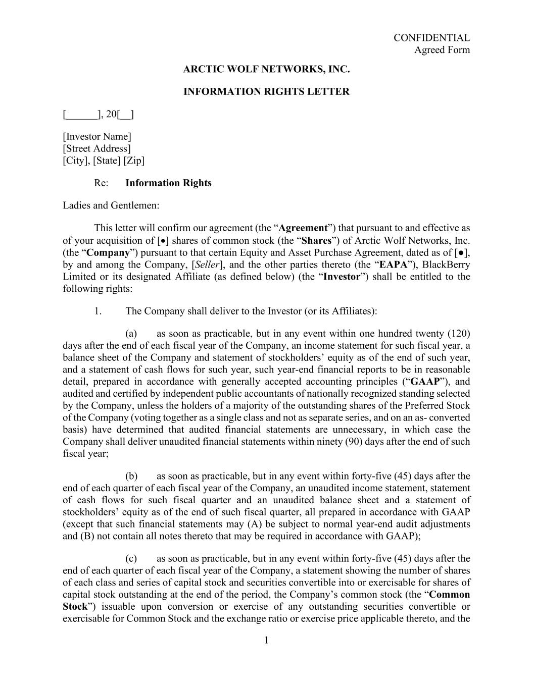 CONFIDENTIAL Agreed Form 1 ARCTIC WOLF NETWORKS, INC. INFORMATION RIGHTS LETTER [______], 20[__] [Investor Name] [Street Address] [City], [State] [Zip] Re: Information Rights Ladies and Gentlemen: This letter will confirm our agreement (the “Agreement”) that pursuant to and effective as of your acquisition of [•] shares of common stock (the “Shares”) of Arctic Wolf Networks, Inc. (the “Company”) pursuant to that certain Equity and Asset Purchase Agreement, dated as of [●], by and among the Company, [Seller], and the other parties thereto (the “EAPA”), BlackBerry Limited or its designated Affiliate (as defined below) (the “Investor”) shall be entitled to the following rights: 1. The Company shall deliver to the Investor (or its Affiliates): (a) as soon as practicable, but in any event within one hundred twenty (120) days after the end of each fiscal year of the Company, an income statement for such fiscal year, a balance sheet of the Company and statement of stockholders’ equity as of the end of such year, and a statement of cash flows for such year, such year-end financial reports to be in reasonable detail, prepared in accordance with generally accepted accounting principles (“GAAP”), and audited and certified by independent public accountants of nationally recognized standing selected by the Company, unless the holders of a majority of the outstanding shares of the Preferred Stock of the Company (voting together as a single class and not as separate series, and on an as- converted basis) have determined that audited financial statements are unnecessary, in which case the Company shall deliver unaudited financial statements within ninety (90) days after the end of such fiscal year; (b) as soon as practicable, but in any event within forty-five (45) days after the end of each quarter of each fiscal year of the Company, an unaudited income statement, statement of cash flows for such fiscal quarter and an unaudited balance sheet and a statement of stockholders’ equity as of the end of such fiscal quarter, all prepared in accordance with GAAP (except that such financial statements may (A) be subject to normal year-end audit adjustments and (B) not contain all notes thereto that may be required in accordance with GAAP); (c) as soon as practicable, but in any event within forty-five (45) days after the end of each quarter of each fiscal year of the Company, a statement showing the number of shares of each class and series of capital stock and securities convertible into or exercisable for shares of capital stock outstanding at the end of the period, the Company’s common stock (the “Common Stock”) issuable upon conversion or exercise of any outstanding securities convertible or exercisable for Common Stock and the exchange ratio or exercise price applicable thereto, and the