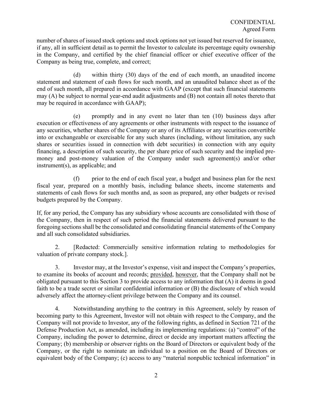 CONFIDENTIAL Agreed Form 2 number of shares of issued stock options and stock options not yet issued but reserved for issuance, if any, all in sufficient detail as to permit the Investor to calculate its percentage equity ownership in the Company, and certified by the chief financial officer or chief executive officer of the Company as being true, complete, and correct; (d) within thirty (30) days of the end of each month, an unaudited income statement and statement of cash flows for such month, and an unaudited balance sheet as of the end of such month, all prepared in accordance with GAAP (except that such financial statements may (A) be subject to normal year-end audit adjustments and (B) not contain all notes thereto that may be required in accordance with GAAP); (e) promptly and in any event no later than ten (10) business days after execution or effectiveness of any agreements or other instruments with respect to the issuance of any securities, whether shares of the Company or any of its Affiliates or any securities convertible into or exchangeable or exercisable for any such shares (including, without limitation, any such shares or securities issued in connection with debt securities) in connection with any equity financing, a description of such security, the per share price of such security and the implied pre- money and post-money valuation of the Company under such agreement(s) and/or other instrument(s), as applicable; and (f) prior to the end of each fiscal year, a budget and business plan for the next fiscal year, prepared on a monthly basis, including balance sheets, income statements and statements of cash flows for such months and, as soon as prepared, any other budgets or revised budgets prepared by the Company. If, for any period, the Company has any subsidiary whose accounts are consolidated with those of the Company, then in respect of such period the financial statements delivered pursuant to the foregoing sections shall be the consolidated and consolidating financial statements of the Company and all such consolidated subsidiaries. 2. [Redacted: Commercially sensitive information relating to methodologies for valuation of private company stock.]. 3. Investor may, at the Investor’s expense, visit and inspect the Company’s properties, to examine its books of account and records; provided, however, that the Company shall not be obligated pursuant to this Section 3 to provide access to any information that (A) it deems in good faith to be a trade secret or similar confidential information or (B) the disclosure of which would adversely affect the attorney-client privilege between the Company and its counsel. 4. Notwithstanding anything to the contrary in this Agreement, solely by reason of becoming party to this Agreement, Investor will not obtain with respect to the Company, and the Company will not provide to Investor, any of the following rights, as defined in Section 721 of the Defense Production Act, as amended, including its implementing regulations: (a) “control” of the Company, including the power to determine, direct or decide any important matters affecting the Company; (b) membership or observer rights on the Board of Directors or equivalent body of the Company, or the right to nominate an individual to a position on the Board of Directors or equivalent body of the Company; (c) access to any “material nonpublic technical information” in