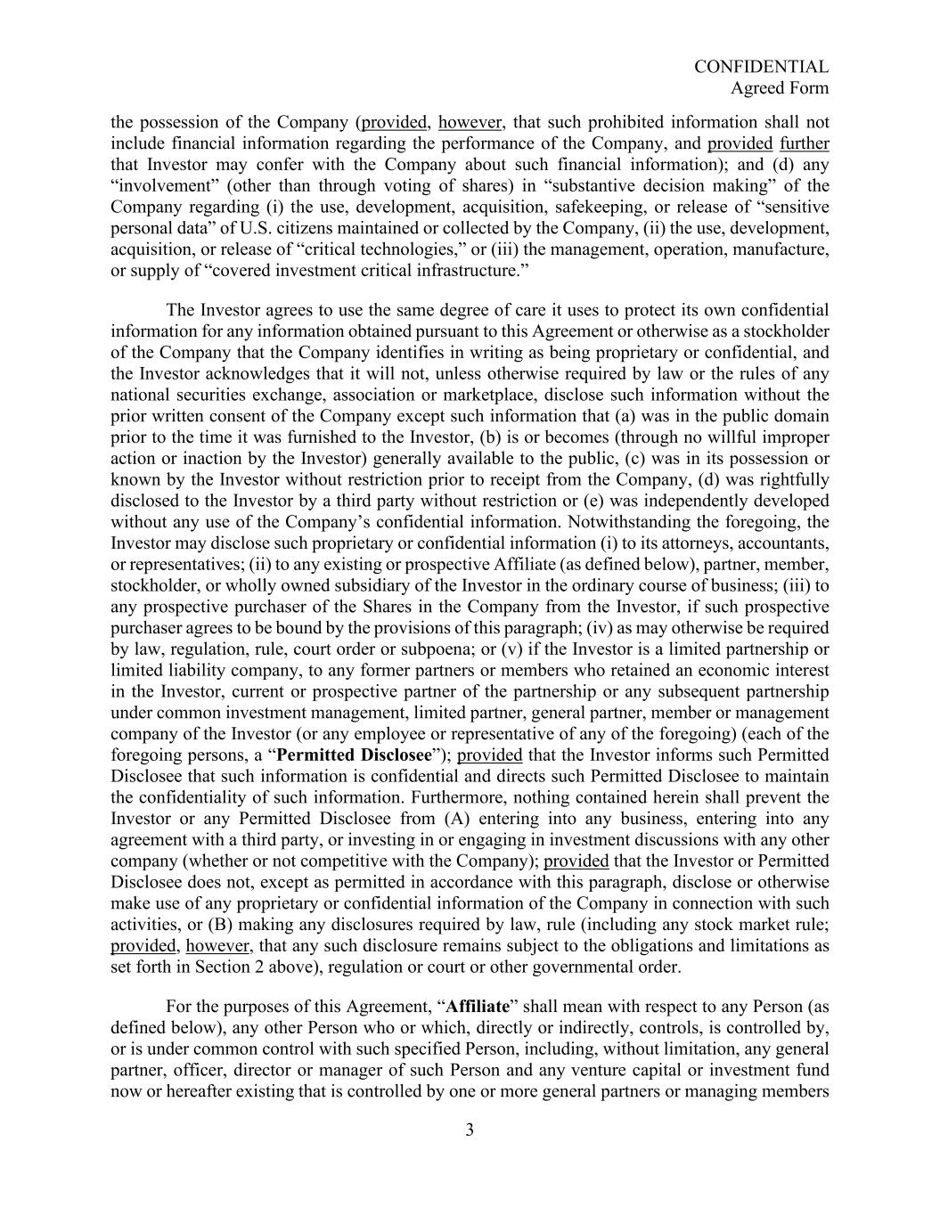 CONFIDENTIAL Agreed Form 3 the possession of the Company (provided, however, that such prohibited information shall not include financial information regarding the performance of the Company, and provided further that Investor may confer with the Company about such financial information); and (d) any “involvement” (other than through voting of shares) in “substantive decision making” of the Company regarding (i) the use, development, acquisition, safekeeping, or release of “sensitive personal data” of U.S. citizens maintained or collected by the Company, (ii) the use, development, acquisition, or release of “critical technologies,” or (iii) the management, operation, manufacture, or supply of “covered investment critical infrastructure.” The Investor agrees to use the same degree of care it uses to protect its own confidential information for any information obtained pursuant to this Agreement or otherwise as a stockholder of the Company that the Company identifies in writing as being proprietary or confidential, and the Investor acknowledges that it will not, unless otherwise required by law or the rules of any national securities exchange, association or marketplace, disclose such information without the prior written consent of the Company except such information that (a) was in the public domain prior to the time it was furnished to the Investor, (b) is or becomes (through no willful improper action or inaction by the Investor) generally available to the public, (c) was in its possession or known by the Investor without restriction prior to receipt from the Company, (d) was rightfully disclosed to the Investor by a third party without restriction or (e) was independently developed without any use of the Company’s confidential information. Notwithstanding the foregoing, the Investor may disclose such proprietary or confidential information (i) to its attorneys, accountants, or representatives; (ii) to any existing or prospective Affiliate (as defined below), partner, member, stockholder, or wholly owned subsidiary of the Investor in the ordinary course of business; (iii) to any prospective purchaser of the Shares in the Company from the Investor, if such prospective purchaser agrees to be bound by the provisions of this paragraph; (iv) as may otherwise be required by law, regulation, rule, court order or subpoena; or (v) if the Investor is a limited partnership or limited liability company, to any former partners or members who retained an economic interest in the Investor, current or prospective partner of the partnership or any subsequent partnership under common investment management, limited partner, general partner, member or management company of the Investor (or any employee or representative of any of the foregoing) (each of the foregoing persons, a “Permitted Disclosee”); provided that the Investor informs such Permitted Disclosee that such information is confidential and directs such Permitted Disclosee to maintain the confidentiality of such information. Furthermore, nothing contained herein shall prevent the Investor or any Permitted Disclosee from (A) entering into any business, entering into any agreement with a third party, or investing in or engaging in investment discussions with any other company (whether or not competitive with the Company); provided that the Investor or Permitted Disclosee does not, except as permitted in accordance with this paragraph, disclose or otherwise make use of any proprietary or confidential information of the Company in connection with such activities, or (B) making any disclosures required by law, rule (including any stock market rule; provided, however, that any such disclosure remains subject to the obligations and limitations as set forth in Section 2 above), regulation or court or other governmental order. For the purposes of this Agreement, “Affiliate” shall mean with respect to any Person (as defined below), any other Person who or which, directly or indirectly, controls, is controlled by, or is under common control with such specified Person, including, without limitation, any general partner, officer, director or manager of such Person and any venture capital or investment fund now or hereafter existing that is controlled by one or more general partners or managing members