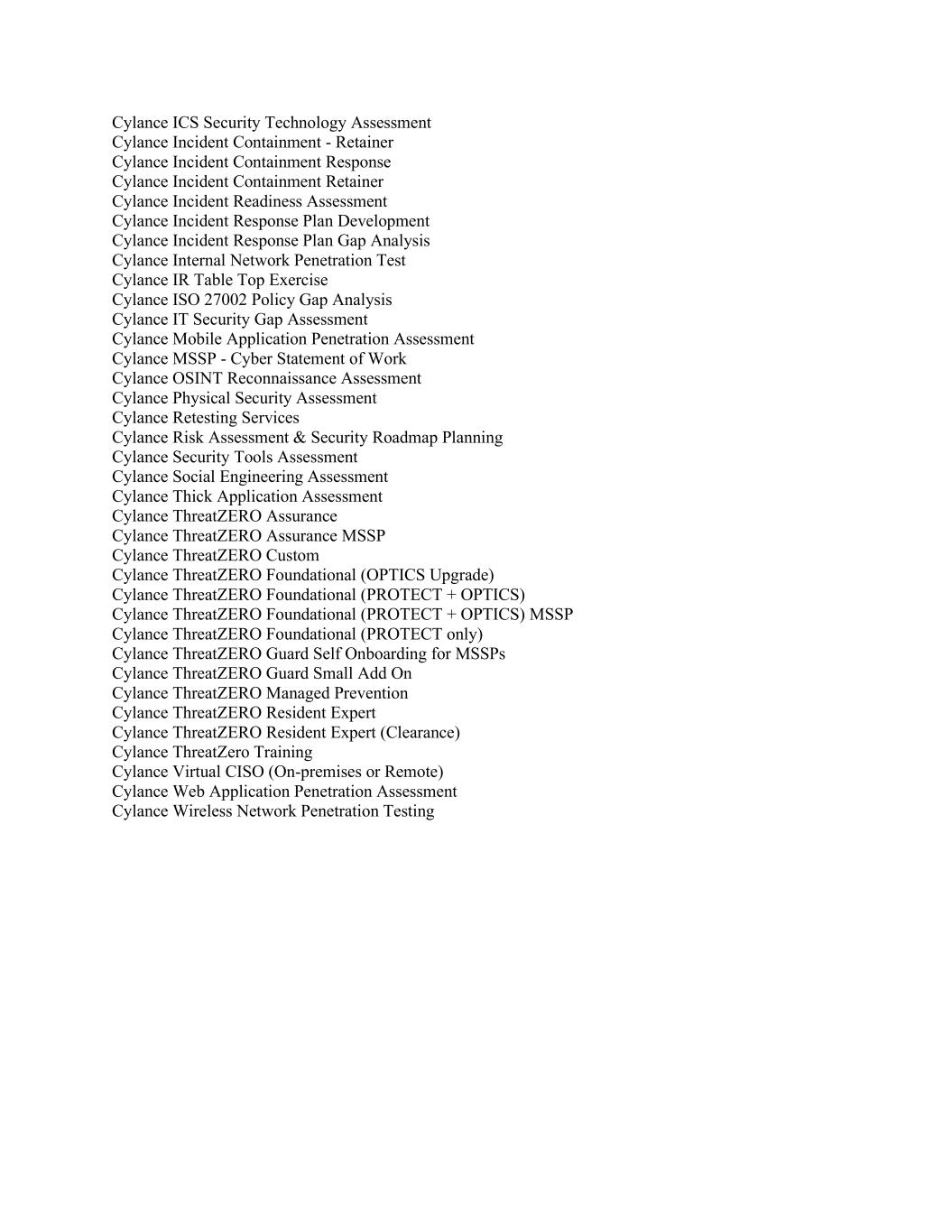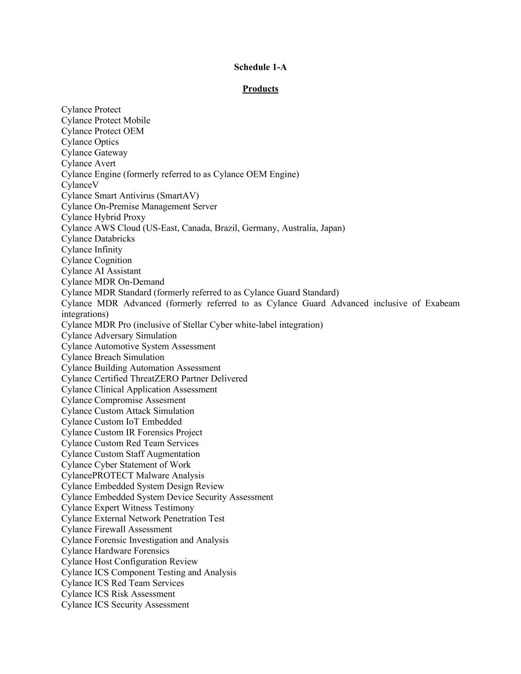 Schedule 1-A Products Cylance Protect Cylance Protect Mobile Cylance Protect OEM Cylance Optics Cylance Gateway Cylance Avert Cylance Engine (formerly referred to as Cylance OEM Engine) CylanceV Cylance Smart Antivirus (SmartAV) Cylance On-Premise Management Server Cylance Hybrid Proxy Cylance AWS Cloud (US-East, Canada, Brazil, Germany, Australia, Japan) Cylance Databricks Cylance Infinity Cylance Cognition Cylance AI Assistant Cylance MDR On-Demand Cylance MDR Standard (formerly referred to as Cylance Guard Standard) Cylance MDR Advanced (formerly referred to as Cylance Guard Advanced inclusive of Exabeam integrations) Cylance MDR Pro (inclusive of Stellar Cyber white-label integration) Cylance Adversary Simulation Cylance Automotive System Assessment Cylance Breach Simulation Cylance Building Automation Assessment Cylance Certified ThreatZERO Partner Delivered Cylance Clinical Application Assessment Cylance Compromise Assesment Cylance Custom Attack Simulation Cylance Custom IoT Embedded Cylance Custom IR Forensics Project Cylance Custom Red Team Services Cylance Custom Staff Augmentation Cylance Cyber Statement of Work CylancePROTECT Malware Analysis Cylance Embedded System Design Review Cylance Embedded System Device Security Assessment Cylance Expert Witness Testimony Cylance External Network Penetration Test Cylance Firewall Assessment Cylance Forensic Investigation and Analysis Cylance Hardware Forensics Cylance Host Configuration Review Cylance ICS Component Testing and Analysis Cylance ICS Red Team Services Cylance ICS Risk Assessment Cylance ICS Security Assessment